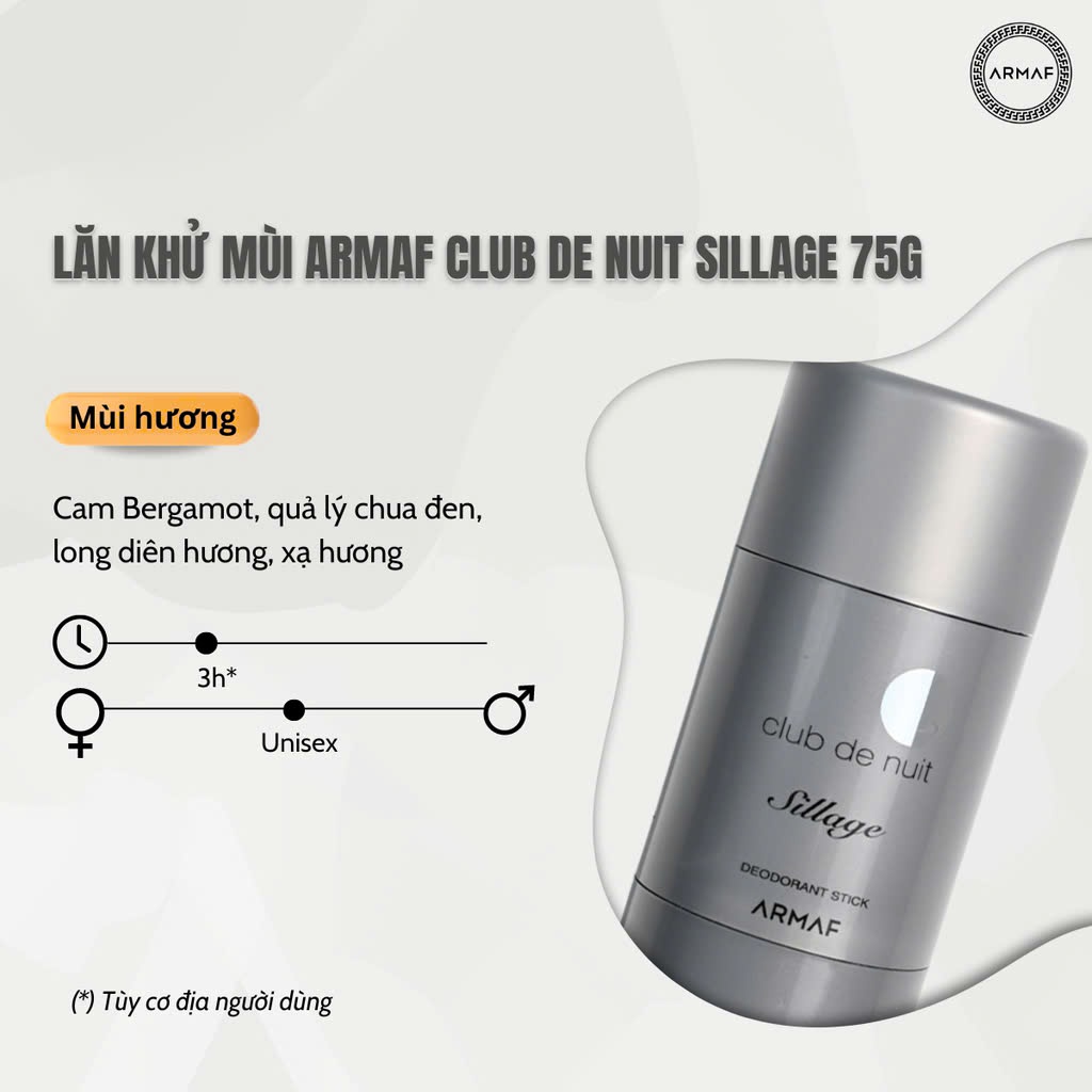 - Lăn Khử Mùi Armaf Club De Nuit Sillage Deodorant Stick là loại lăn khử mùi lấy cảm hứng từ hương nước hoa Armaf Club De Nuit Sillage mở đầu bằng sự pha trộn đầy sinh lực của cam bergamot, nho đen, chanh, chanh, lá tím và gừng, tạo nên sự mở đầu tươi mát, kích thích các giác quan.