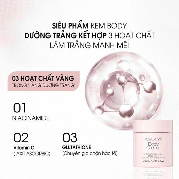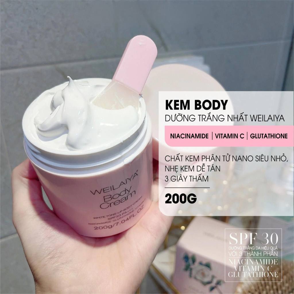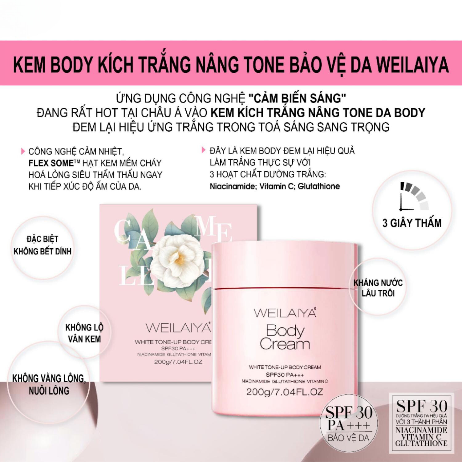 Kem Dưỡng Trắng Body Weilaiya White Tone-Up Body Cream sử dụng công nghệ điều chỉnh màu sắc và cảm biến ánh sáng thông minh x công nghệ thẩm thấu từ tính hiện đại. Sản phẩm kem dưỡng trắng da toàn thân Weilaiya là sự kết hợp tinh tế giữa công nghệ tiên tiến và những thành phần tự nhiên quý giá.Chất kem siêu mềm mịn, thấm nhanh không để lại nhờn rít chắc chắn khiến chị em hài lòng.