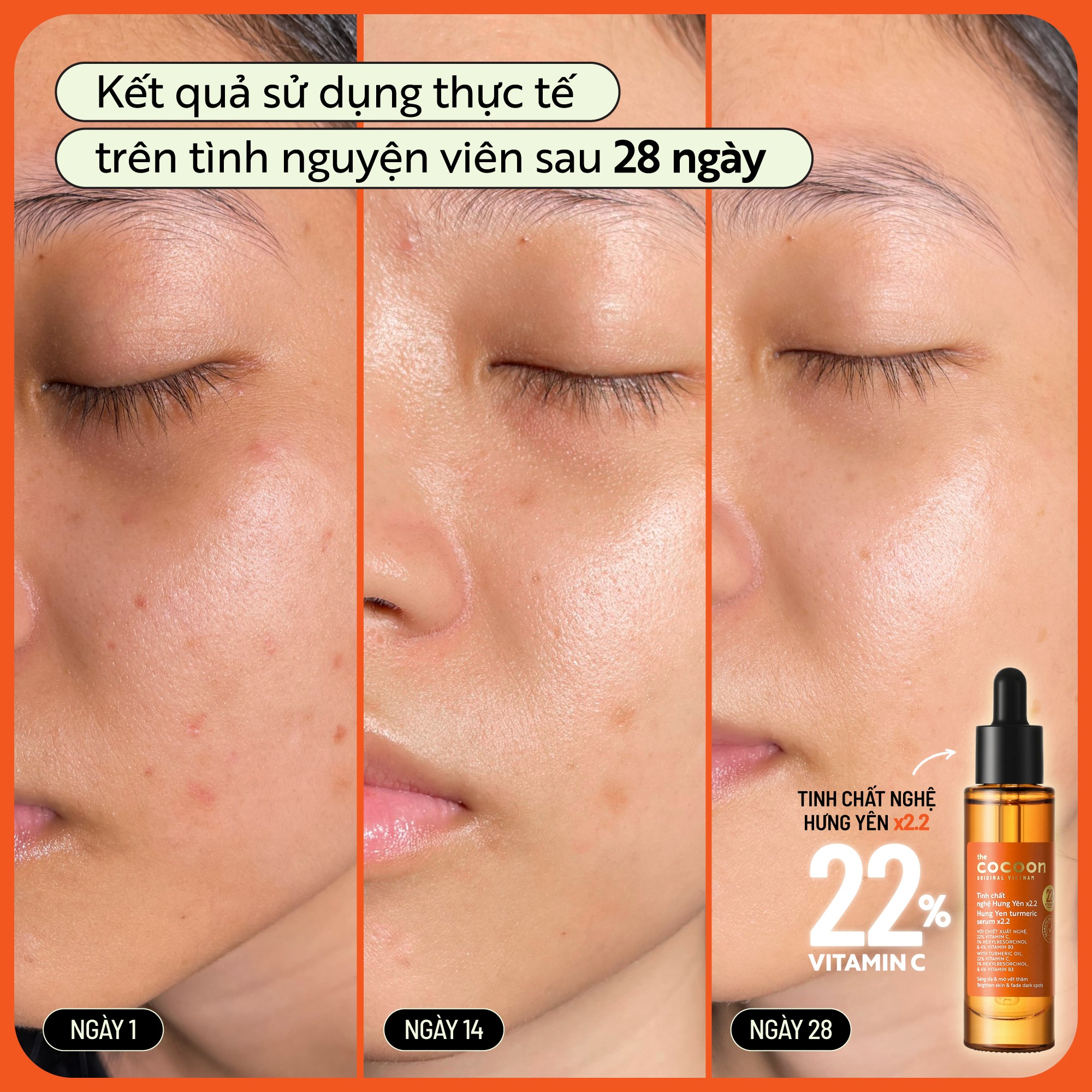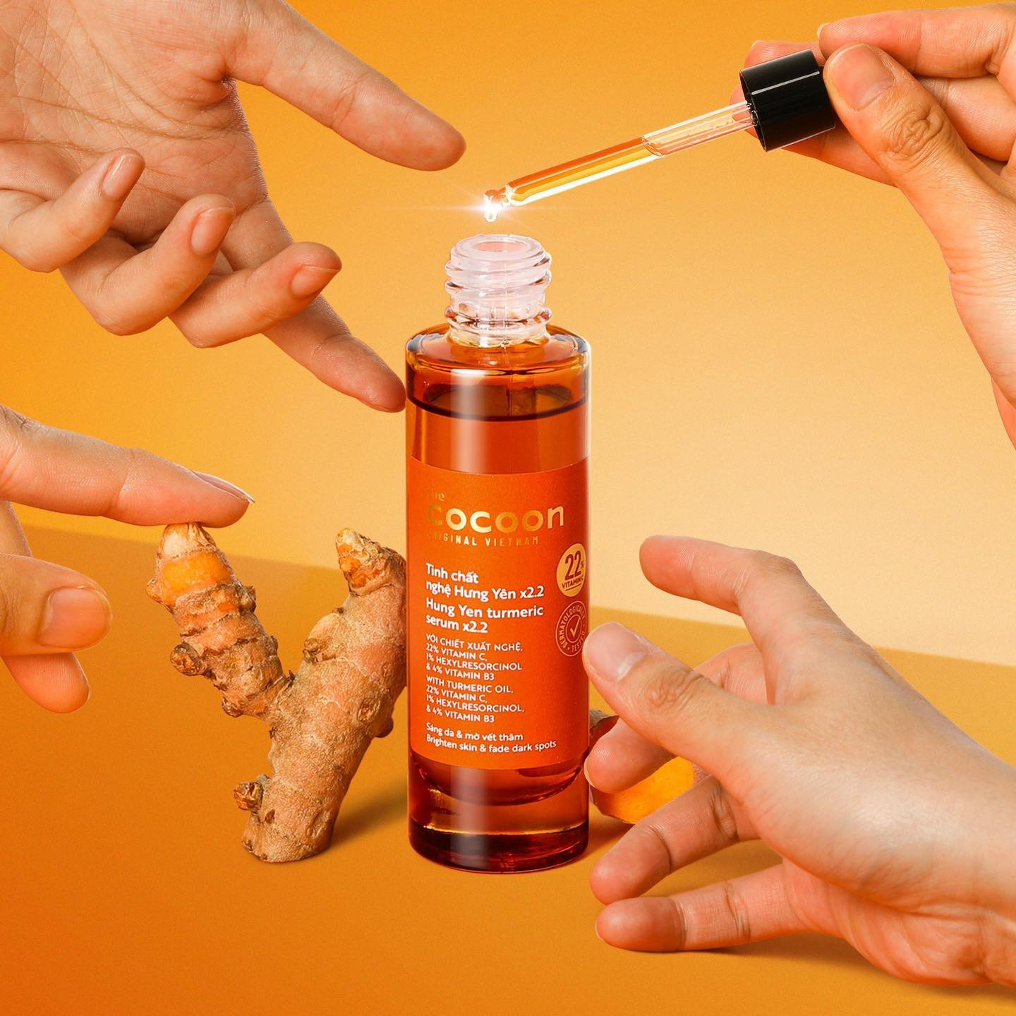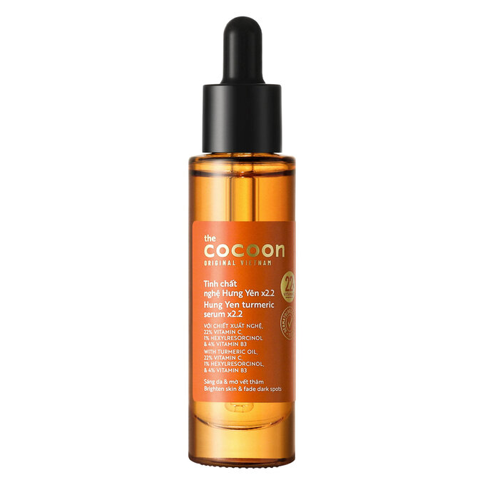 Tinh Chất Chiết Xuất Nghệ Hưng Yên Cocoon Hung Yen Turmeric Serum x2.2 Vitamin C là tinh chất với chiết xuất nghệ Hưng Yên cùng các thành phần hoạt tính gồm 22% dẫn xuất vitamin C EAA bền vững, 1% hexylresorcinol và 4% vitamin B3 giúp làm sáng da ngăm đen, tối màu, cháy nắng, có tác dụng tốt trên vết thâm đậm và vết thâm đỏ do mụn để lại, giúp da trở nên đều màu và sáng rạng rỡ trông thấy thuộc thương hiệu mỹ phẩm thuần chay Cocoon đến từ Việt Nam.