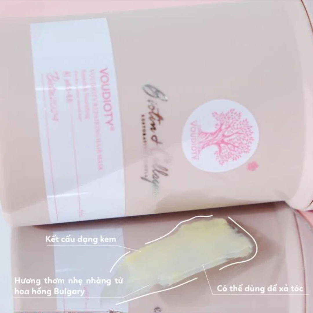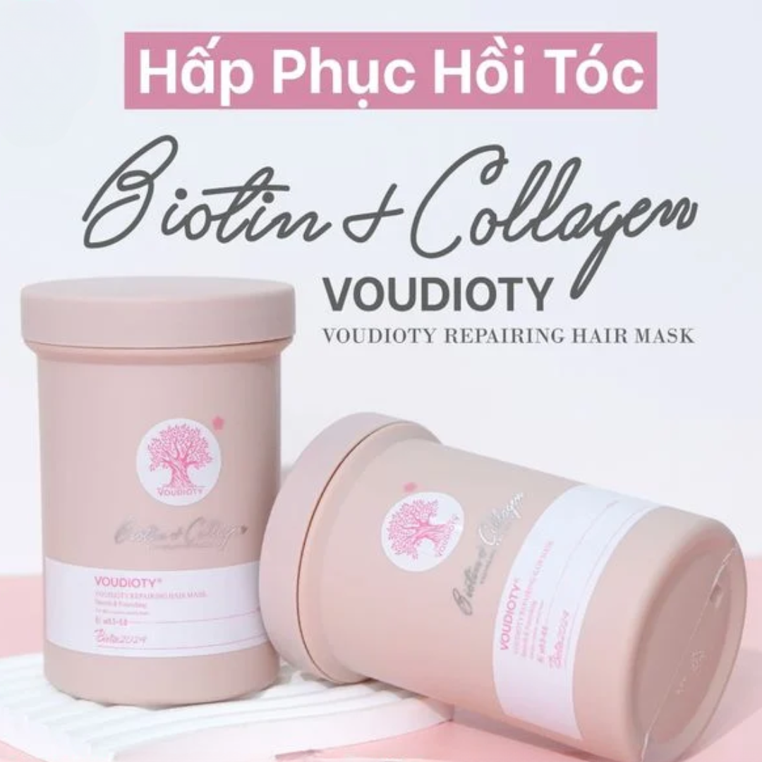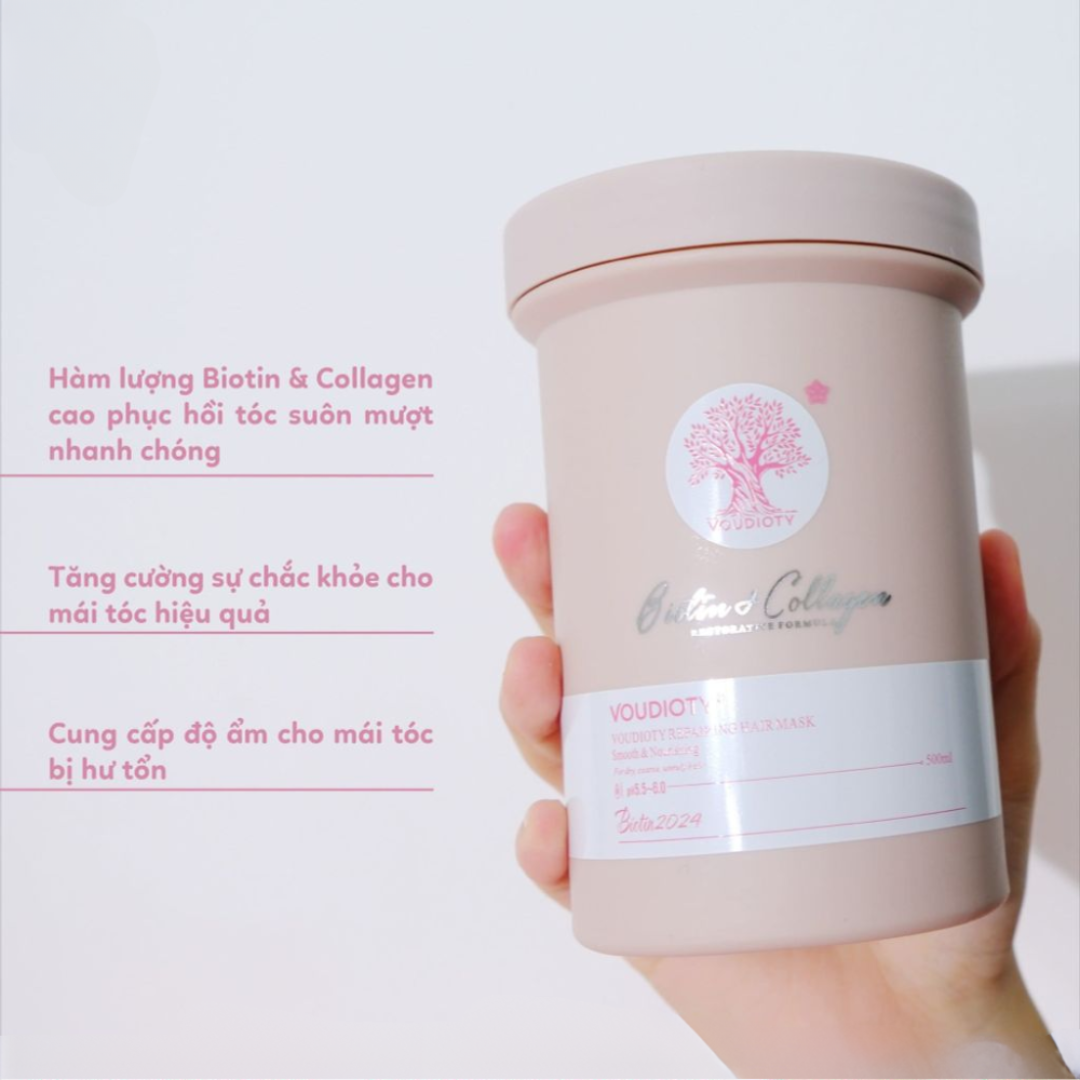 Hấp Tóc Phục Hồi Tái Sinh Tóc Biotin & Collagen Voudioty Repairing Hair Mask 500ml. Dầu Hấp Ủ Tóc Biotin Collagen hũ màu hồng là loại ủ tóc được tạo nên bởi sự kết hợp tuyệt vời giữa Biotin & Collagen mang đến hiệu quả cao trong giảm rụng tóc, hỗ trợ phát triển nang tóc cho mái tóc dày mượt ấn tượng.