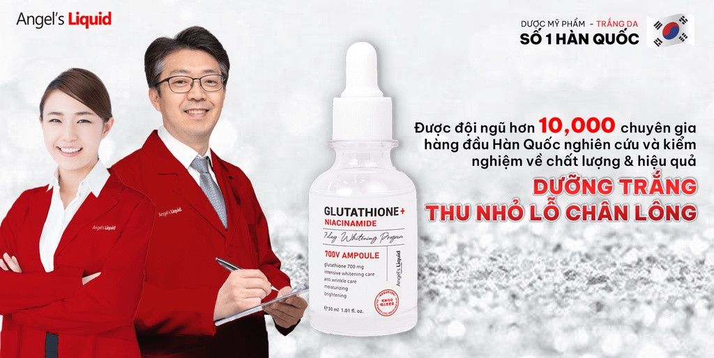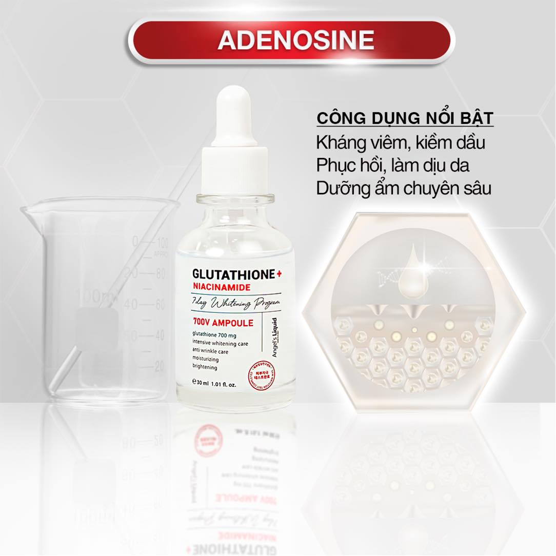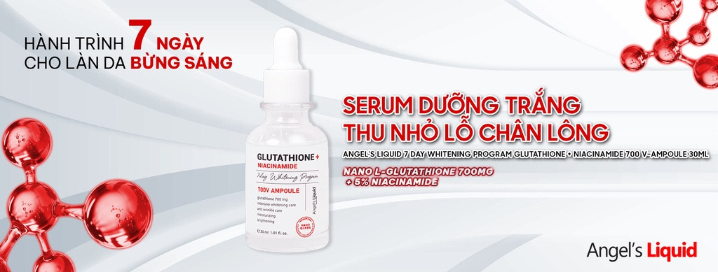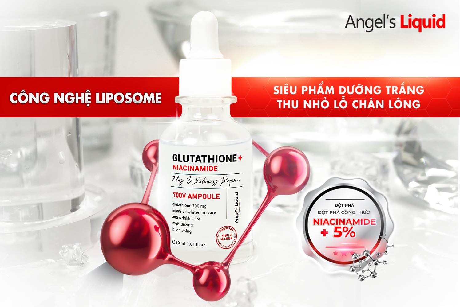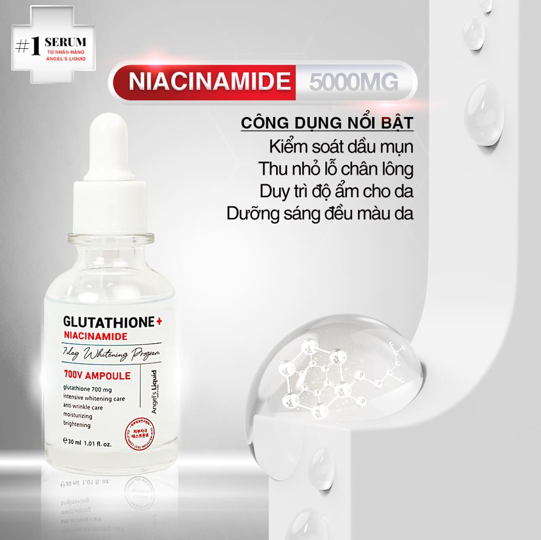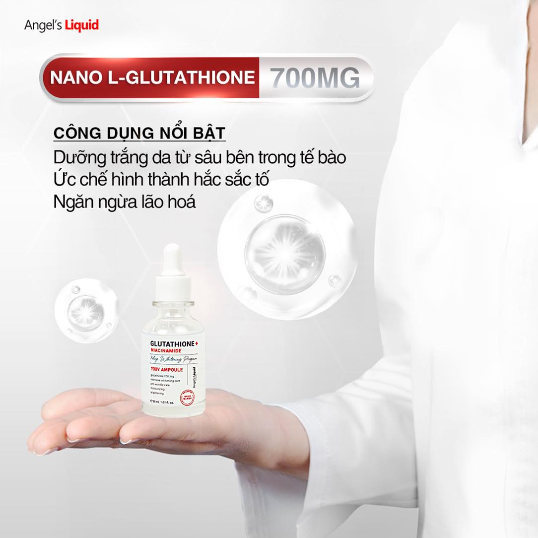 - Tinh Chất Truyền Trắng Trị Nám Chuyên Sâu Angels Liquid Glutathione + Niacinamide 700 V-Ampoule chứa Glutathione có đặc tính bảo vệ mạnh mẽ cho làn da, chống lại các gốc tự do. Glutathione còn được gọi là “bậc thầy” chống oxy hóa, làm sáng da, xóa mờ thâm nám cho làn da vì vậy Glutathione có thể giúp giảm tối đa những tác động của tuổi tác đến là da, giữ cho làn da đẹp theo thời gian