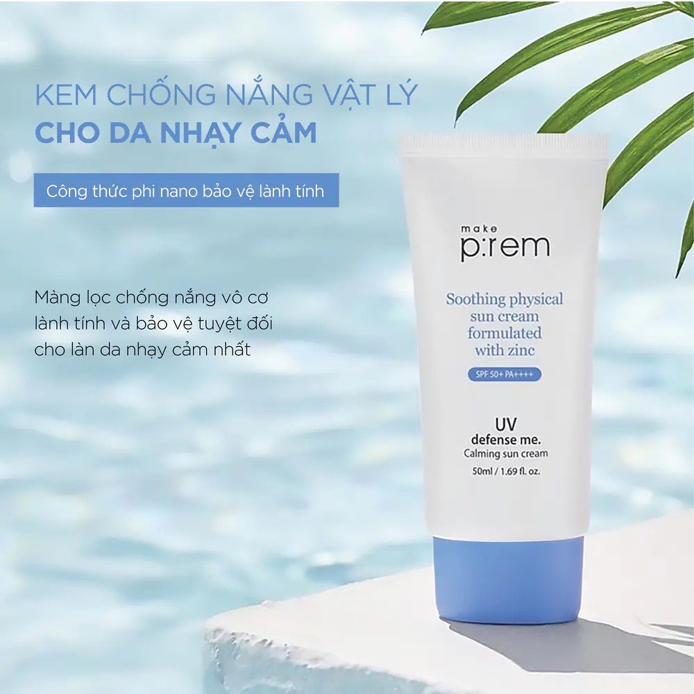 - Make P:rem UV Defense Me Calming Sun Cream SPF50+ PA++++ là dòng kem chống nắng vật lý, cực kỳ lành tính và có khả năng bảo vệ da tuyệt đối. Ngoài tính năng cơ bản là chống lại tác hại từ tia UVA và UVB, Kem Chống Nắng Vật Lý Cho Da Nhạy Cảm Make P:rem UV Defense Me Calming Sun Cream SPF50+ PA++++ còn tăng cường bảo vệ da trước tia hồng ngoại – một trong những nguyên nhân chính gây lão hóa và tổn thương cho da. Đồng thời, sản phẩm còn giúp hạ nhiệt làn da vào những ngày hè oi bức, nóng nực.