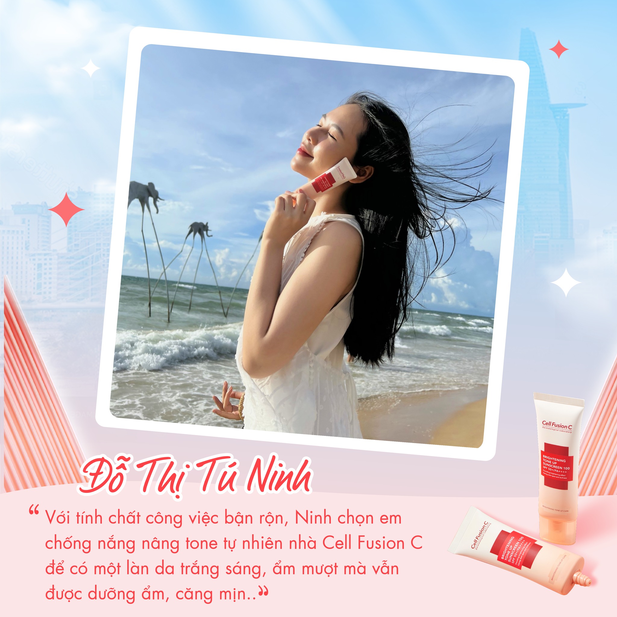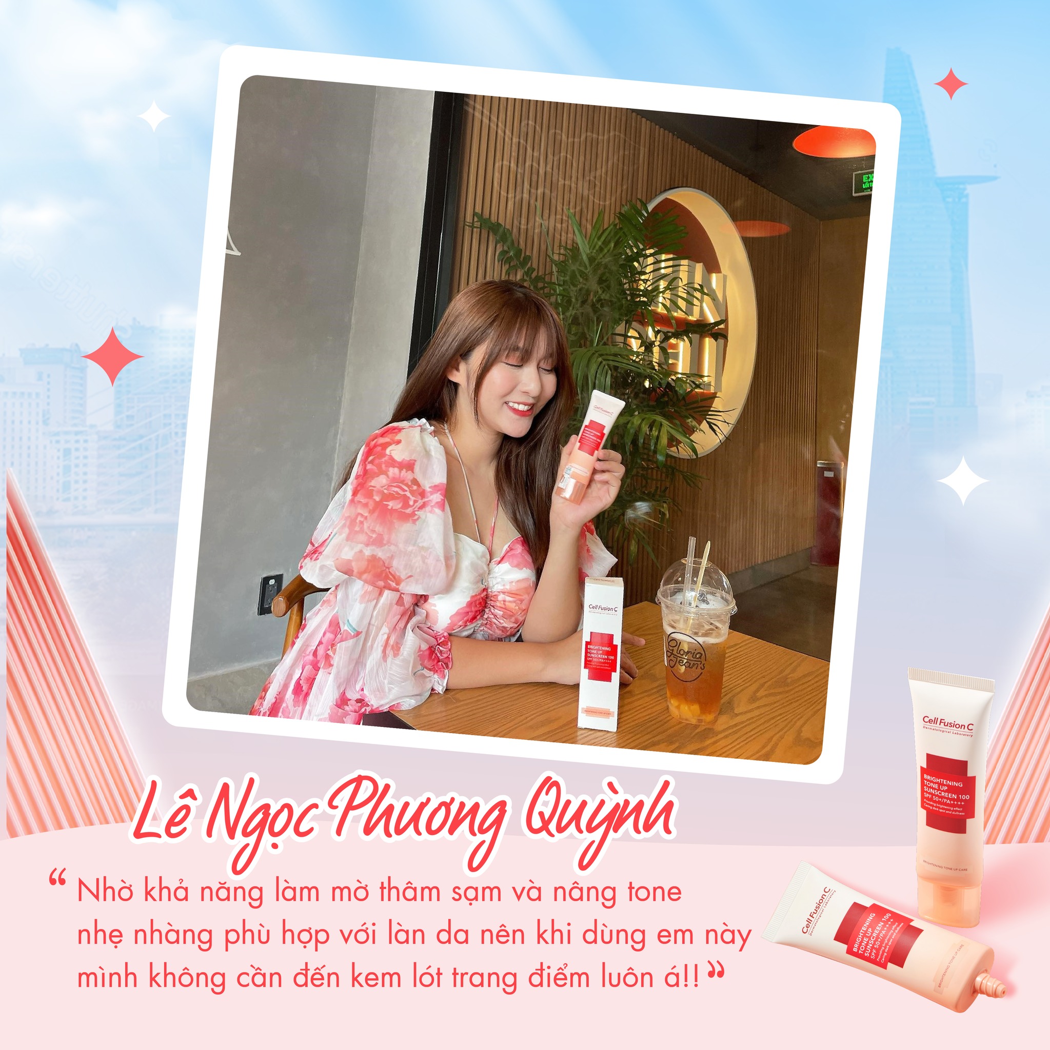 - Kem chống nắng bảo vệ da khỏi tác hại của tia UV (tác nhân gây cháy nắng, sạm nám, không đều màu, lão hóa da), làm mịn, đều màu da, nâng tông da, hỗ trợ cải thiện độ đàn hồi và nếp nhăn. Có thể dùng như kem lót trang điểm.