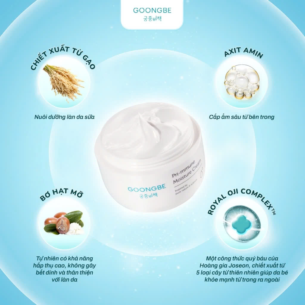 - Kem dưỡng ẩm Goongbe sử dụng thành phần đặc biệt phức hợp Royal Oji Complex - Một công thức quý báu của Hoàng gia Joseon, chiết xuất 5 loại cây từ thiên nhiên giúp da bé hấp thụ hoạt chất tối đa. Sản phẩm được tạo ra bằng cách ép các loại dầu dưỡng ẩm trong năm loại thảo dược độc quyền của Goongbe giúp tăng cường dưỡng ẩm, nuôi dưỡng sâu từ trong ra ngoài & làm dịu làn da mỏng manh của bé.