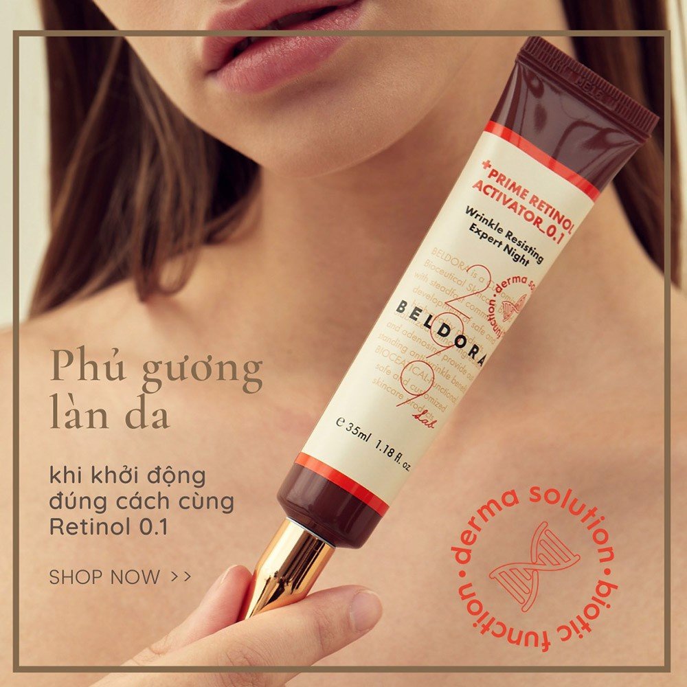 - Kem Dưỡng Retinol Trẻ Hóa Da, Ngăn Ngừa Nếp Nhăn Dành Cho Da Nhạy Cảm Beldora 299 Prime Retinol Activator 0.1 giúp ngăn ngừa và cải thiện nếp nhăn hiệu quả, giúp kết cấu làn da trở nên mịn màng hơn, cung cấp độ ẩm và tăng độ đàn hồi cho da giúp làn da luôn rạng rỡ và tràn đầy sức sống.