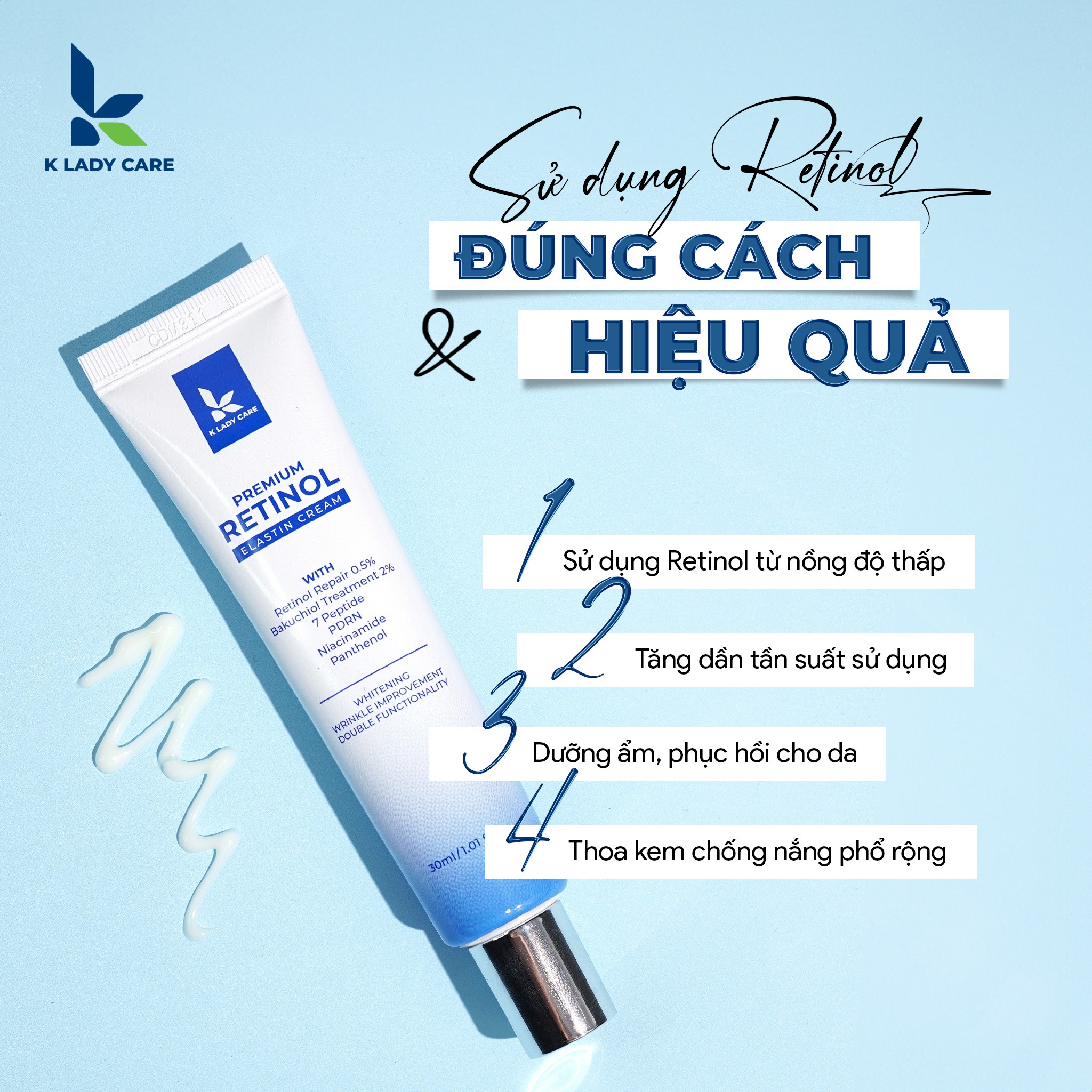 - Kem Dưỡng Tế Bào Gốc Trẻ Hoá PDRN Retinol K Lady Care 0.5% 30ml với thành phần Retinol (dẫn xuất vitamin A) giúp tăng sinh collagen liên kết các tế bào, trung hoà các gốc tự do, đồng thời trị mụn, kháng viêm. Với nồng độ retinol 0.5% không quá "mạnh bạo" để khiến da bong tróc, kích ứng nhưng vẫn "đủ đô" để giải quyết các vấn đề về lão hóa, tình trạng nếp nhăn, da sạm nám, xỉn màu,...