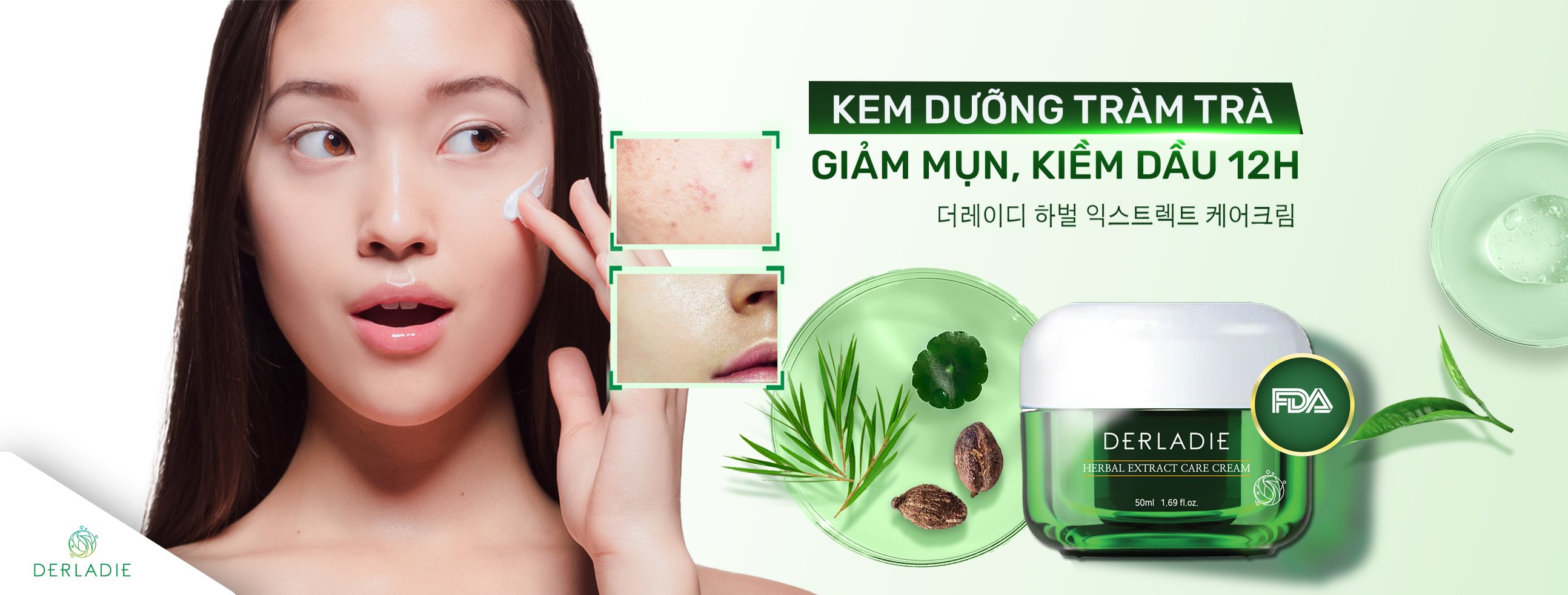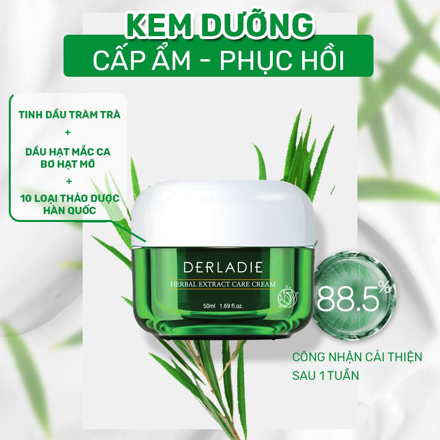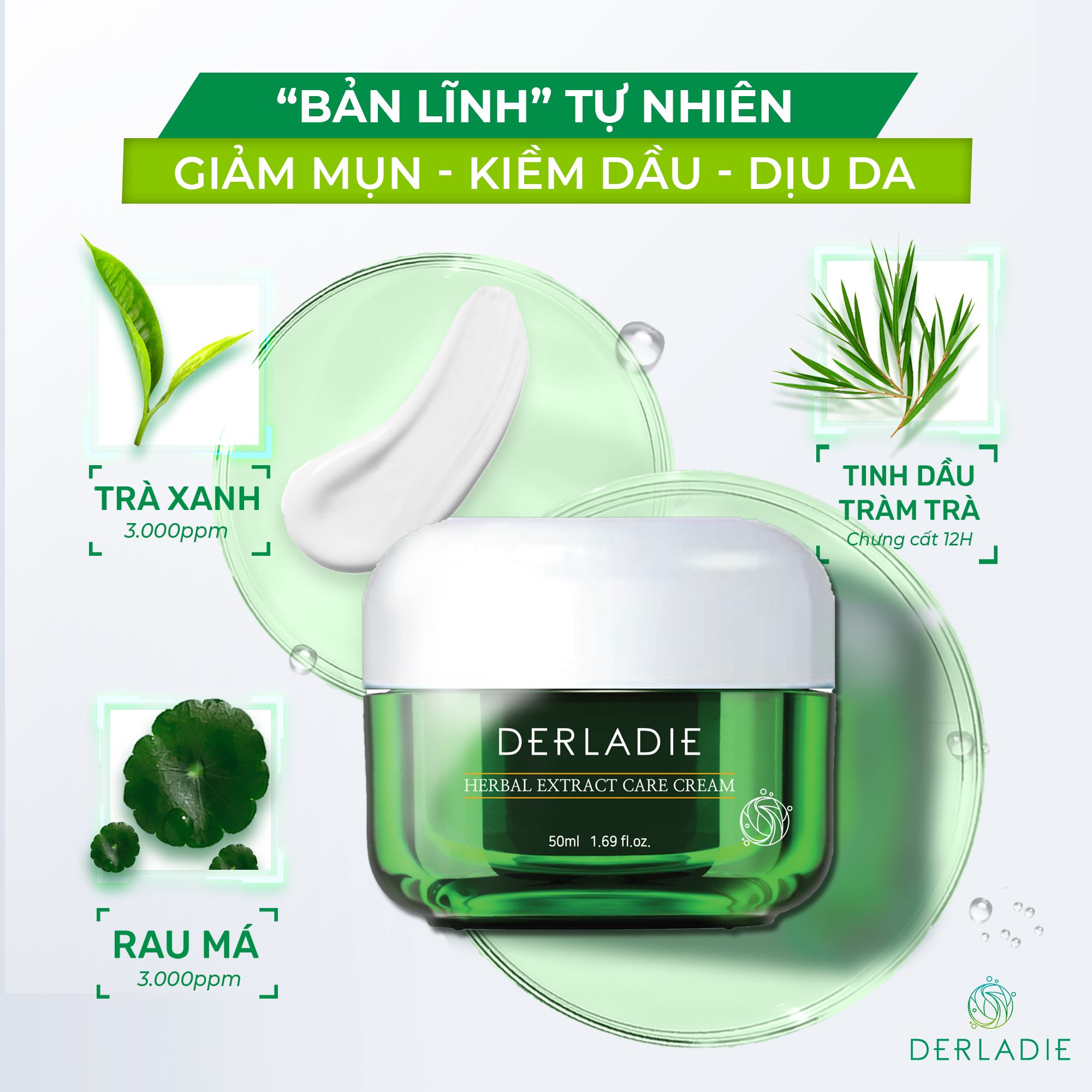 - Kem Dưỡng Giảm Mụn Kiềm Dầu 12H Derladie Herbal Extract Care Cream với công thức thành phần chính chứa tinh dầu tràm trà chưng cất 12h giàu Vitamin và khoáng chất giúp dưỡng ẩm chuyên sâu cho da, hỗ trợ kháng viêm, điều tiết bã nhờn, ngăn ngừa và điều trị các vấn đề về mụn, cải thiện tình trạng viêm da,và làm chậm quá trình hình thành nếp nhăn, bảo vệ da khỏi các tác hại bên ngoài.