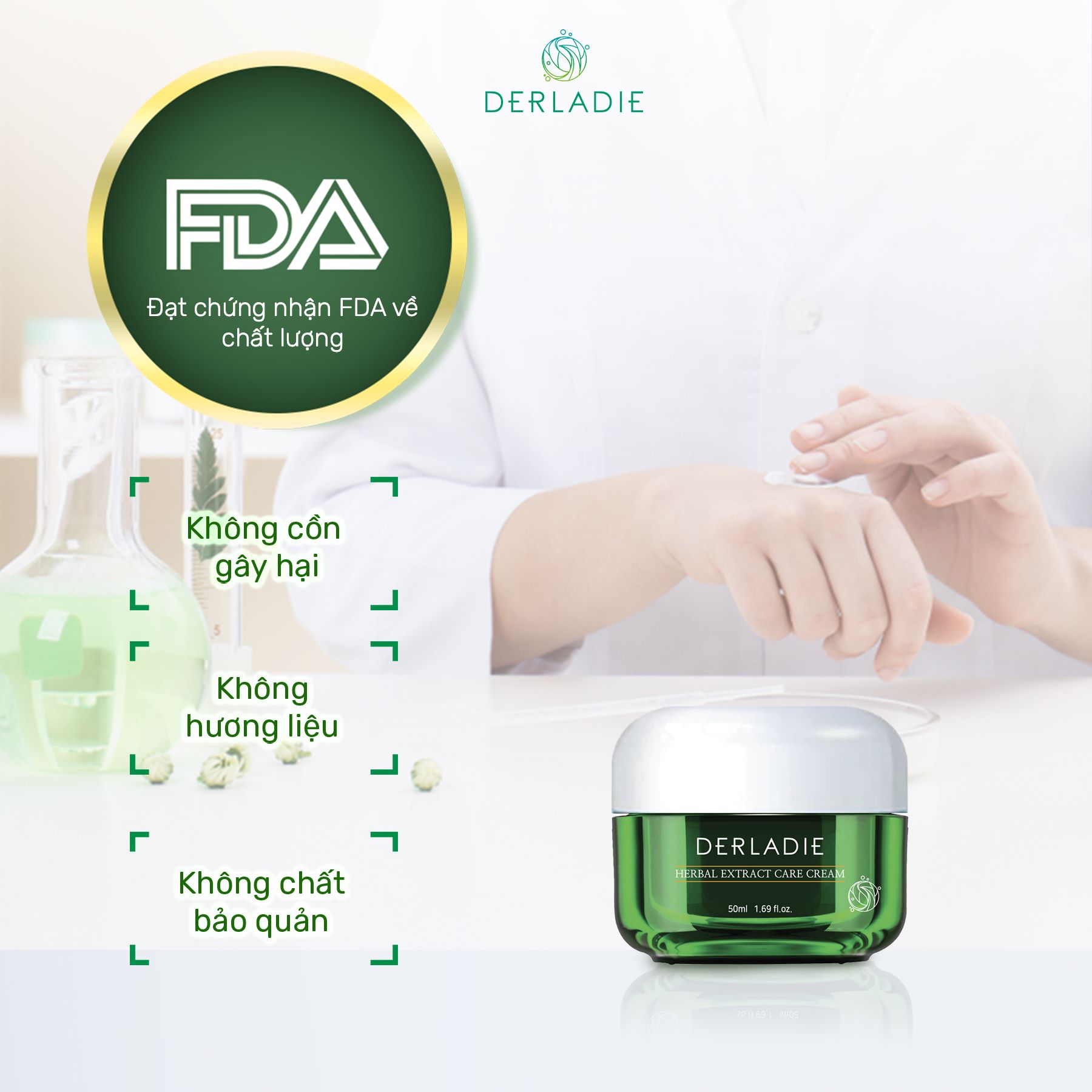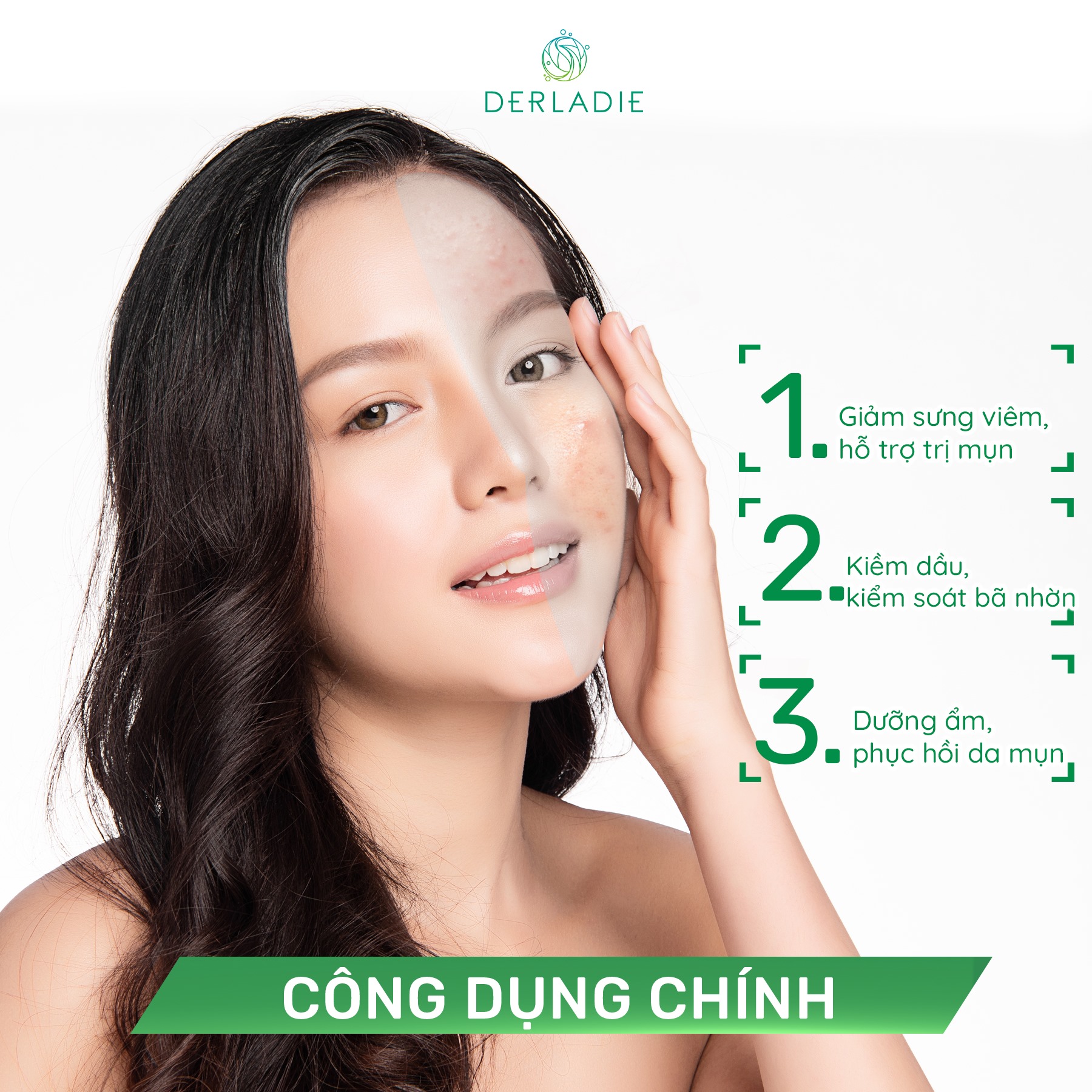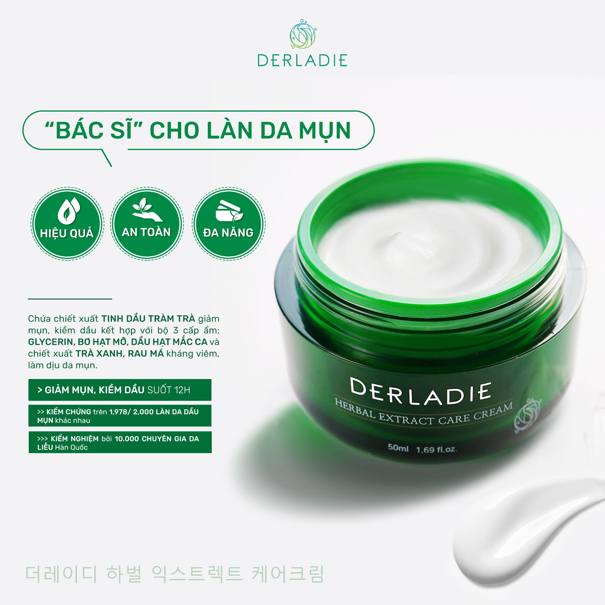 - Kem Dưỡng Giảm Mụn Kiềm Dầu 12H Derladie Herbal Extract Care Cream với công thức thành phần chính chứa tinh dầu tràm trà chưng cất 12h giàu Vitamin và khoáng chất giúp dưỡng ẩm chuyên sâu cho da, hỗ trợ kháng viêm, điều tiết bã nhờn, ngăn ngừa và điều trị các vấn đề về mụn, cải thiện tình trạng viêm da,và làm chậm quá trình hình thành nếp nhăn, bảo vệ da khỏi các tác hại bên ngoài.