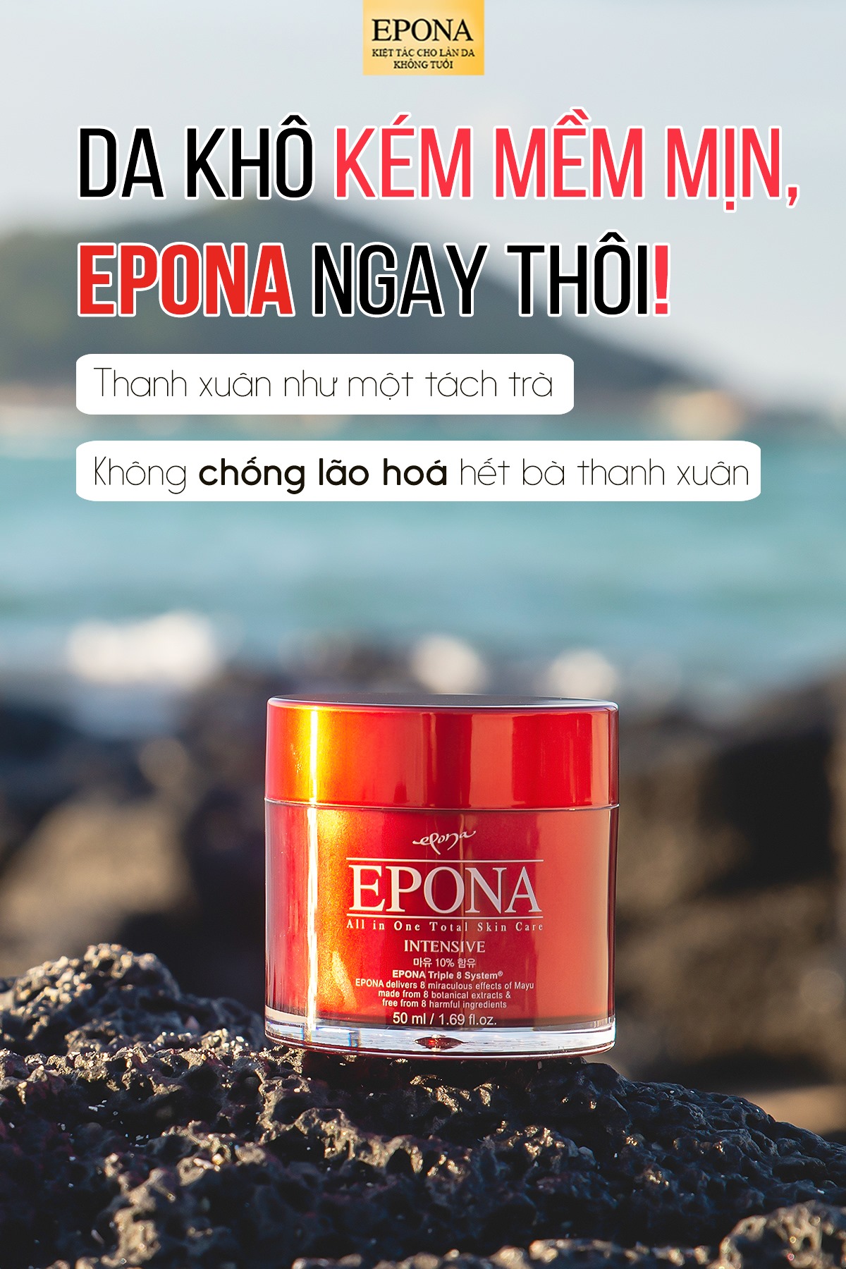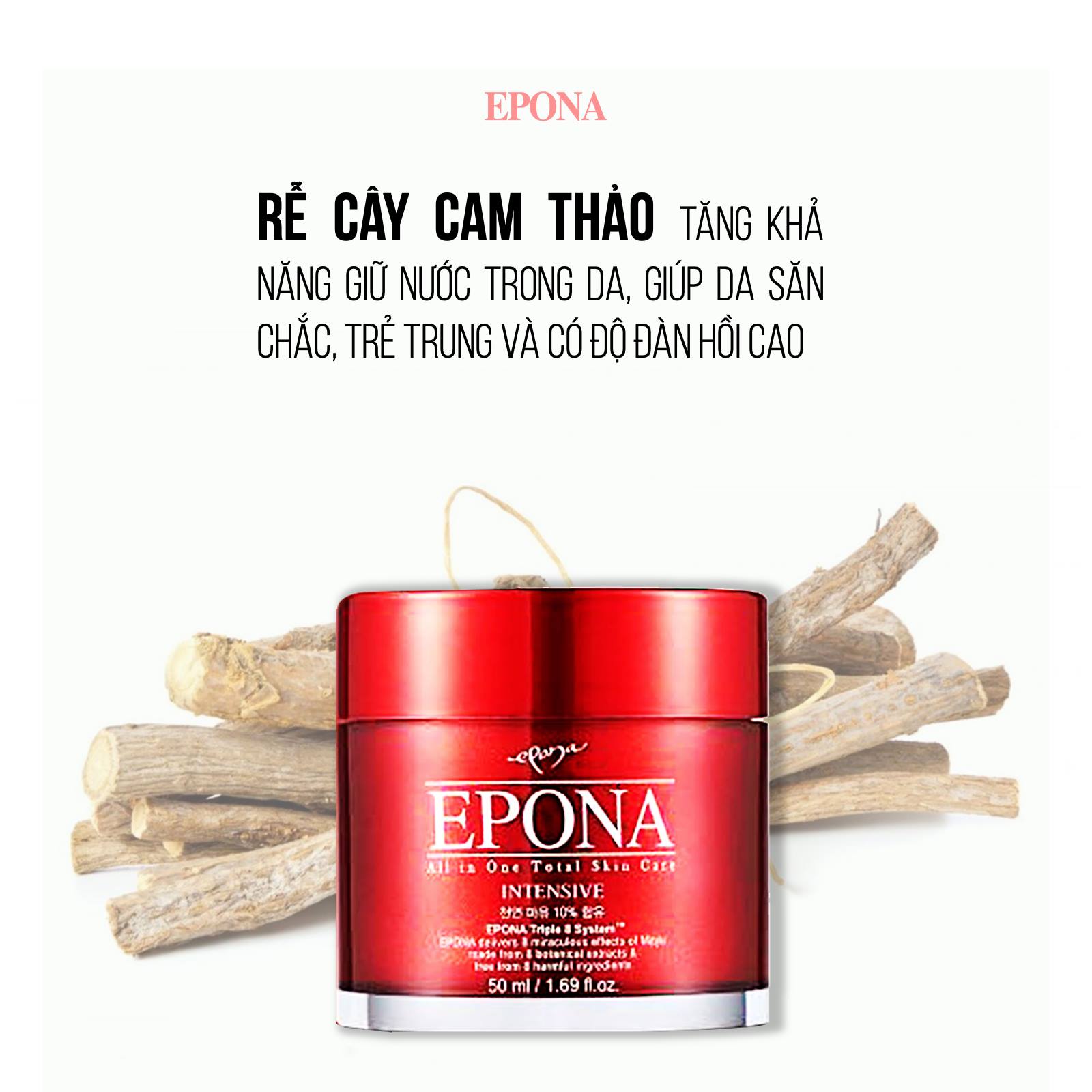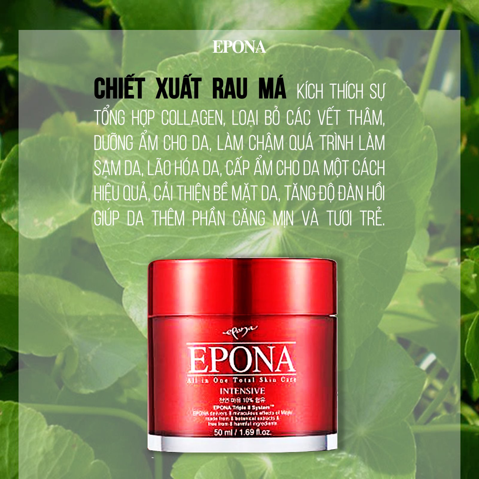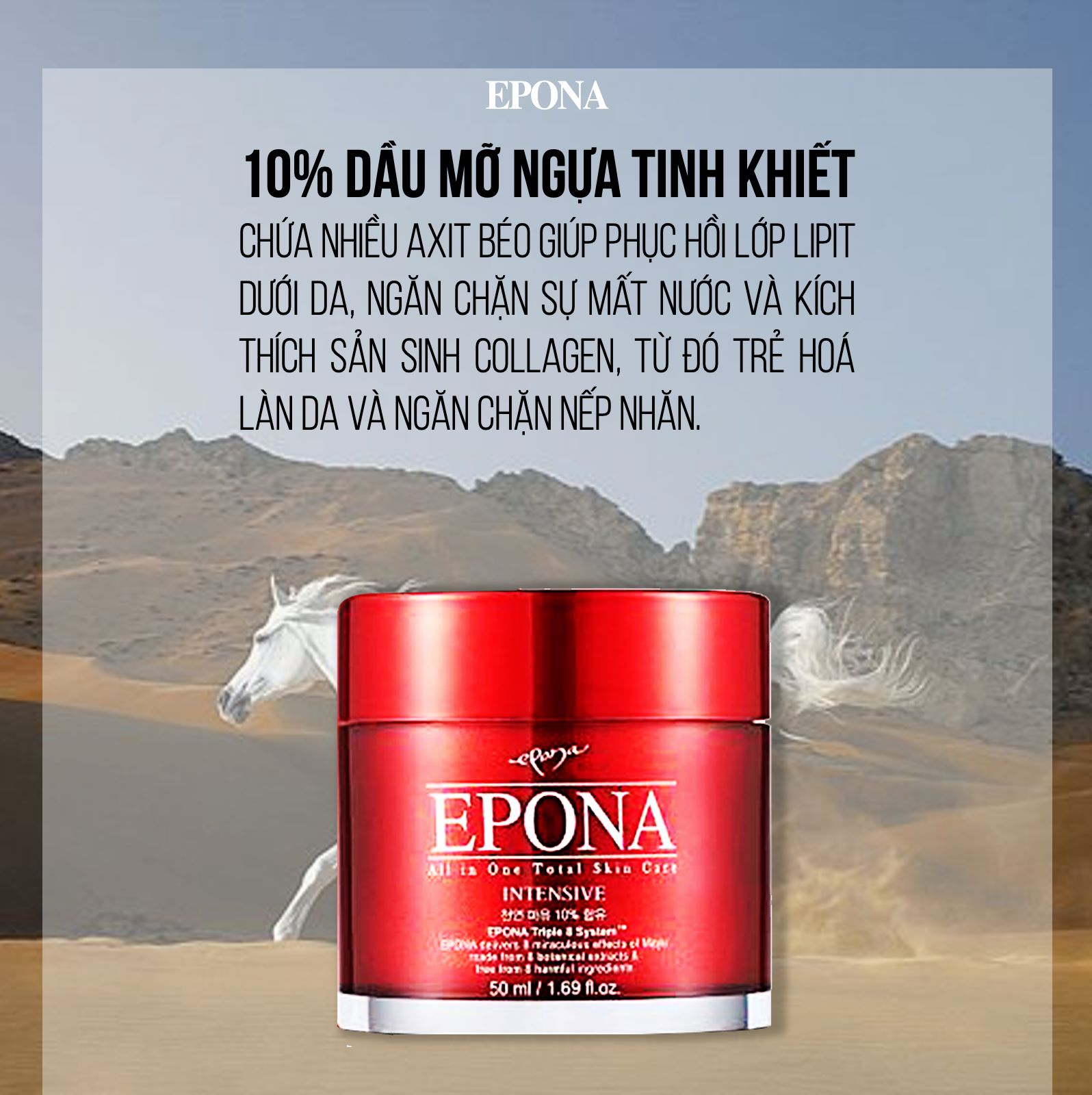 Kem dưỡng da đa chức năng EPONA All-in-one Total Skin Care Intensive là kem dưỡng thuộc thương hiệu EPONA với nghiên cứu nổi trội chứa 10 % chiết xuất mỡ ngựa có khả năng dưỡng ẩm tối đa, giảm kích ứng, chống lão hóa, và tăng độ đàn hồi cho da.