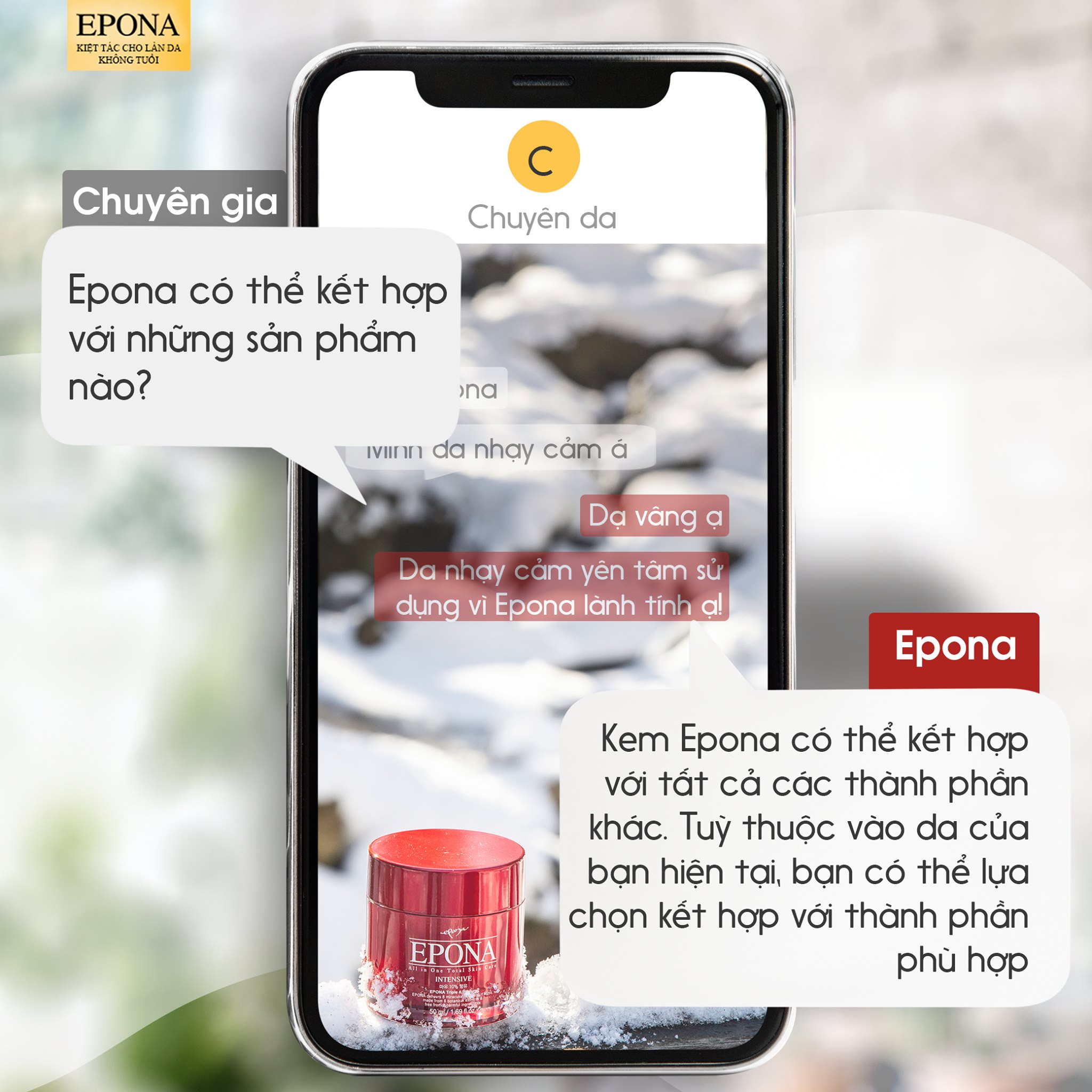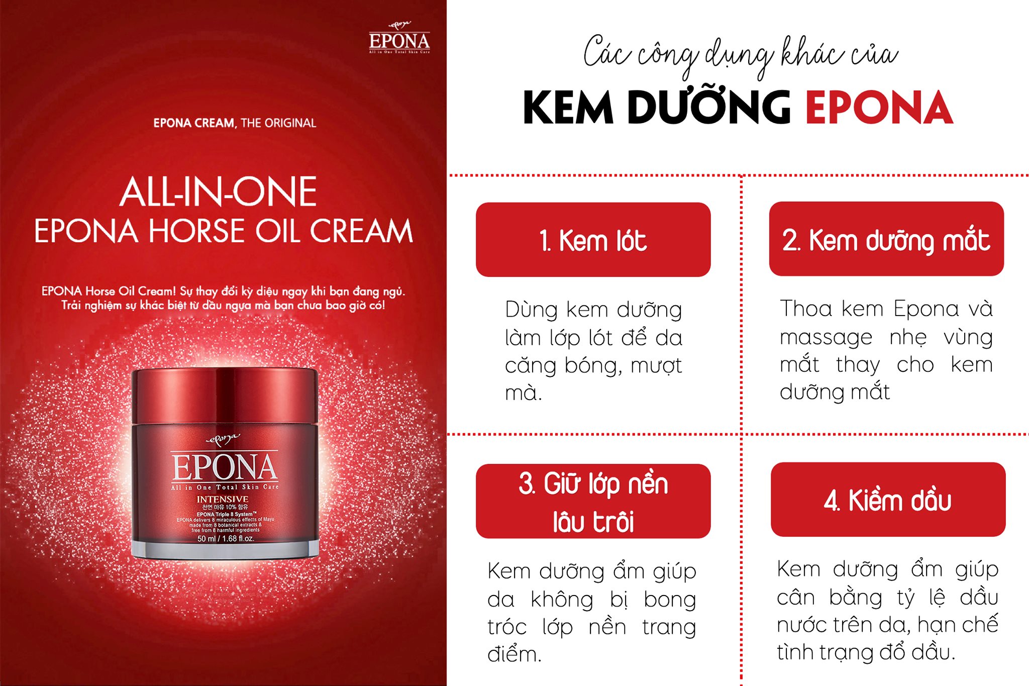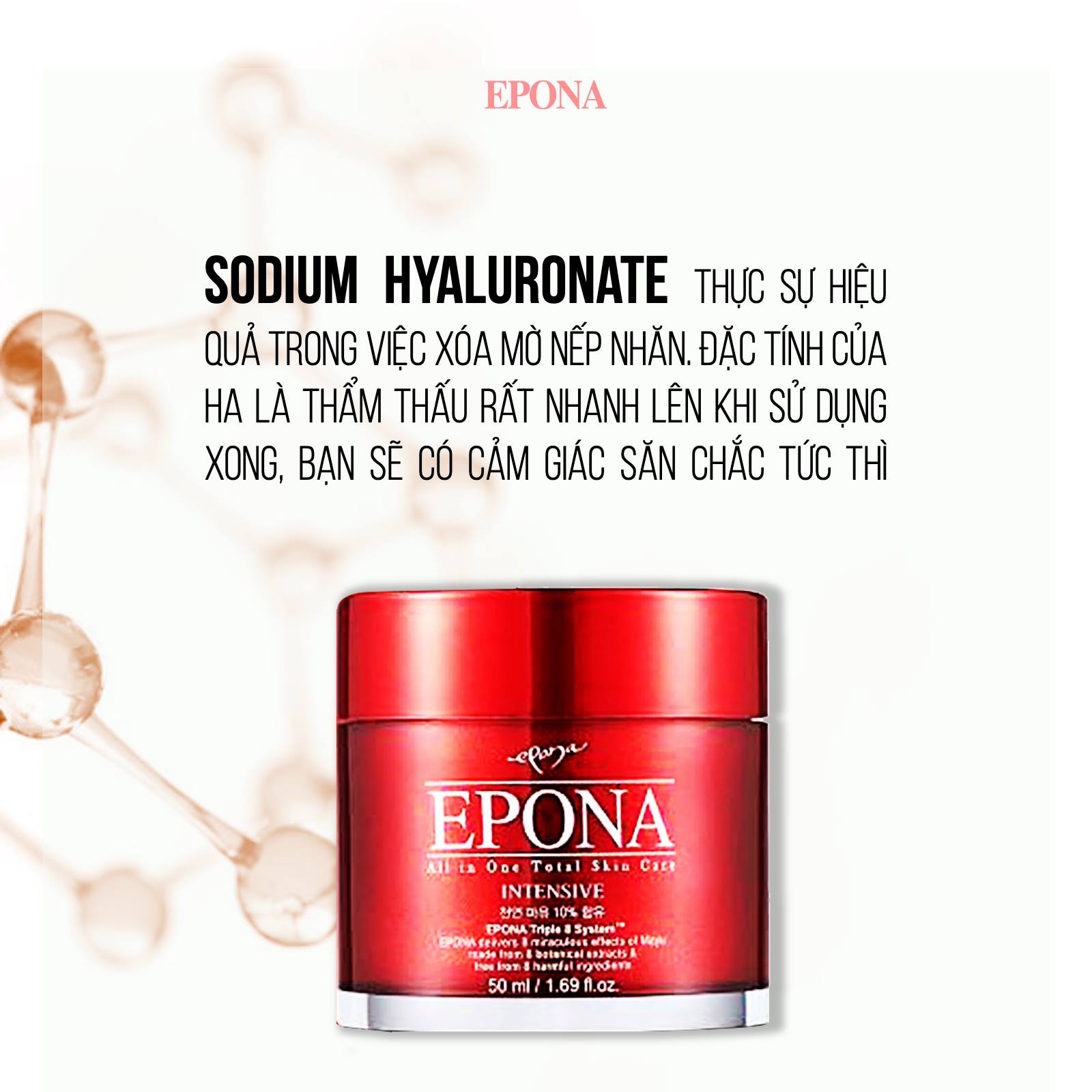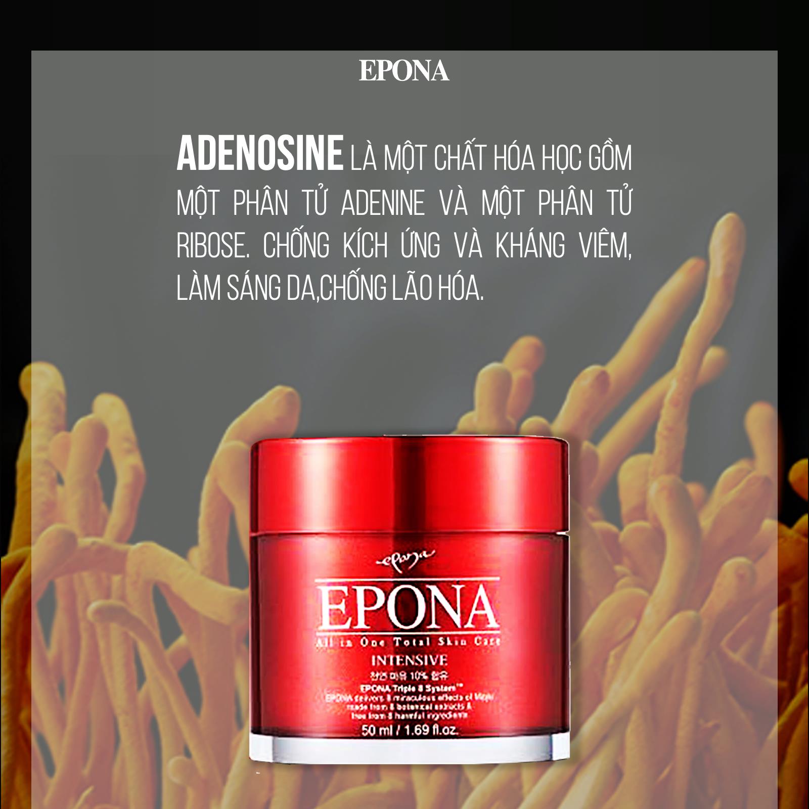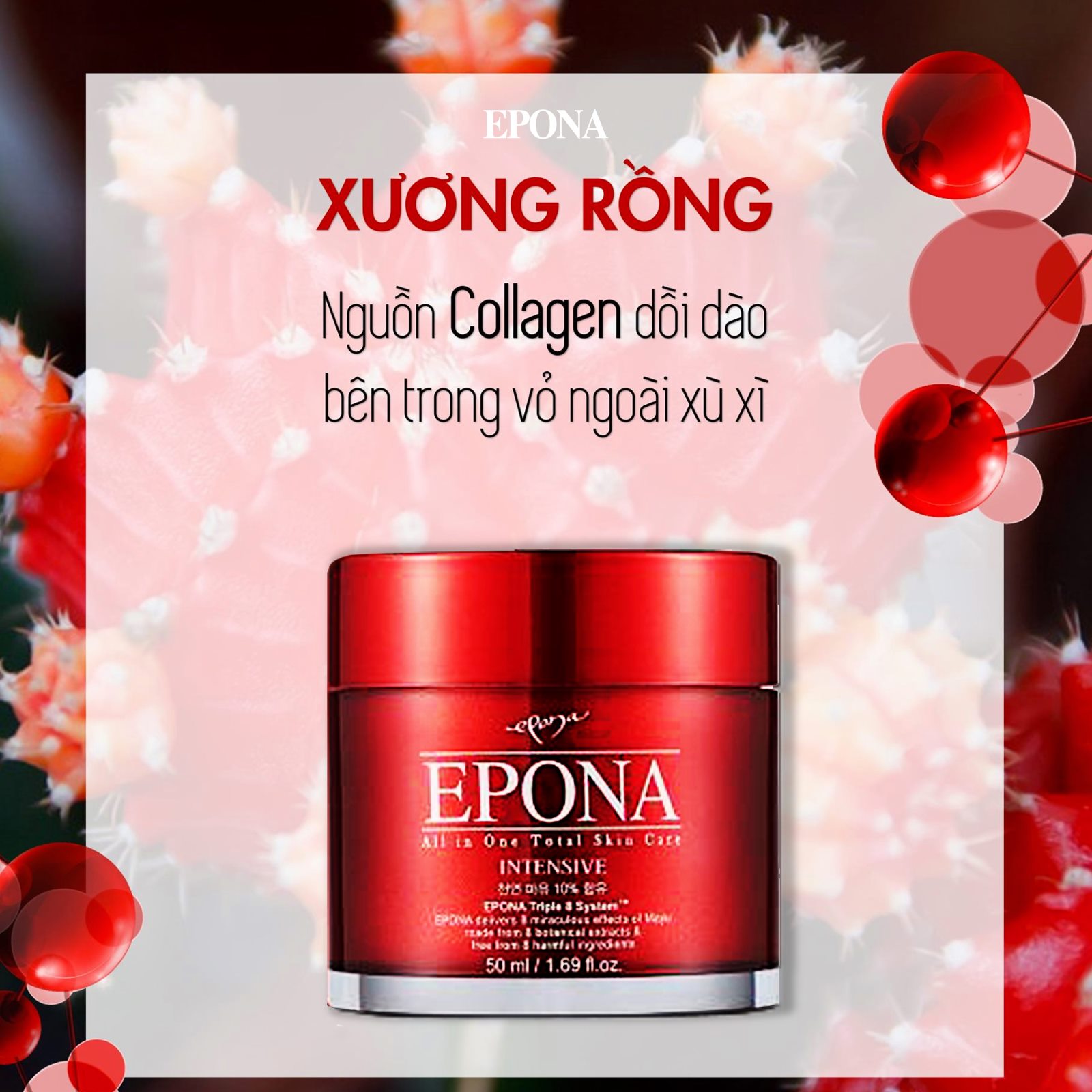 Kem dưỡng da đa chức năng EPONA All-in-one Total Skin Care Intensive là kem dưỡng thuộc thương hiệu EPONA với nghiên cứu nổi trội chứa 10 % chiết xuất mỡ ngựa có khả năng dưỡng ẩm tối đa, giảm kích ứng, chống lão hóa, và tăng độ đàn hồi cho da.
