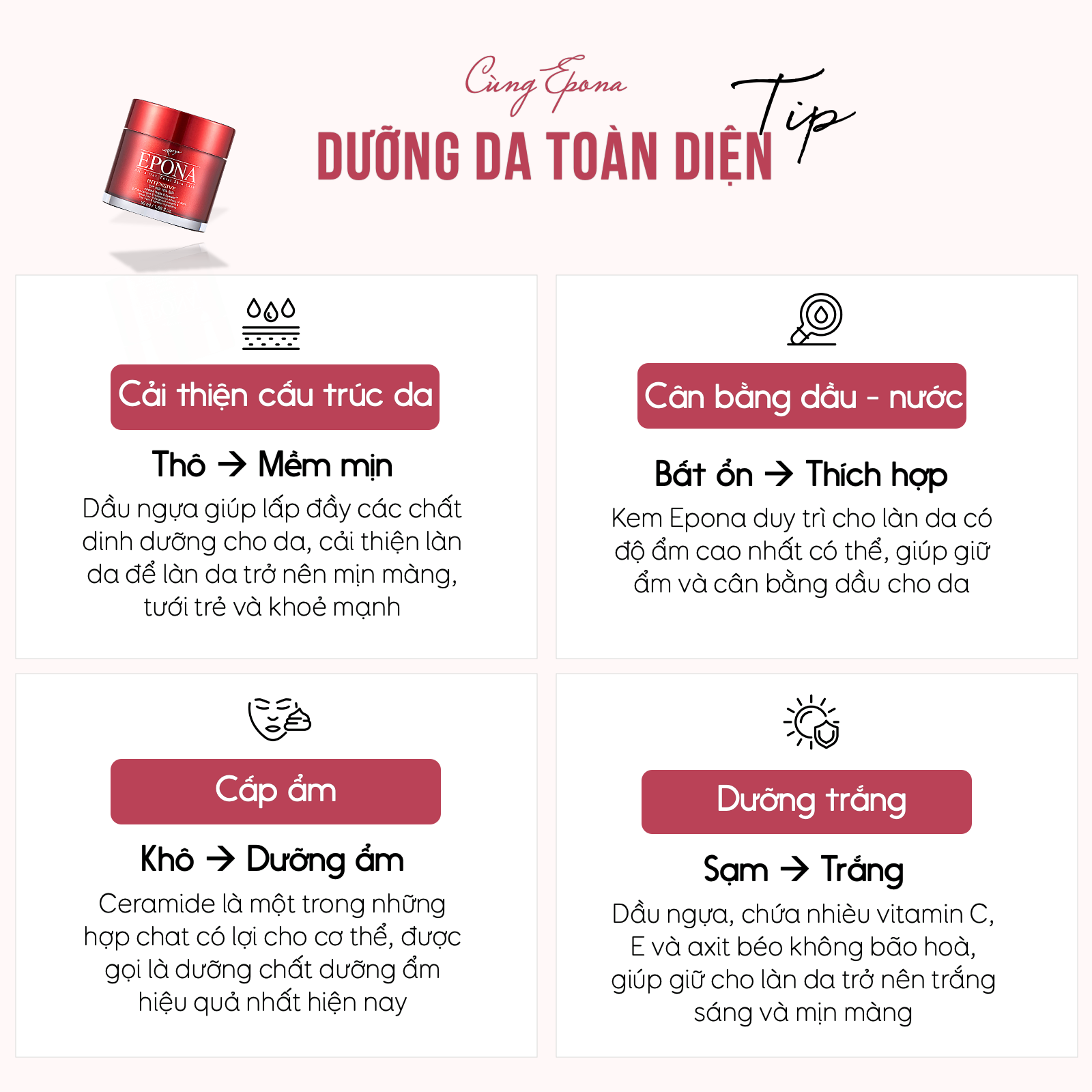 - Kem Dưỡng Da Đa Năng Chống Lão Hóa, Làm Sáng Da Từ Dầu Ngựa Epona All In One Total Skin Care Intensive với nghiên cứu nổi trội chứa 10% chiết xuất mỡ ngựa - 1 trong những đột phá tiên tiến nhất trong ngành làm đẹp chưa từng có trước đây. Dầu mỡ ngựa đã được chứng minh là thành phân dưỡng da thân thiện mà mang lại hiệu quả vô cùng tối ưu đối với phái đẹp. Horse Oil giữ độ ẩm tự nhiên cho da, cung cấp lipid và Ceramide giúp tăng kết cấu da, hai thành phần này rất quan trọng trong việc bảo vệ da từ bên trong, giúp da tránh khỏi các kích ứng từ bên ngoài.