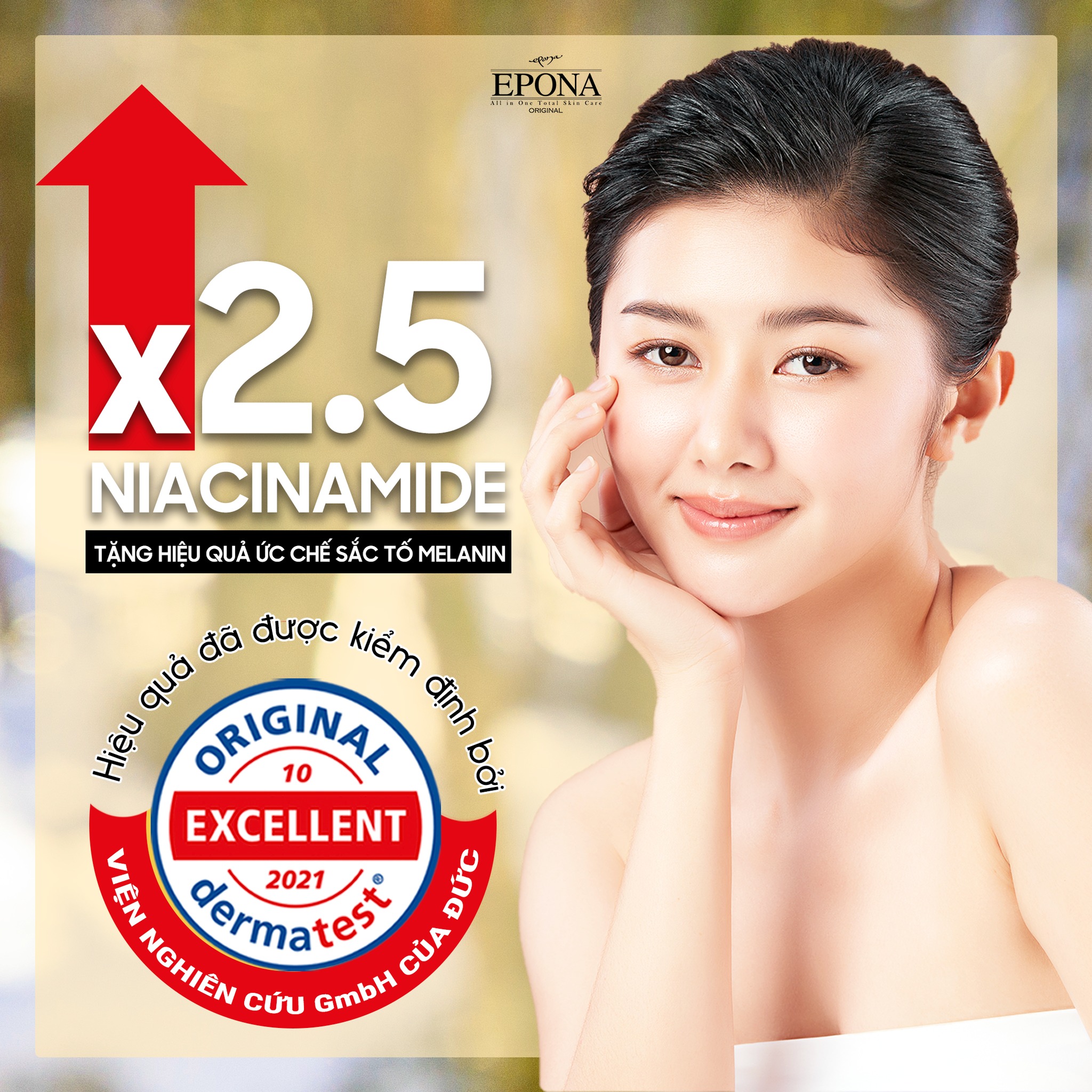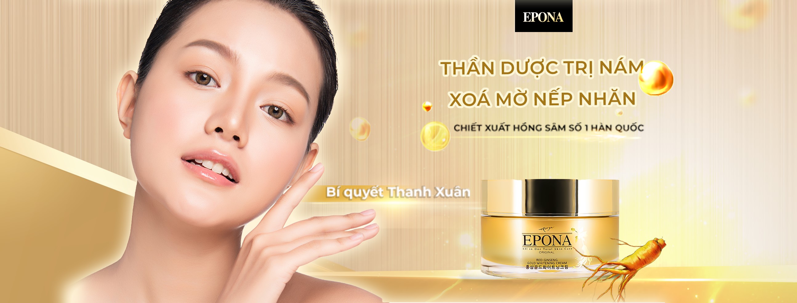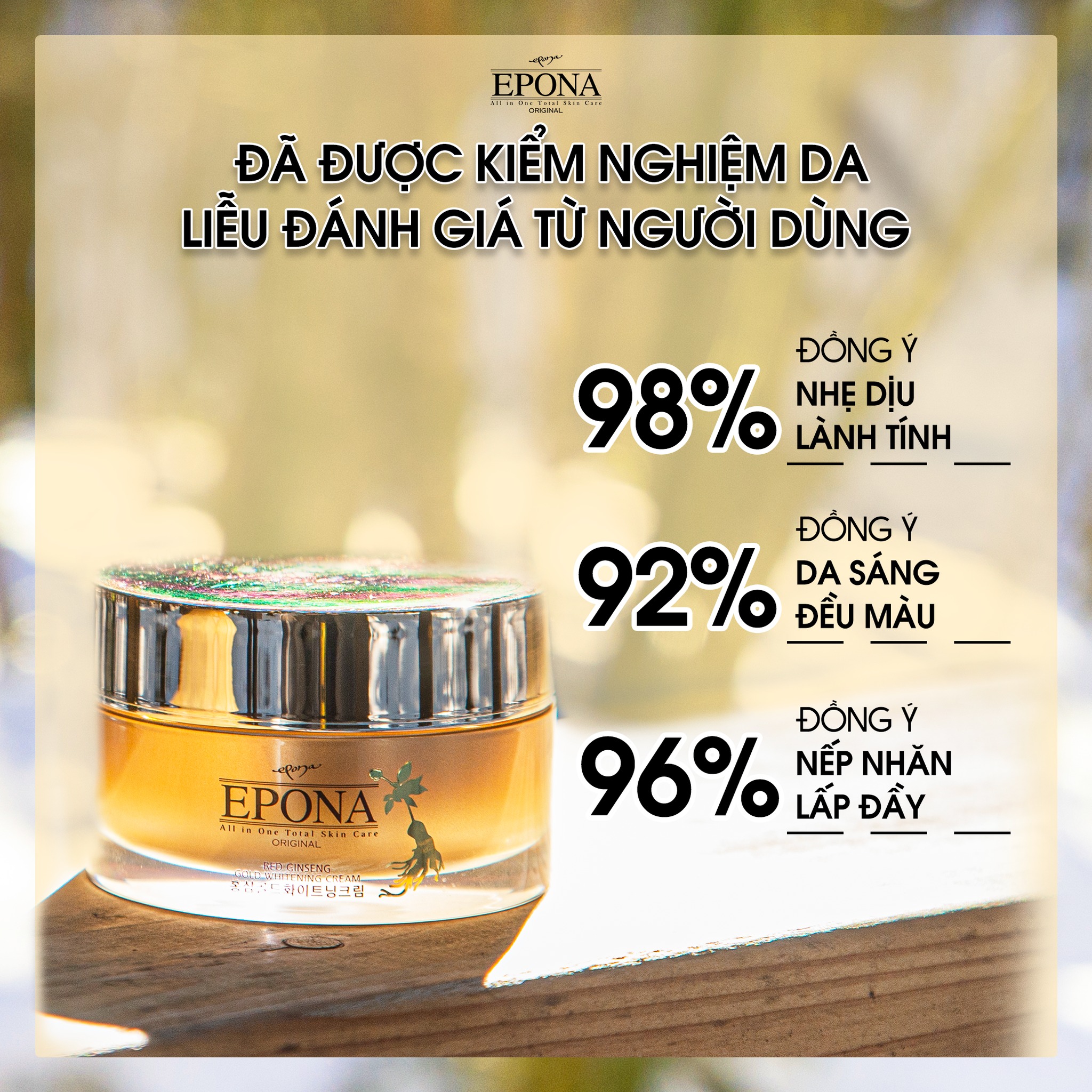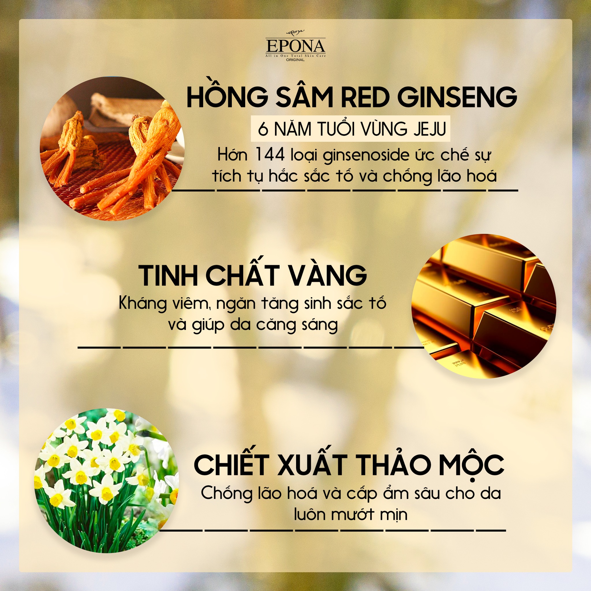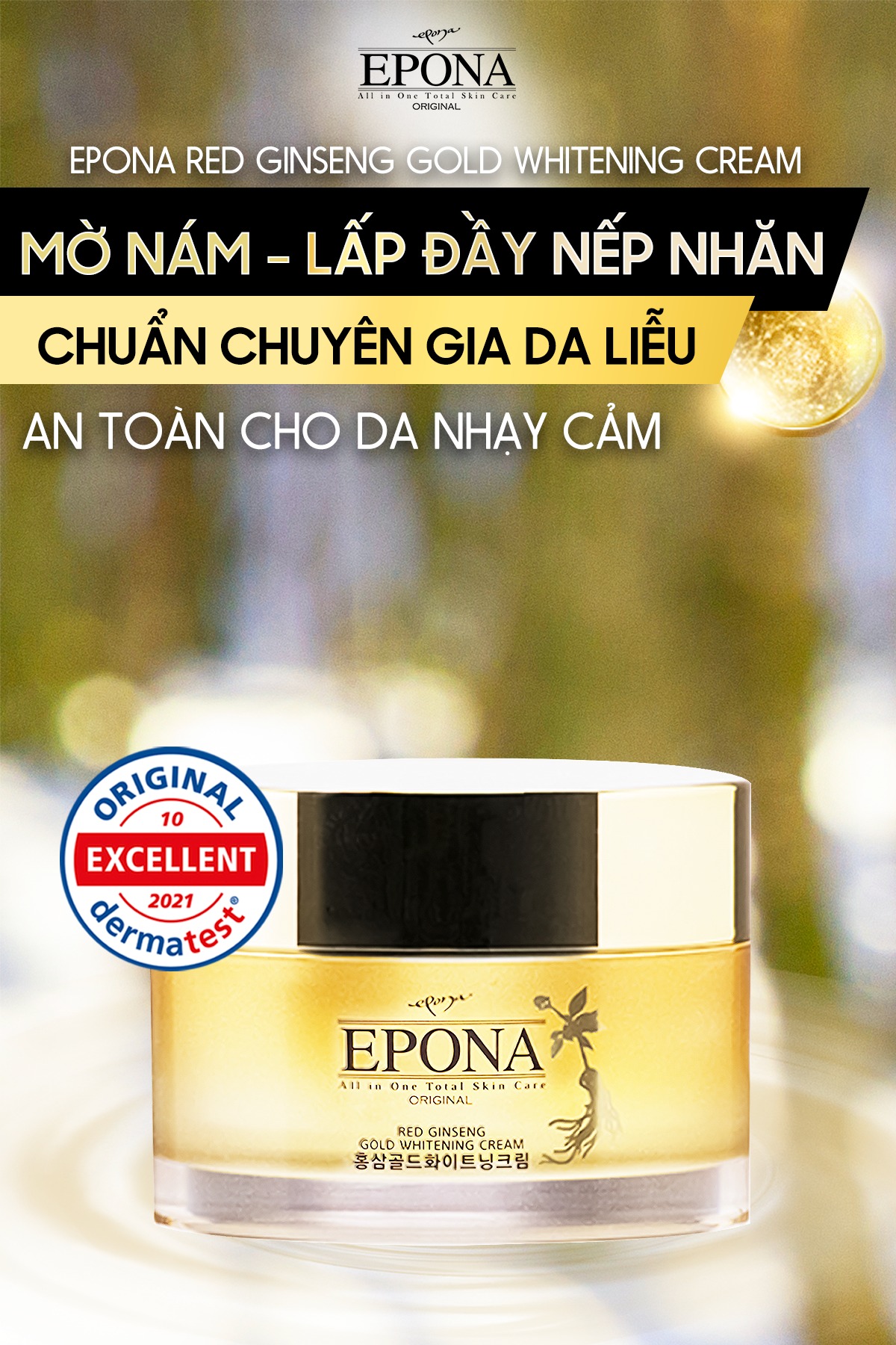 Kem Dưỡng Epona Ngừa Nám, Mờ Nhăn Chiết Xuất Hồng Sâm Red Ginseng Gold Whitening Cream 50ml là dòng kem dưỡng đến từ thương hiệu mỹ phẩm Epona của Hàn Quốc, với chiết xuất chính từ hồng sâm giúp làm mờ các đốm nâu như tàn nhang, nám, đồi mồi,... hiệu quả. Ngoài ra sản phẩm còn chứa các thành phần từ vàng 24K, Hoa Thủy Tiên và Niacinamide giúp cải thiện da tối ưu giúp da căng khỏe, ngăn ngừa tình trạng nếp nhăn, lão hóa trên da.