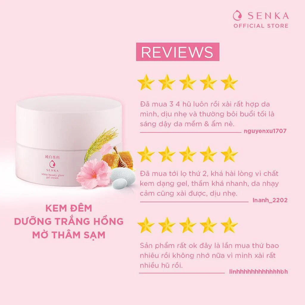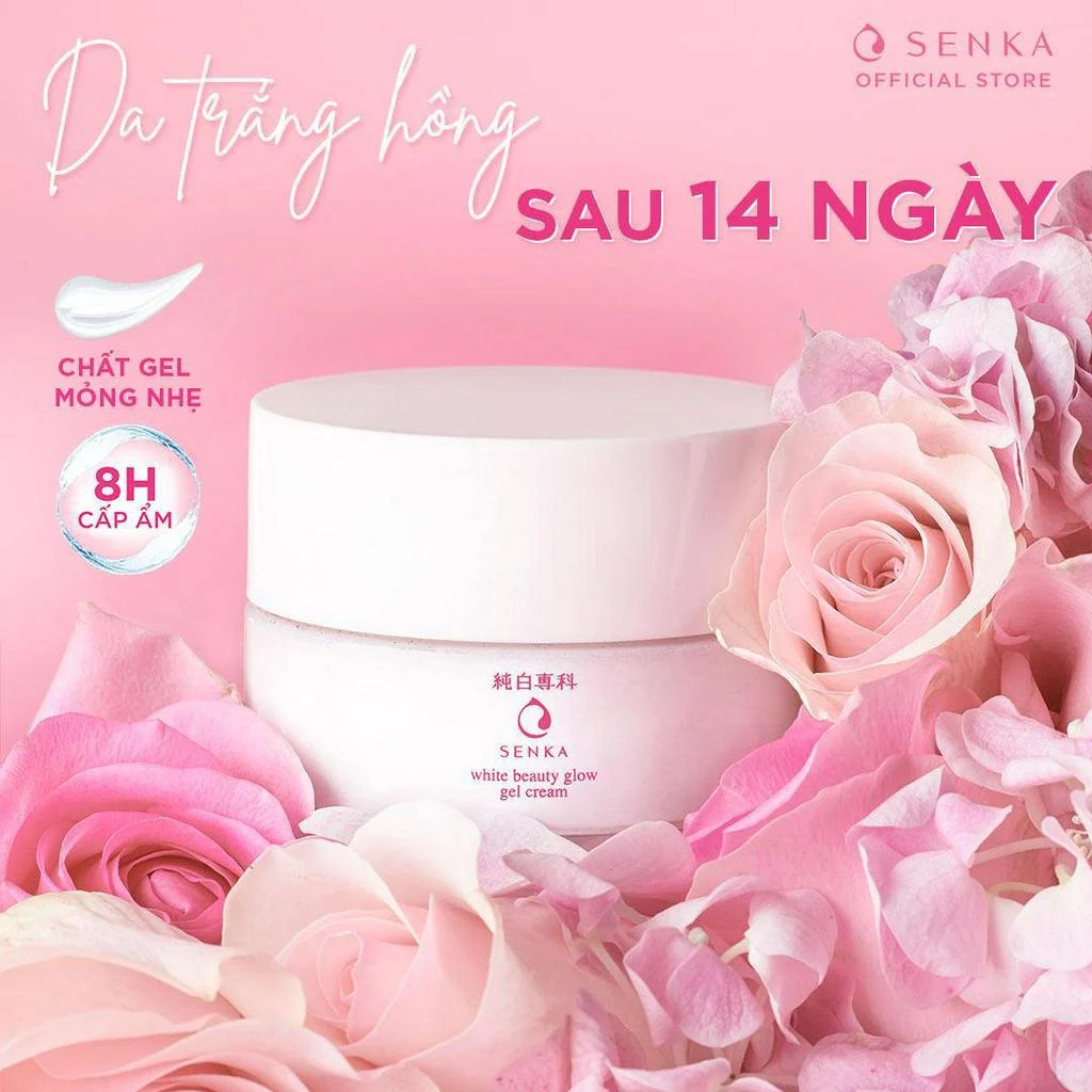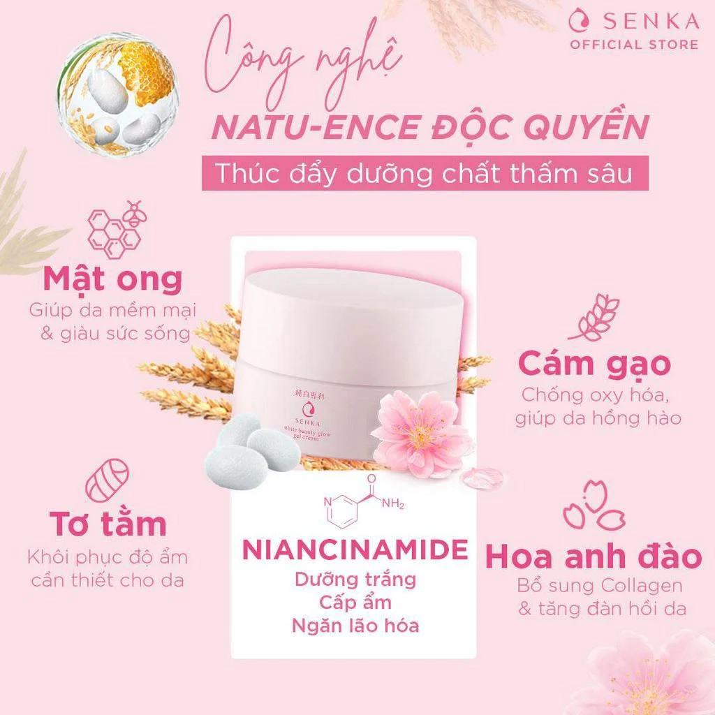 - Kem Dưỡng Trắng Da, Giảm Thâm Nám Ban Đêm Senka White Beauty Glow Gel Cream thành phần dưỡng trắng NIANCINAMIDE dẫn xuất của Vitamin B3, giúp chống lại được những tác hại của tia tử ngoại, ức chế hoạt động của tế bào hắc tố (Melanin), đồng thời chống ôxy hóa, và tăng sản xuất Ceramides, bảo vệ độ ẩm cho da giúp da trắng sáng đều màu.
