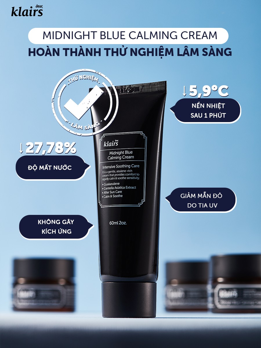 - Kem Dưỡng Klairs Midnight Blue Calming Cream hiện đã có mặt tại Garden Shop với thành phần chính chứa Guaiazulene có màu xanh đặc trưng chiết xuất từ hoa cúc giúp phục hồi làn da bị tổn thương do các tác động bên ngoài cũng như bổ sung đầy đủ độ ẩm và làm dịu da hiệu quả mang lại làn da khỏe mạnh, căng mịn, săn chắc. Hiệu quả cao trong việc chống viêm, kháng khuẩn, chống ngứa, nhẹ nhàng sát khuẩn và thanh lọc cho làn da. Đặc biệt thích hợp với làn da bị kích thích và nhạy cảm.