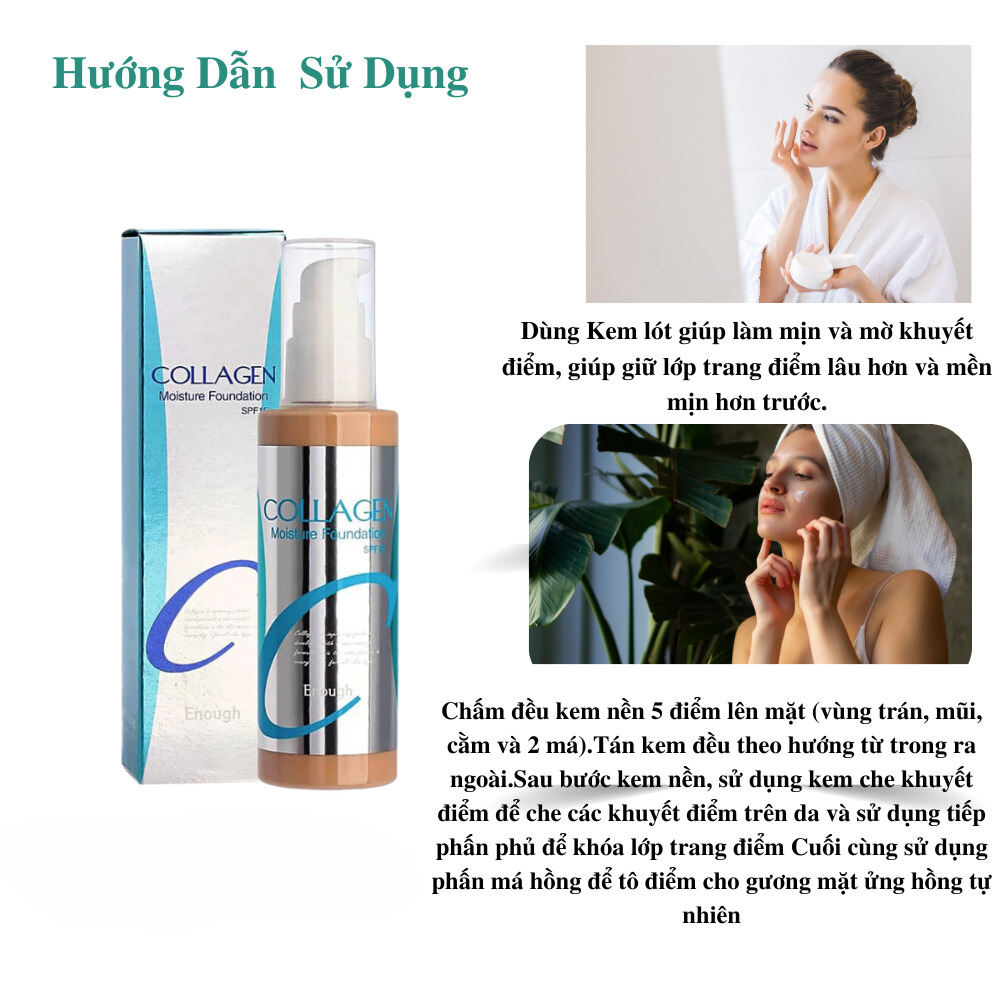 - Kem nền enough collagen moisture foundation chứa các thành phần như collagen và axit hyaluronic giúp dưỡng ẩm cho da căng da mặt và cũng ngăn ngừa sự xuất hiện của khô và bong tróc.