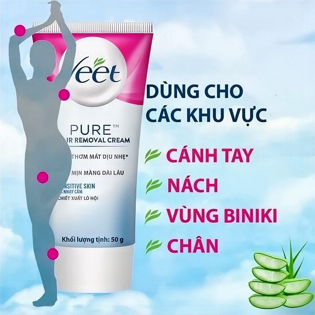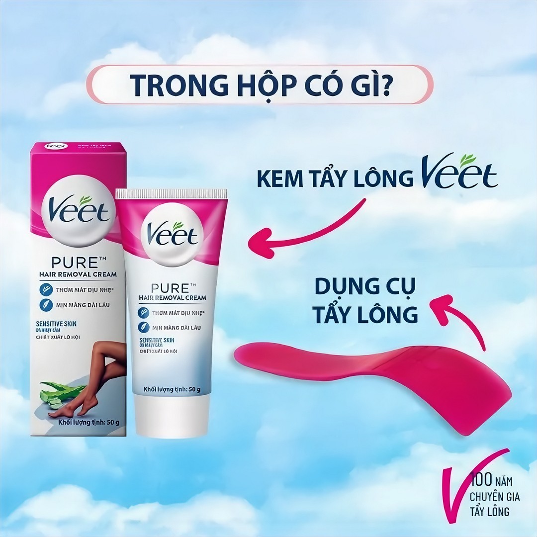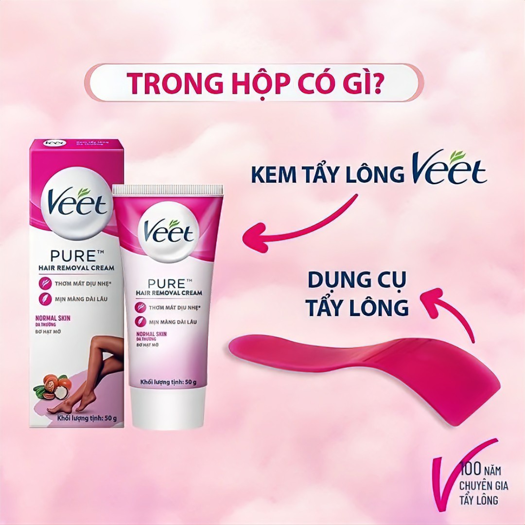 Kem Tẩy Lông Veet Pure Hair Removal Cream 50g là dòng kem tẩy lông thế hệ mới đến từ thương hiệu Veet (Anh Quốc), nổi bật với công thức không mùi ammoniac gây khó chịu, giúp loại bỏ lông nhanh chóng chỉ sau 3–6 phút, đồng thời chăm sóc da mịn màng, không bị khô rát.