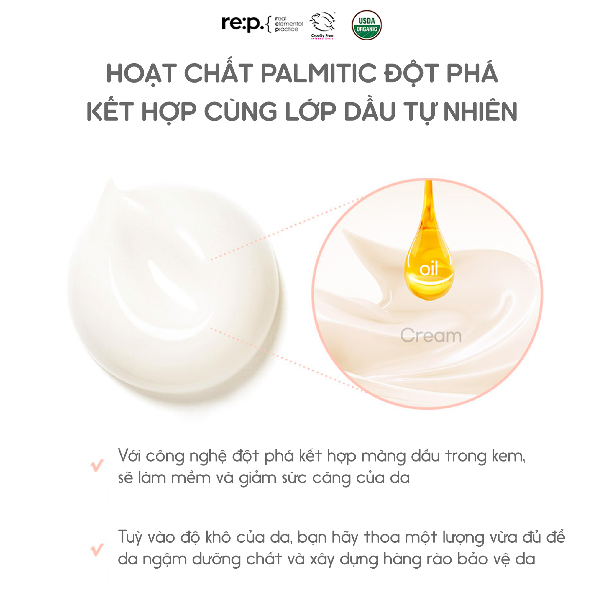 - Kem Dưỡng Giảm Rạn, Săn Chắc Da Re:p Natural Herb Ultra Firming Stretch Cream hiện tại đã có mặt tại Garden Shop với thành phần Palmitic Acid giúp làm mềm và làm dịu da. Đồng thời đóng vai trò là tác nhân khóa ẩm tạo thành một lớp màng bảo vệ trên bề mặt da từ đó ngăn chặn sự thoát hơi nước của da và tăng cường Hydrat hóa da. Ngoài ra còn chăm sóc da bằng cách giúp phục hồi chức năng hàng rào bảo vệ tự nhiên của da.