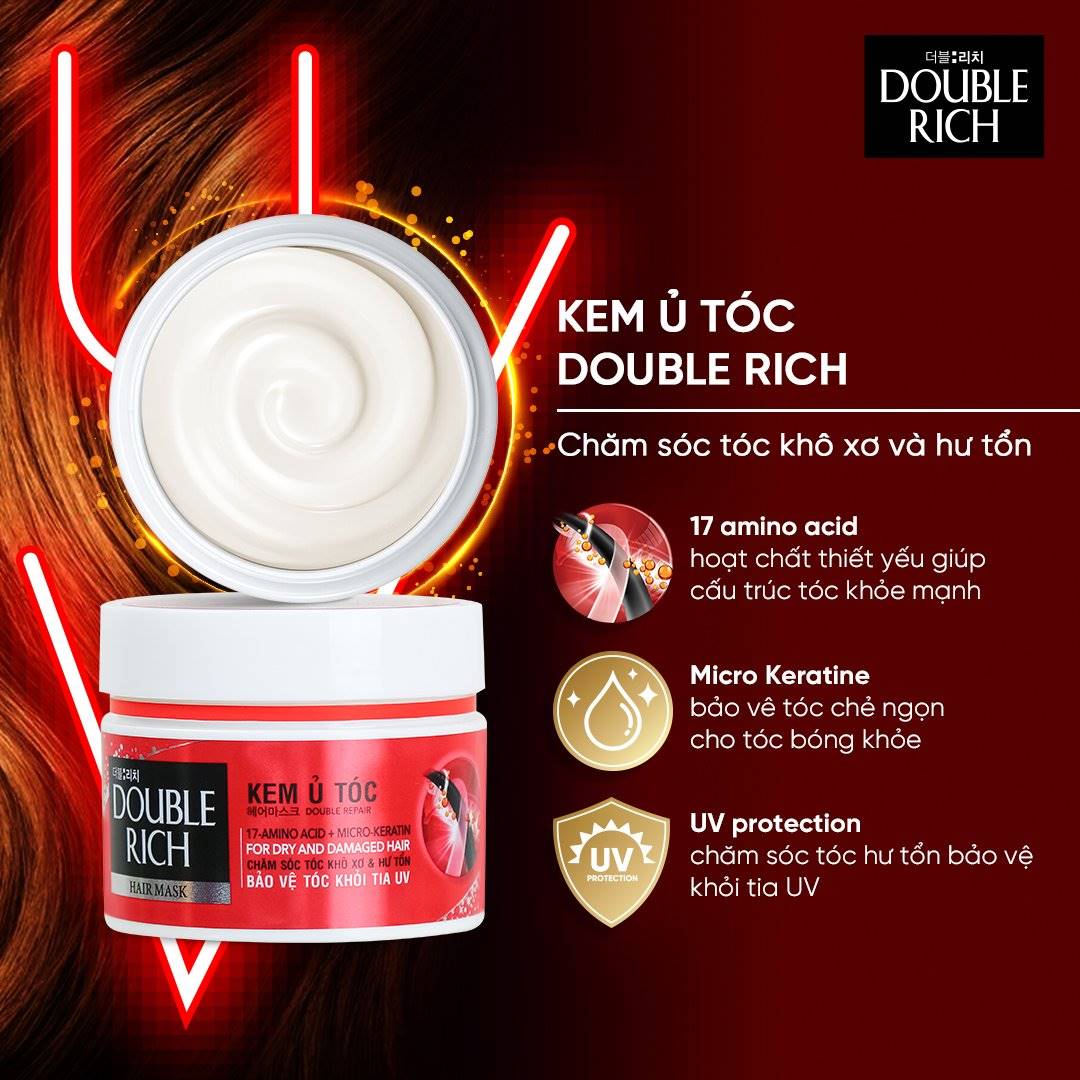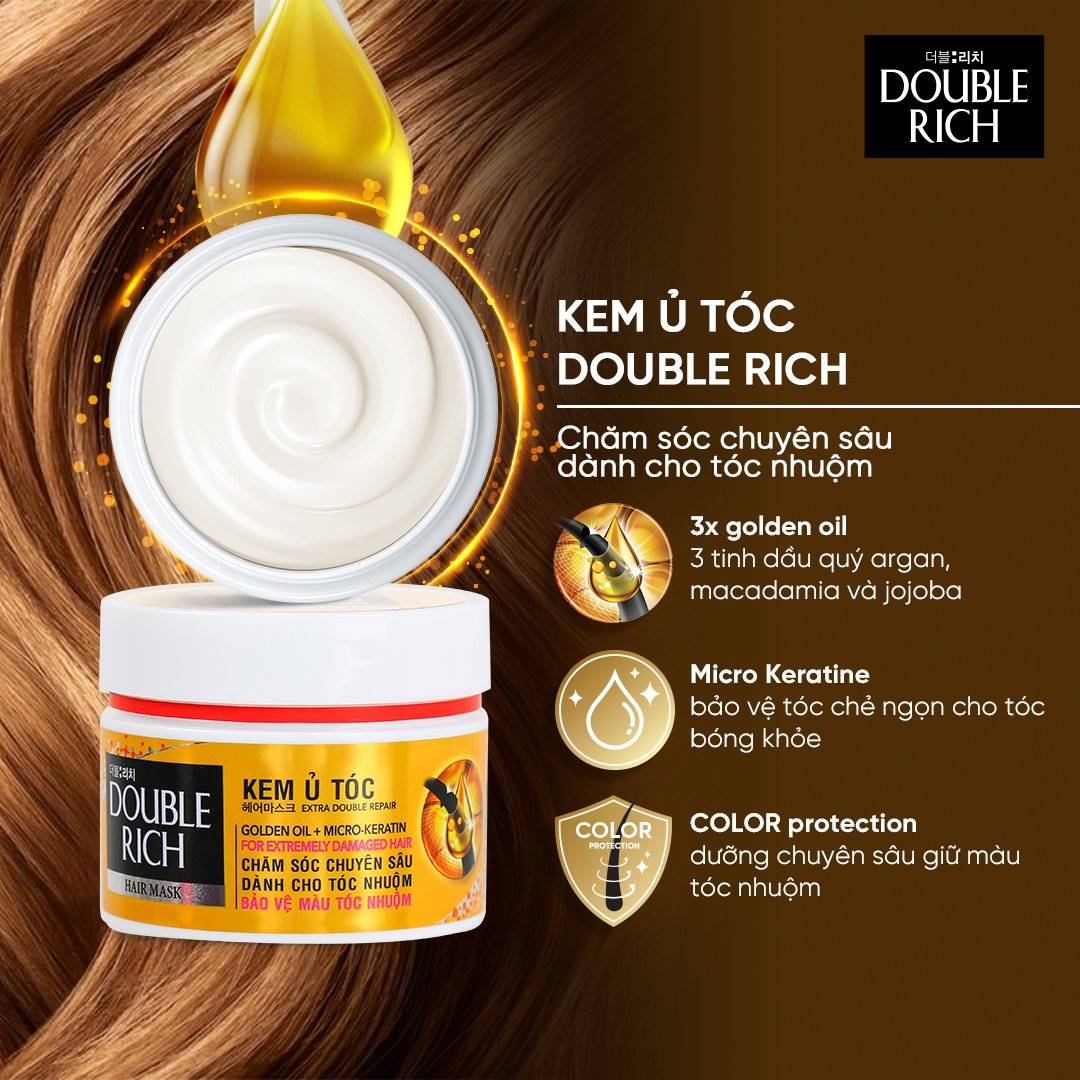 Kem Ủ Tóc Double Rich Chăm Tóc Chuyên Sâu 150g là sản phẩm dưỡng tóc chuyên sâu giúp phục hồi tóc hư tổn, nuôi dưỡng tóc từ gốc đến ngọn, mang lại mái tóc suôn mượt và khỏe mạnh. Với công thức đặc biệt, kem ủ tóc Double Rich cung cấp dưỡng chất thiết yếu, phục hồi tóc hư tổn, giữ ẩm cho tóc suốt cả ngày dài.