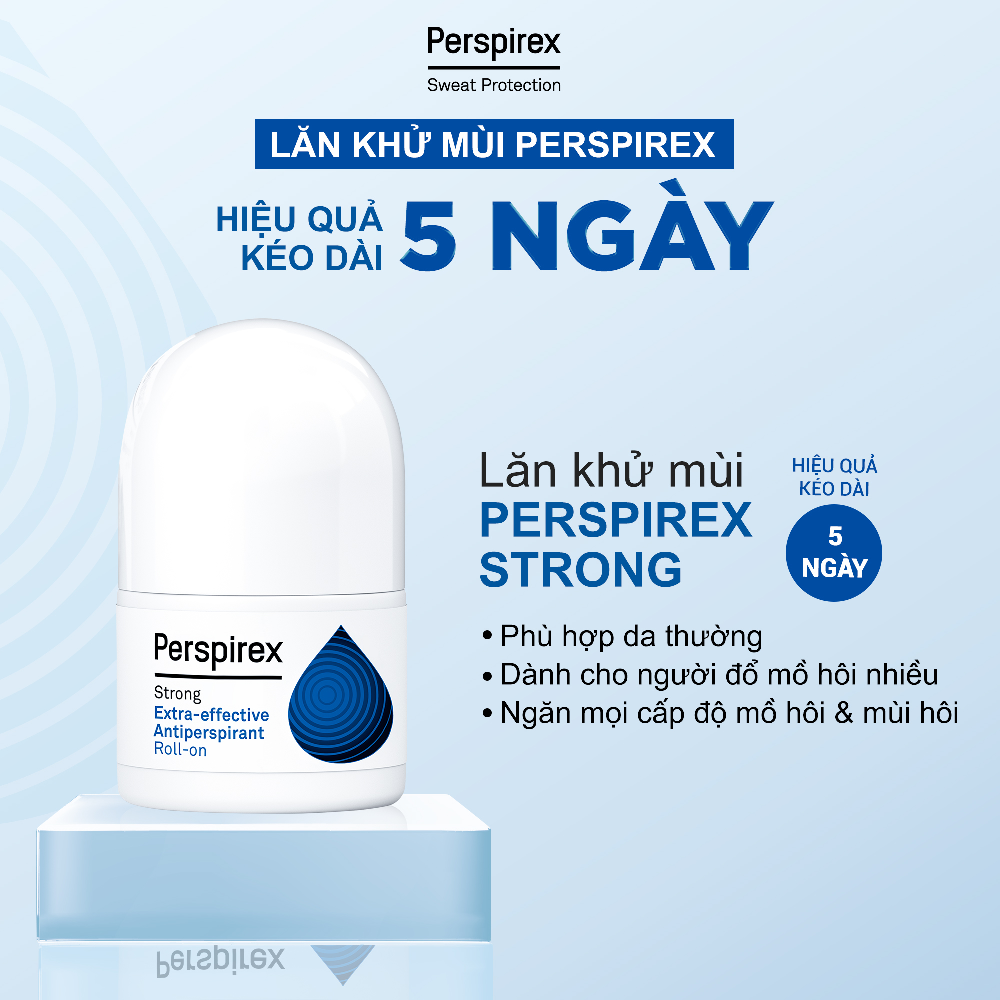 • Lăn khử mùi Perspirex Strong (Xanh dương đậm): Dành cho da thường đổ mồ hôi nhiều, hiệu quả kéo dài lên đến 5 ngày.