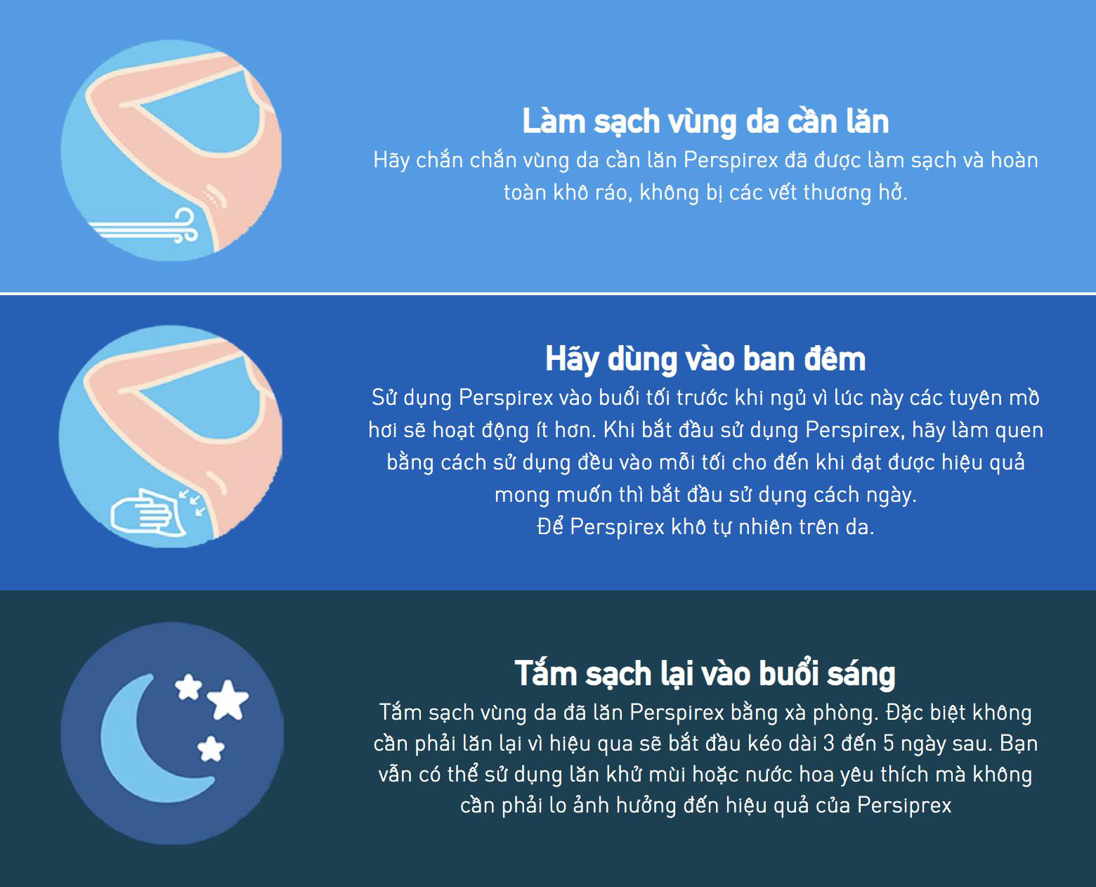 - Vì đây là sản phẩm giảm tiết mồ hôi từ bên trong nên phải dùng ban đêm trước khi ngủ thì hôm sau mới có tác dụng. Ban đêm khi bạn ngủ, cơ thể gần như không vận động là thời gian giúp Perspirex có thể hoạt động hiệu quả nhất.
