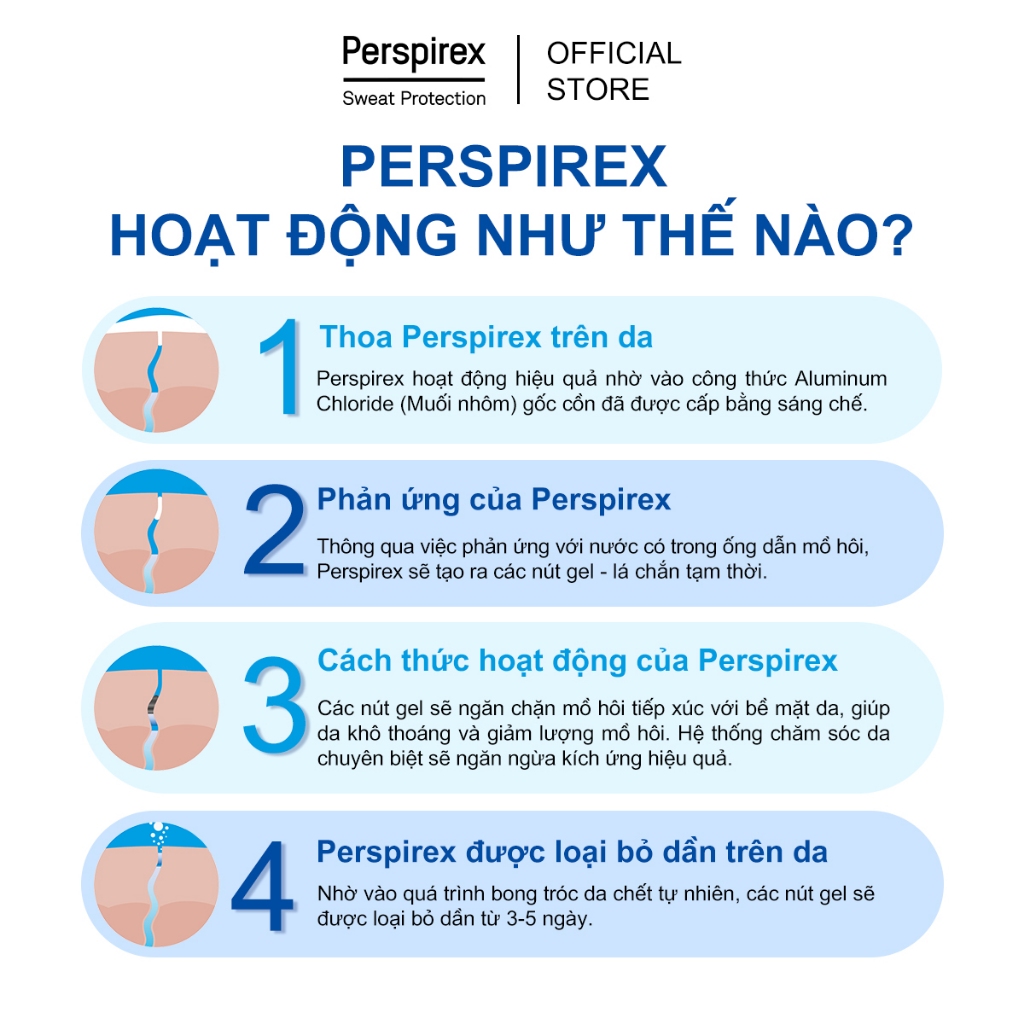 - Thành phần của Perspirex hấp thụ vào da, tạo ra những nút chặn ức chế tuyến mồ hôi tạm thời, giúp giảm mồ hôi tiết ra. Do đó, bạn sẽ không còn bị ướt nách áo và mùi hôi khó chịu nữa.