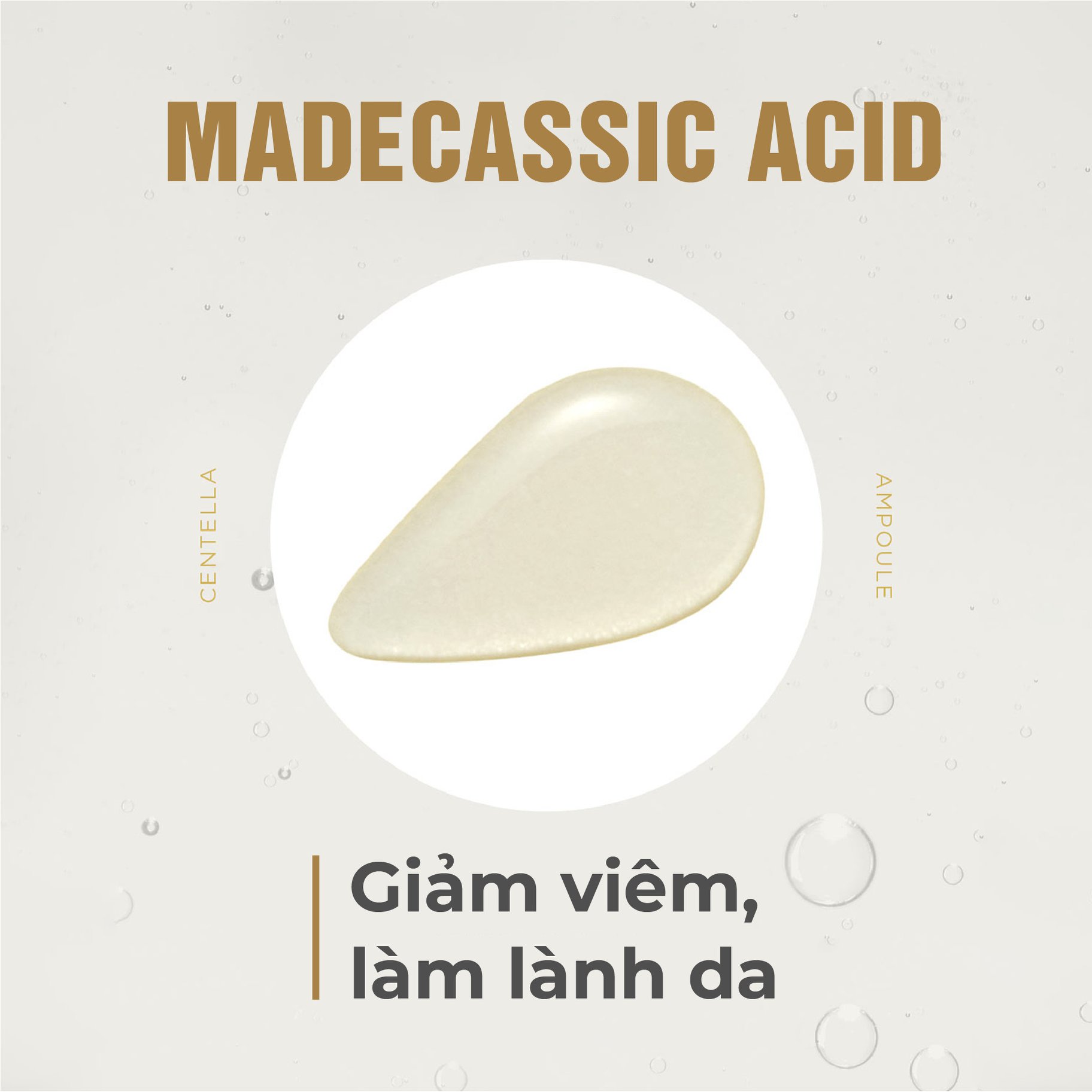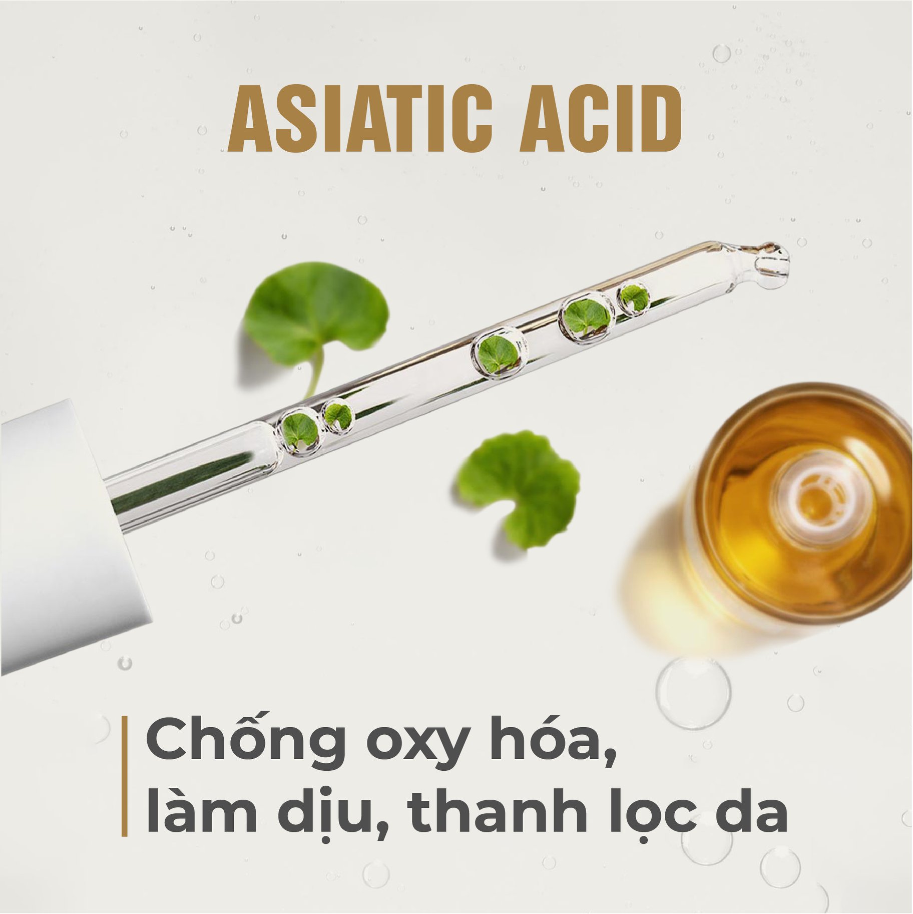 - Trong đó, Asiaticoside có tác dụng hữu ích đối với sẹo thâm do mụn để lại vì có khả năng làm tăng tốc độ tái tạo của tế bào da. Asiatic Acid là một hoạt chất chống oxy hóa giúp làm dịu da, thanh lọc làn da hiệu quả. Và Madecassic Acid giúp giảm viêm và làm lành da, kích thích sản xuất collagen làm săn chắc da và giảm sự xuất hiện của các nếp nhăn.