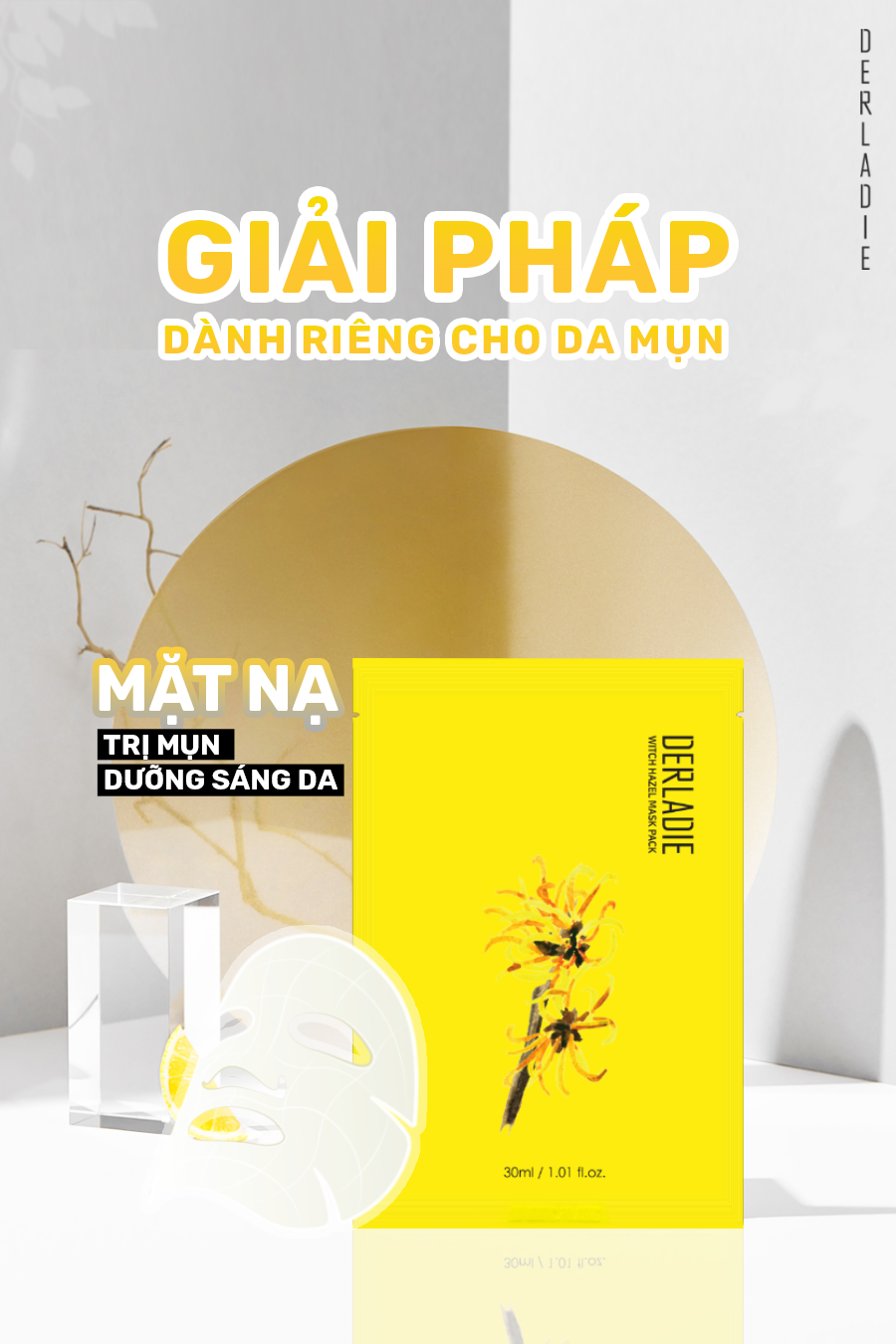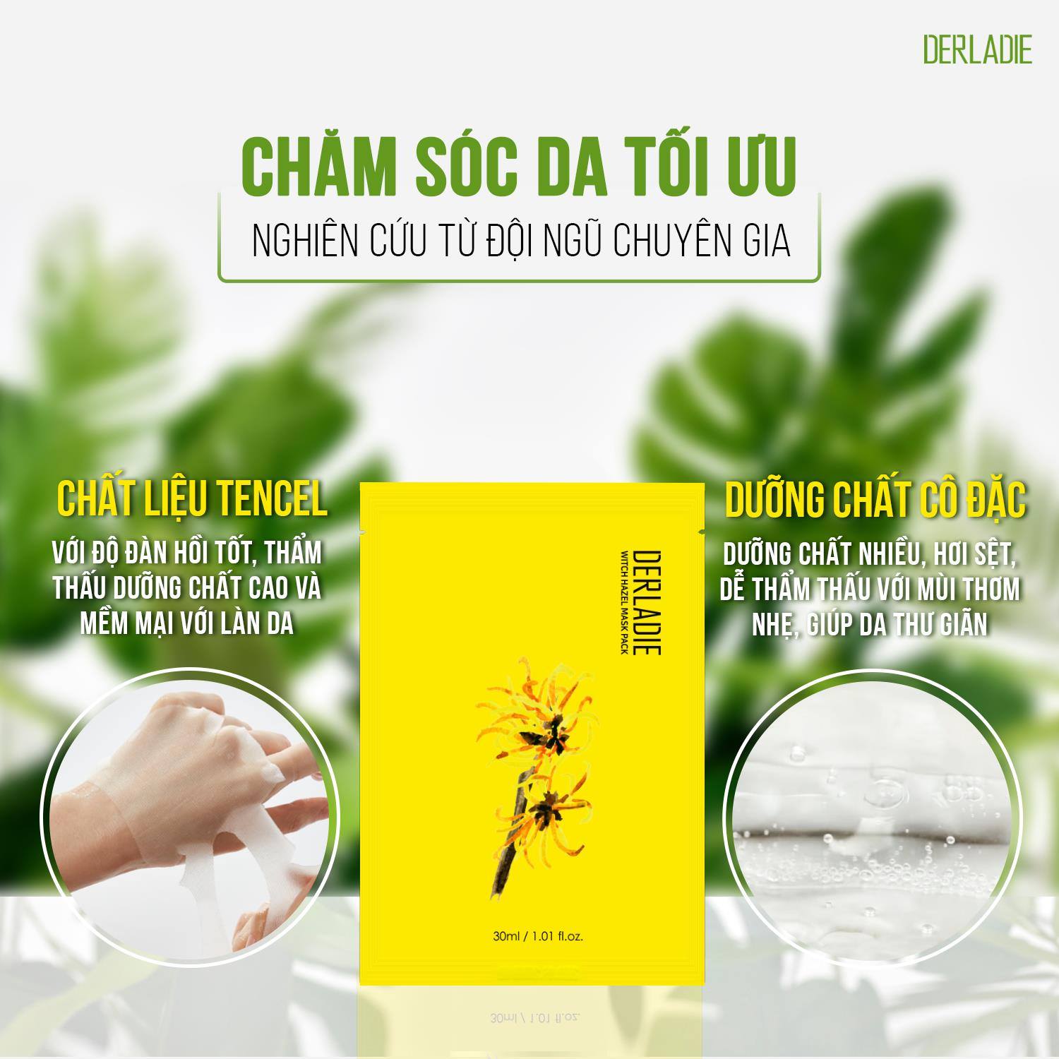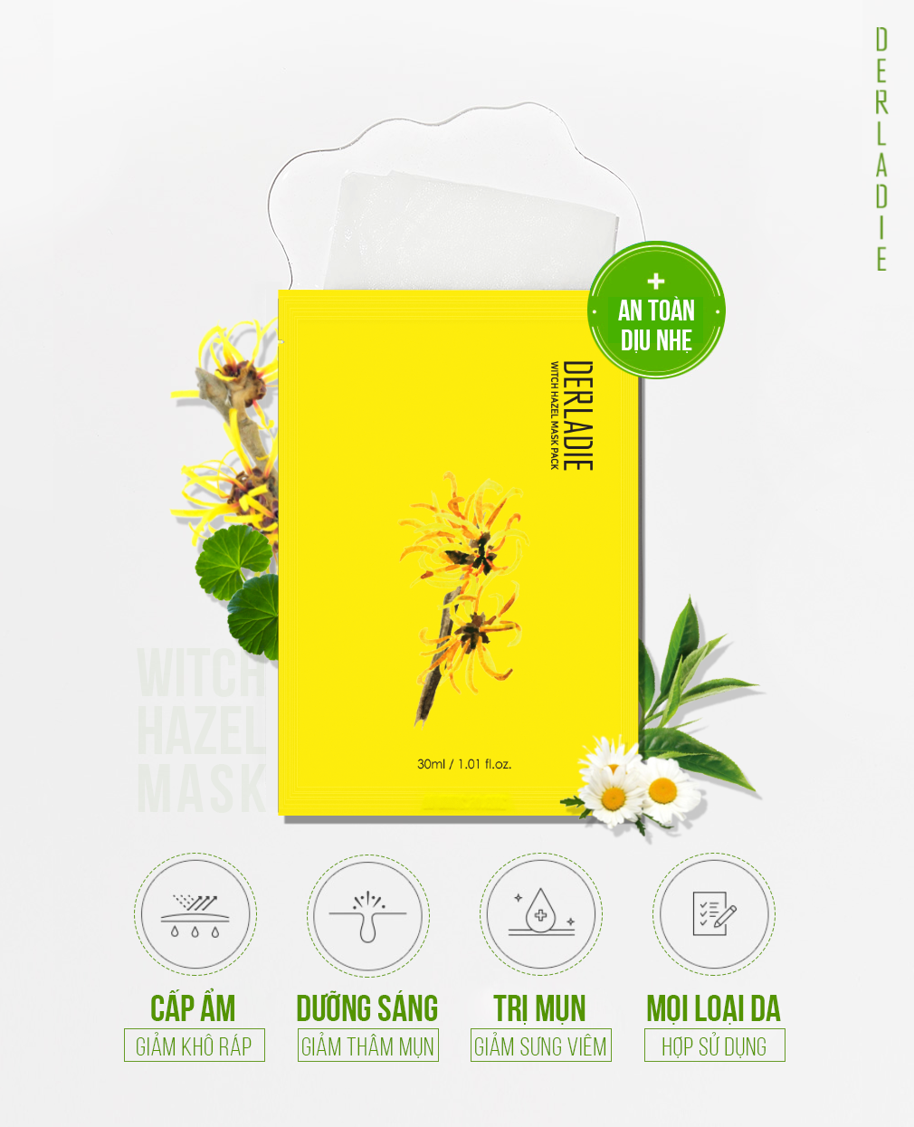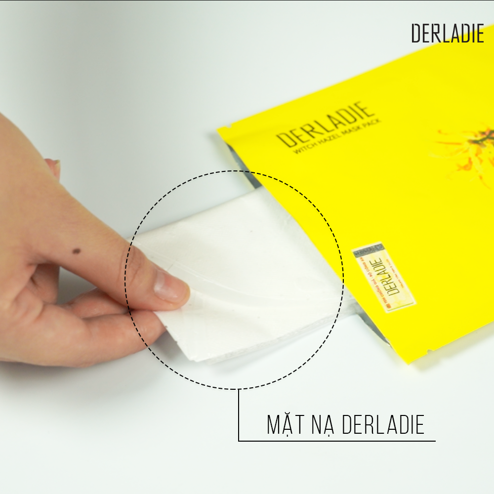 - Mặt Nạ Trị Mụn, Dưỡng Sáng Da Trong "14 Ngày" Derladie Witch Hazel Mask Pack với thành phần chính là chiết xuất cây phỉ có tên khoa học là hamamelis Virginiana được chiết xuất từ hoa, lá, hạt của cây phỉ, nổi trội trong việc làm dịu da và sát khuẩn nhẹ. Thành phần chính có trong Witch Hazel chính là tannin và polyphenol khá nổi tiếng trong khả năng hỗ trợ điều trị mụn, chống viêm mạnh mẽ.