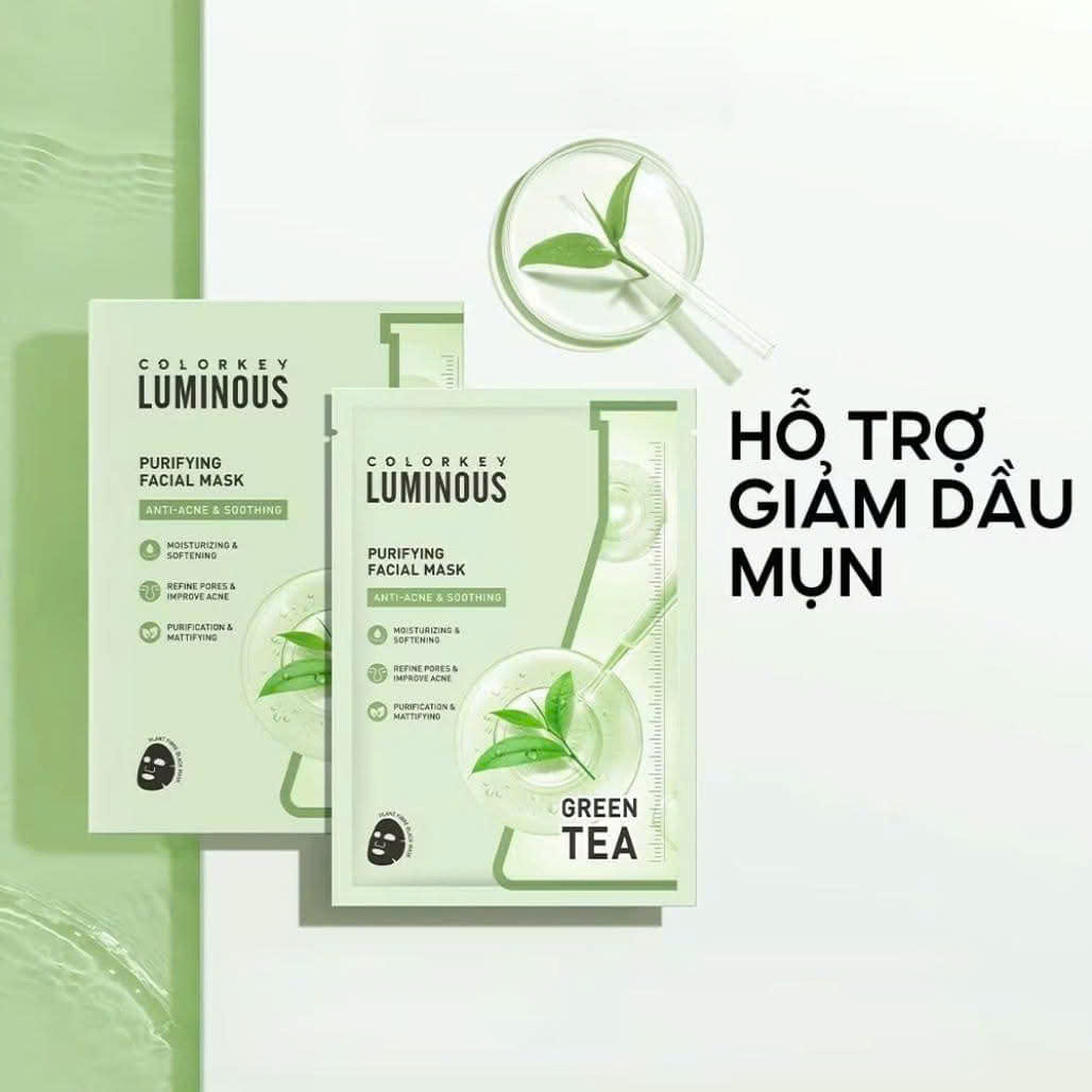 Mặt Nạ Trà Xanh Dịu Da Colorkey Luminous Green Tea 25ml đến từ Thương Hiệu ColorKey Xuất Xứ tại Trung Quốc chăm sóc da tối ưu với sự kết hợp độc đáo từ chiết xuất trà xanh và BHA 0.5% (Salicylic Acid). Công thức tiên tiến giúp kiểm soát dầu thừa, thu nhỏ lỗ chân lông, cải thiện sắc tố da không đều và giảm mụn rõ rệt. Sản phẩm mang đến làn da sạch mịn, tươi sáng và khỏe mạnh mỗi ngày.