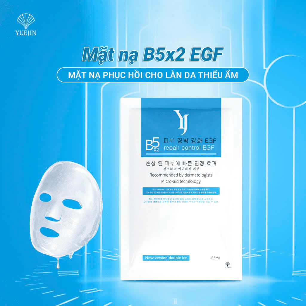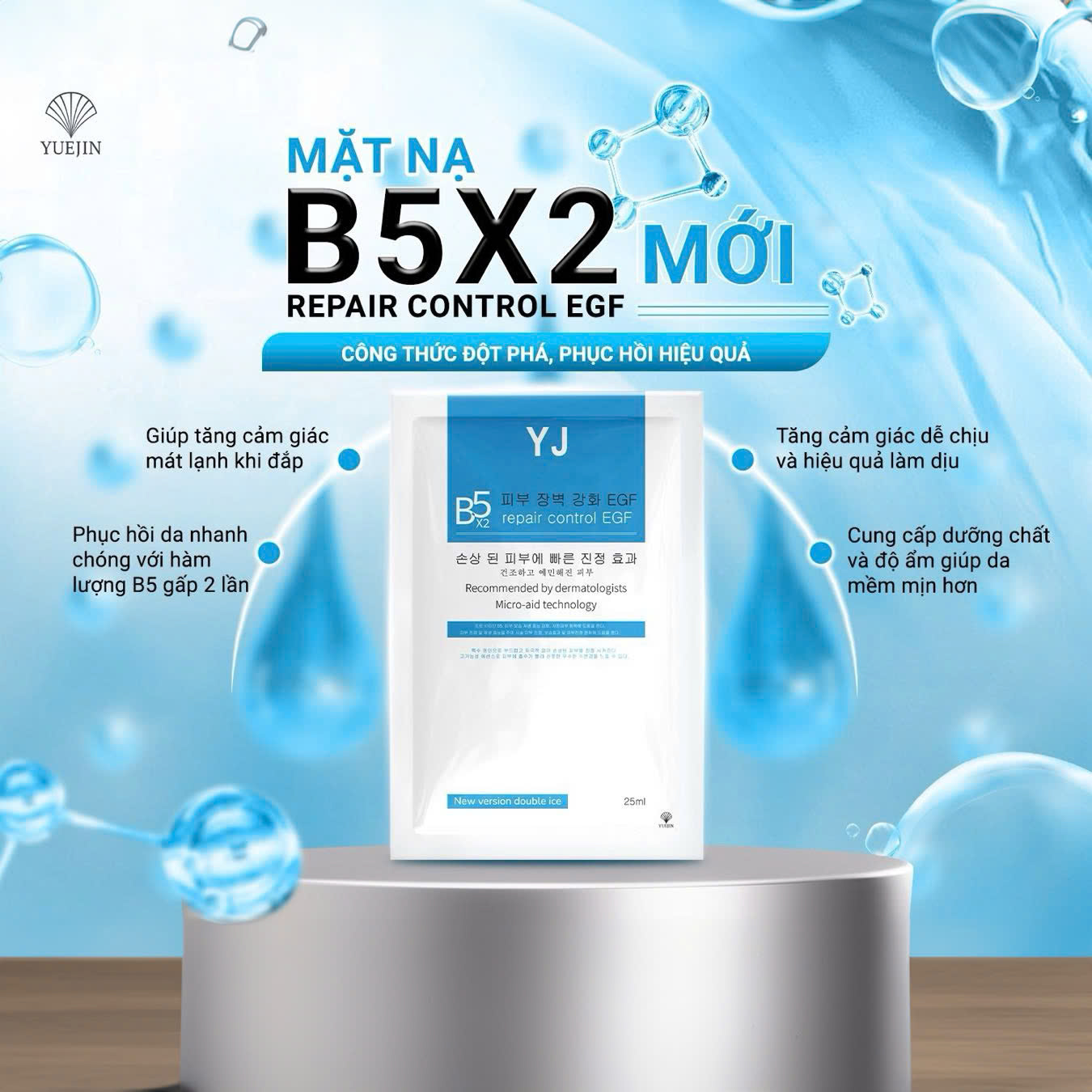 B5 Repair Control EGF Yuejin Mask là dòng mặt nạ tinh chất đa tầng cao cấp thuộc thương hiệu Yuejin đến từ Hàn Quốc. Sản phẩm là dòng mặt nạ phục hồi da giúp dưỡng ẩm, làm dịu và giảm kích ứng da, đồng thời tái tạo da, giúp da phục hồi nhanh chóng sau liệu trình lăn kim, phi kim, laser, peel da,…