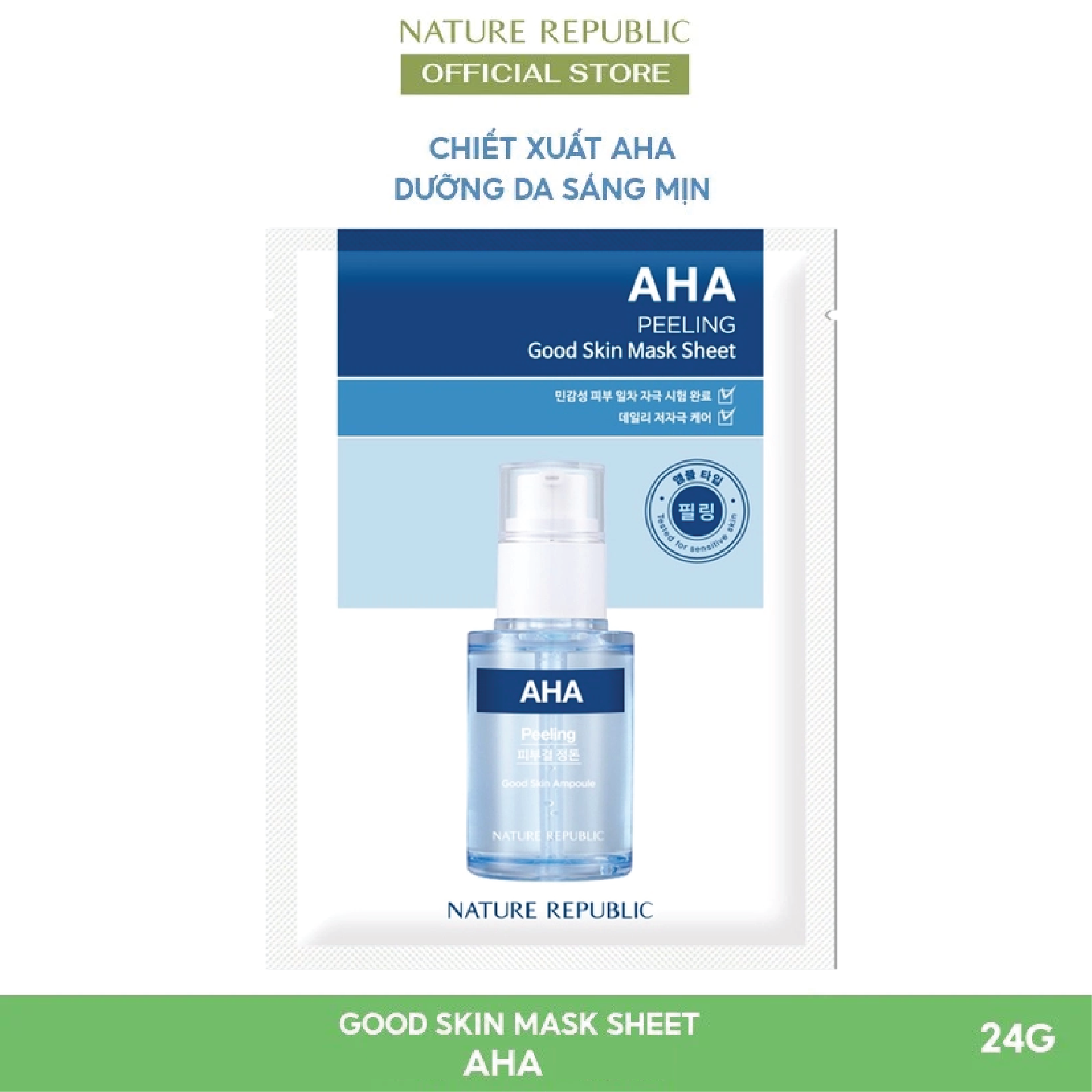 Mặt Nạ Giấy Good Skin AHA 24g là mặt nạ vi sợi Microfiber nguồn gốc thực vật có cấu trúc siêu nhỏ đã đạt được Tiêu chuẩn Oeko - Tex Standard 100 - tiêu chuẩn về việc kiểm nghiệm sự an toàn sản phẩm dệt lên sức khỏe của con người.