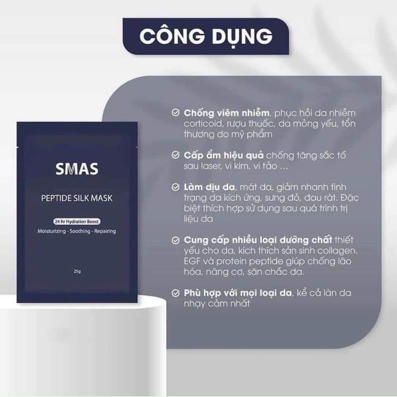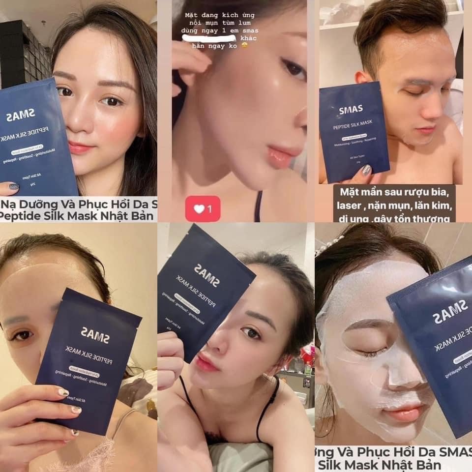 - Sản phẩm Smas Peptide Silk Mask là dòng mặt nạ được rất nhiều chị em tin tưởng và sử dụng nhờ đem đến công dụng đa năng hơn so với những loại mặt nạ dưỡng da thông thường vì có khả năng vừa dưỡng, vừa làm dịu da, phục hồi làn da sau quá trình phi kim, lăn kim, laser hoặc peel da,… duy trì làn da khỏe mạnh, chống lão hóa và giúp da trở nên săn chắc hơn.