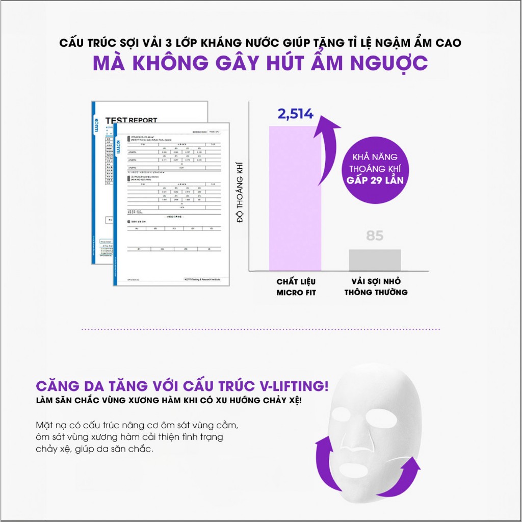 - Vật liệu Micro Fit 3 lớp siêu nâng cơ, là loại vật liệu kết hợp 3 loại sợi có kích thước khác nhau tạo ra những lỗ thông khí giúp đưa tinh chất vào sâu bên trong. Kích thước mỏng hơn sợi tóc 100 lần nên có thể uốn cong theo đường cong nhỏ nhất của da. Có khả năng bám chặt để ngăn ngừa bay hơi và cung cấp độ ẩm tối đa cho da.