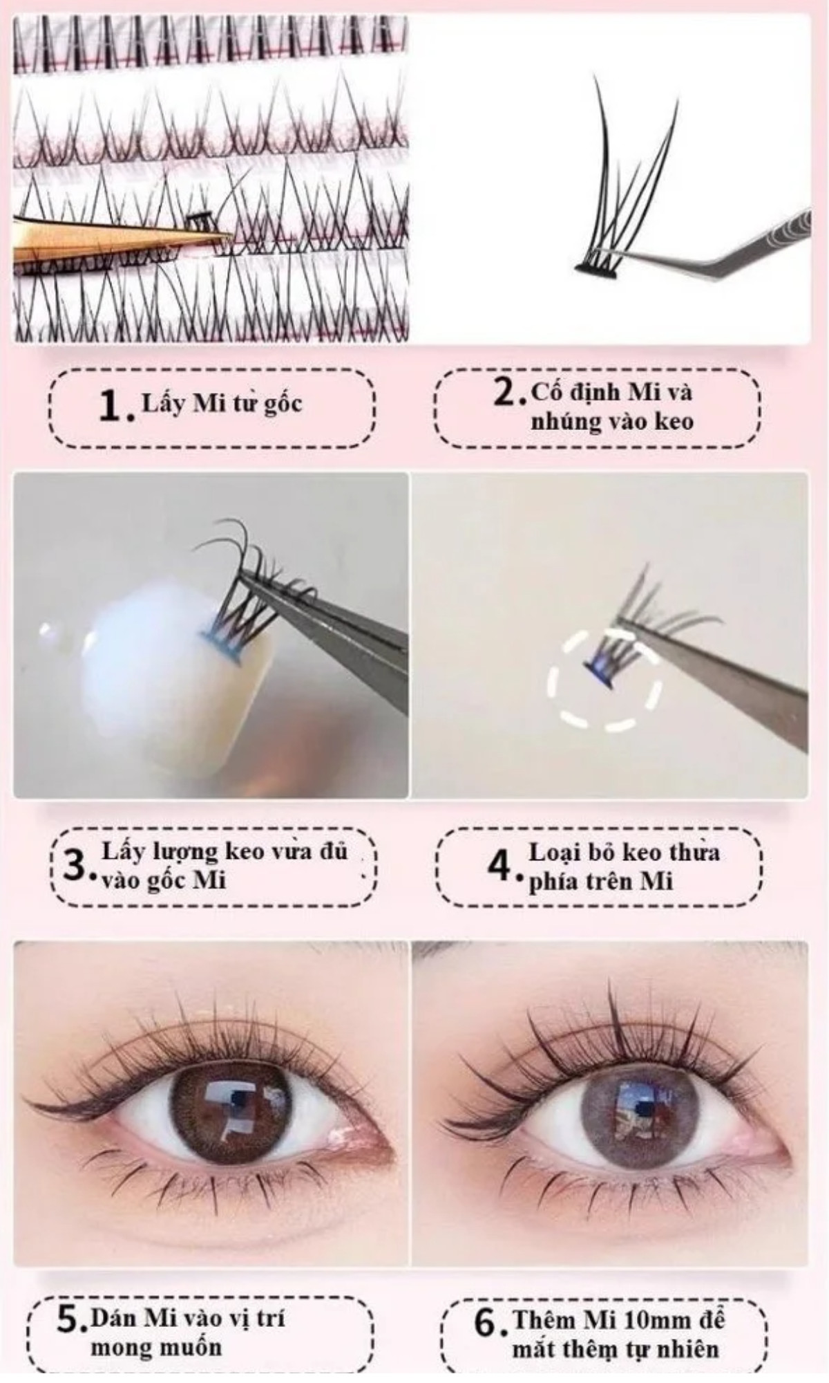 - Dán mi giả lên mí mắt , dán mi giả vào chân mi tự nhiên trong 30-50 giây , dán lên mí mắt sau khi keo khô .