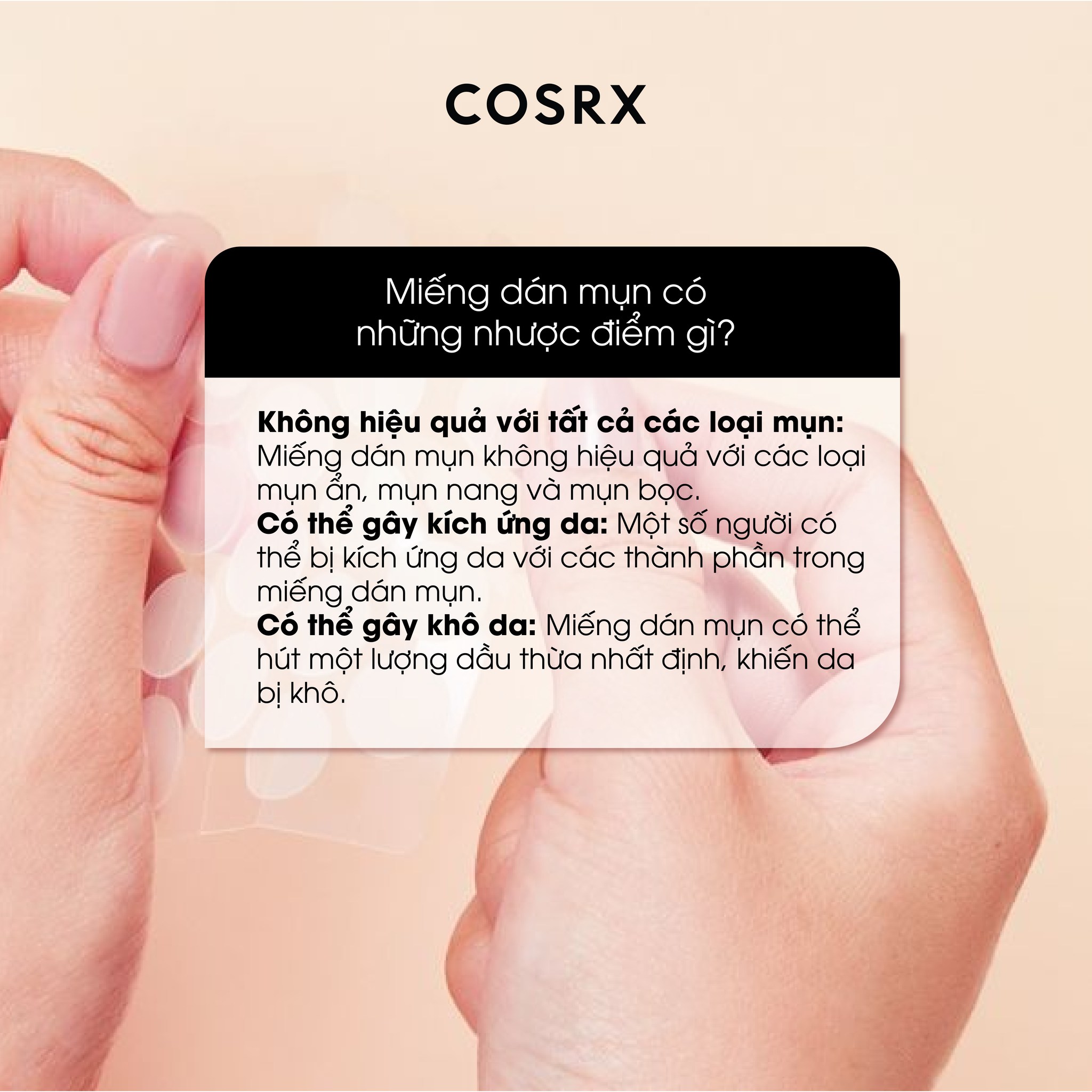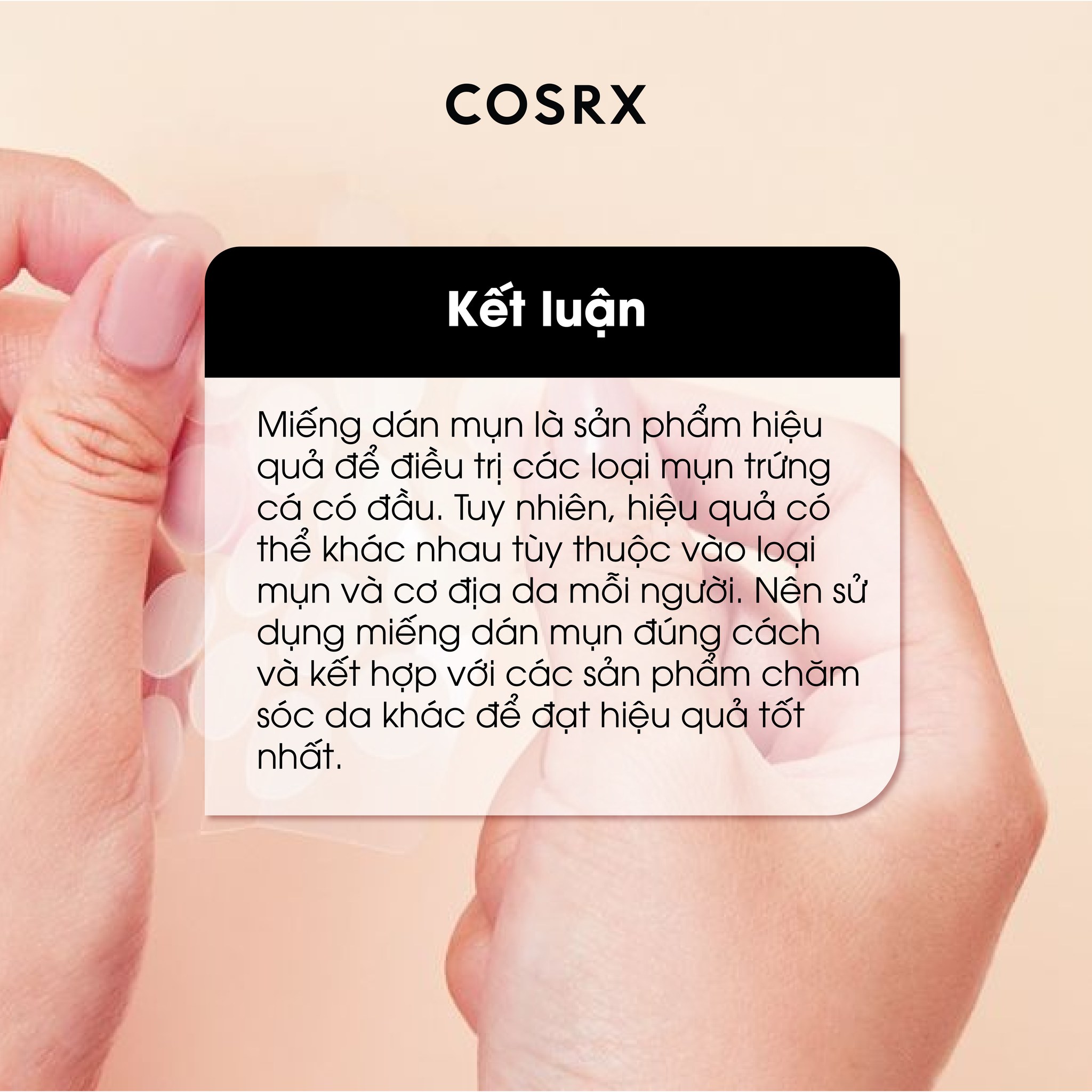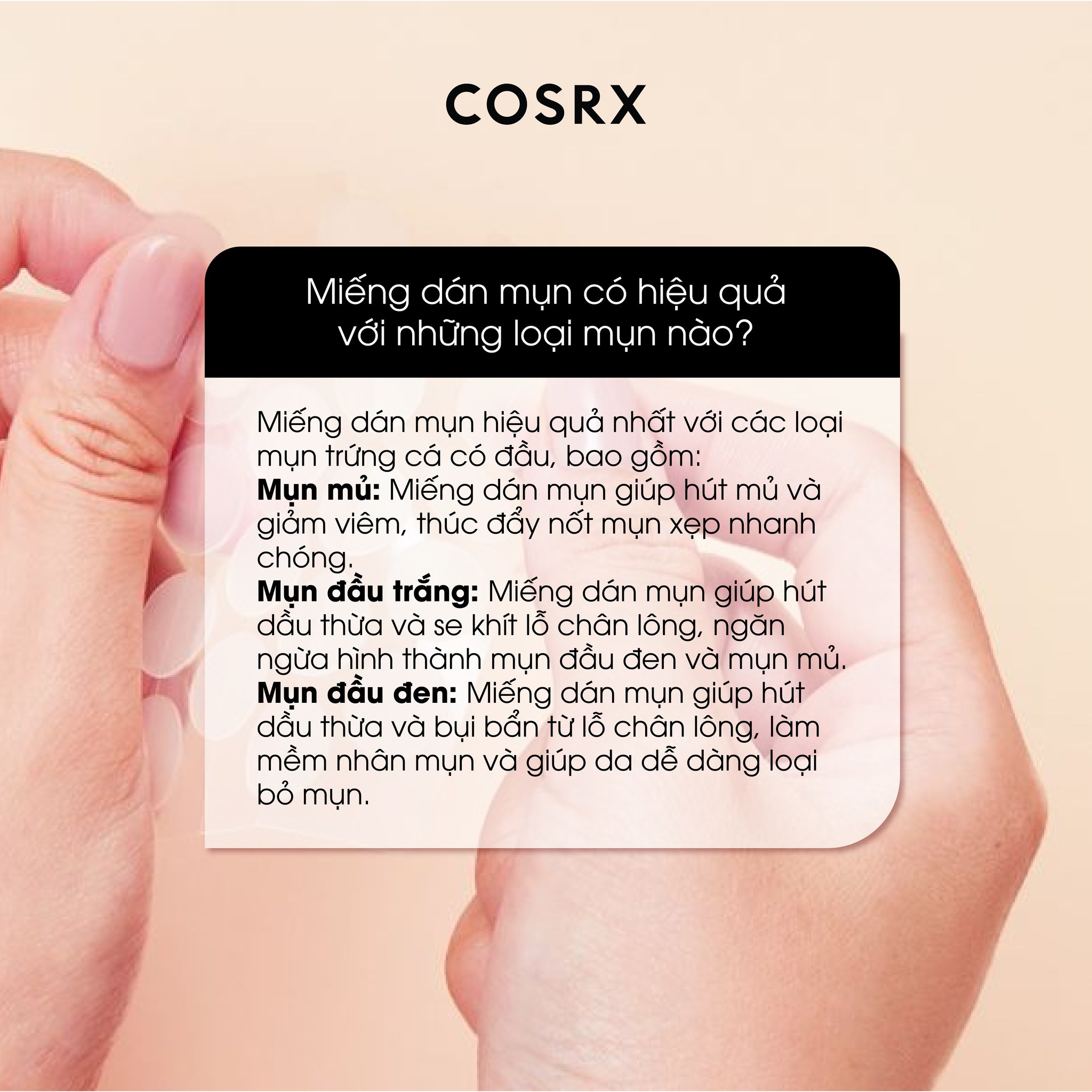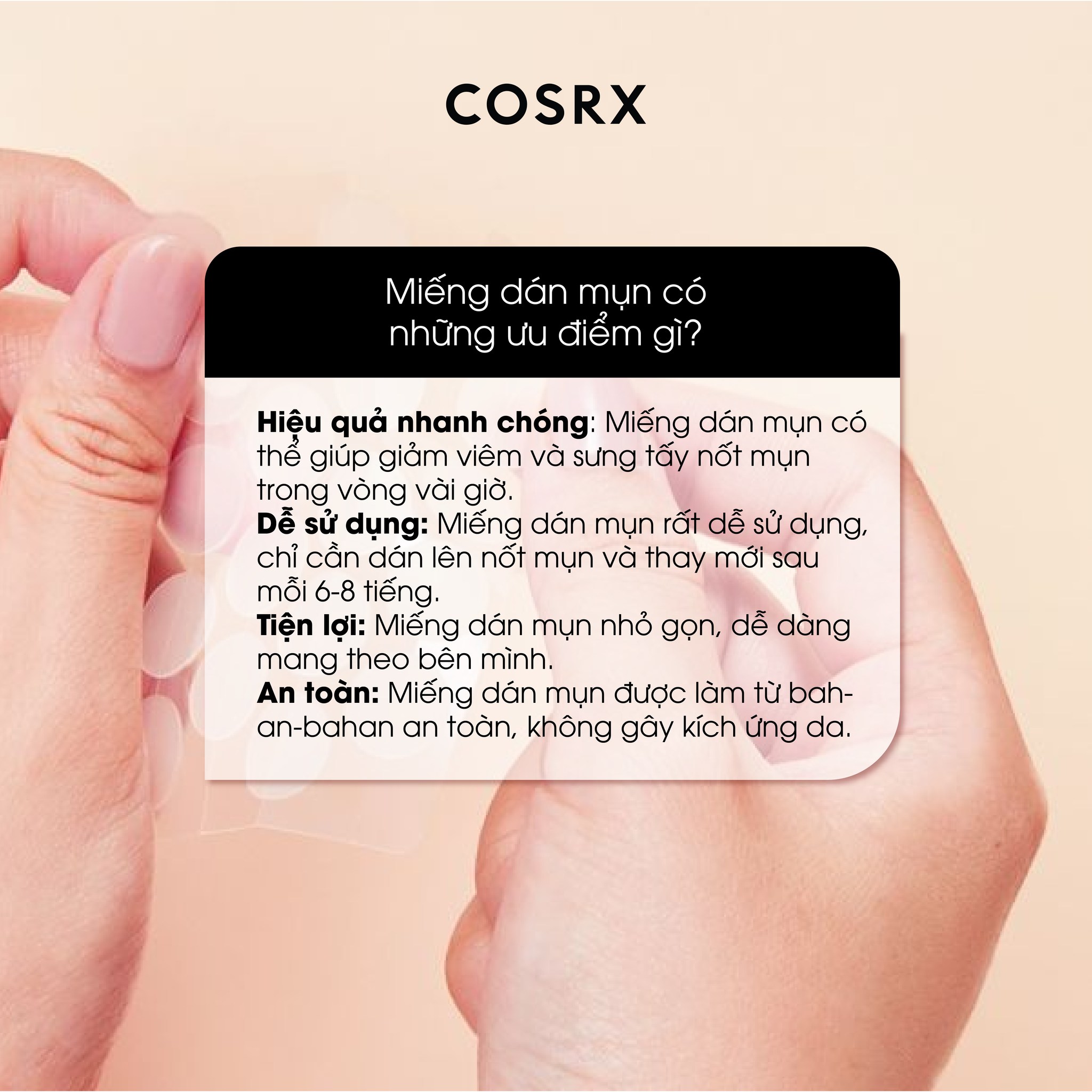 Miếng Dán Mụn Cosrx Acne Pimple Master Patch 24 Miếng là sản phẩm miếng dán mụn đến từ thương hiệu mỹ phẩm Cosrx của Hàn Quốc, có khả năng hút dịch, dầu thừa và gom còi mụn nhành chóng, bảo vệ mụn tránh bị viêm nhiễm và ngăn hình thành sẹo, đẩy nhanh quá trình phục hồi da sau mụn.