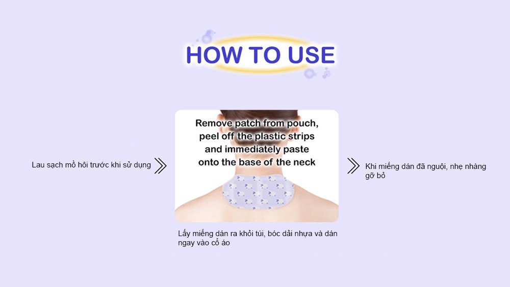 Hướng dẫn sử dụng: Lau sạch mồ hôi hoặc nước còn đọng trên vùng da cổ trước khi sử dụng, xé miệng túi, lấy miếng dán ra khỏi túi, tháo bỏ miếng nhựa và ngay lập tức dán lên da, khi miếng dán đã hết hơi ấm, nhẹ nhàng tháo miếng dán từ một góc.