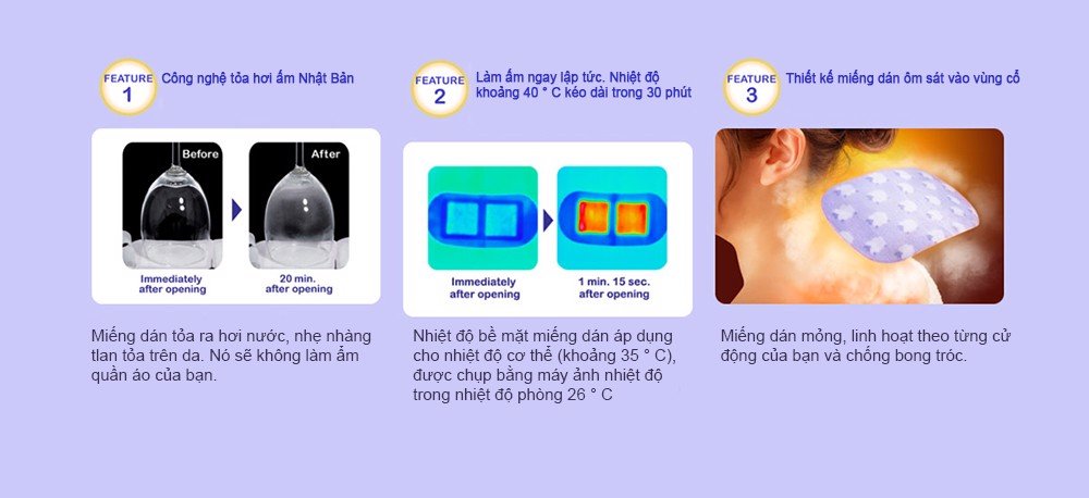 - Công nghệ tự làm nóng từ Nhật Bản, miếng dán tự động ấm lên khi mở ra, tiện lợi khi sử dụng.