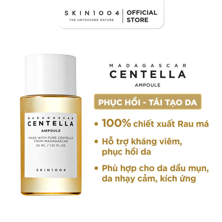 Tinh Chất Rau Má Hỗ Trợ Trị Mụn, Phục Hồi Da Skin1004 Madagascar Centella Asiatica 100 Ampoule là tinh chất với kết cấu cô đặc nhẹ nhàng nhưng mạnh mẽ này được làm từ chiết xuất rau má chứa 30% Asiaticoside, 30% Asiatic Acid và 40% Madecassic Acid cho làn da tươi sáng, nuôi dưỡng và phục hồi da thuộc thương hiệu Skin1004 đến từ Hàn Quốc.