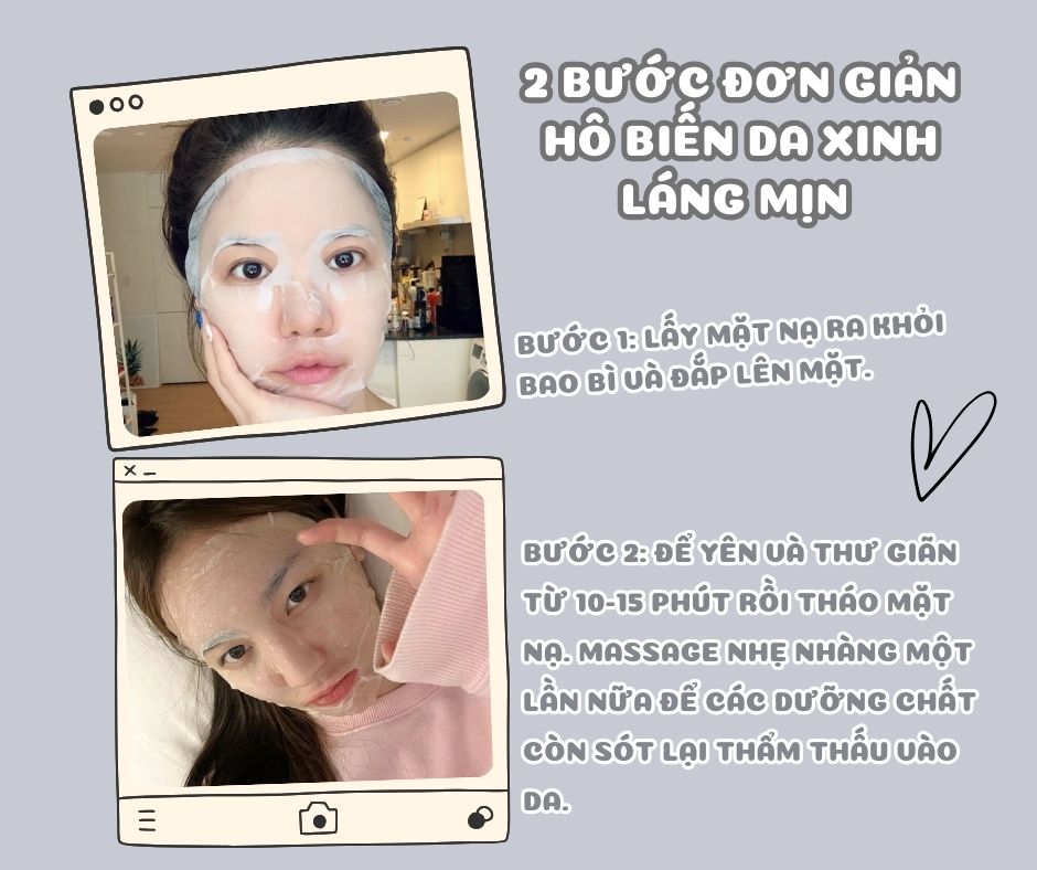 ∞ Hướng dẫn sử dụng: Lấy mặt nạ ra khỏi bao bì và đắp lên mặt. Để yên và thư giãn từ 10-15 phút rồi tháo mặt nạ. Massage nhẹ nhàng một lần nữa để các dưỡng chất còn sót lại thẩm thấu vào da.