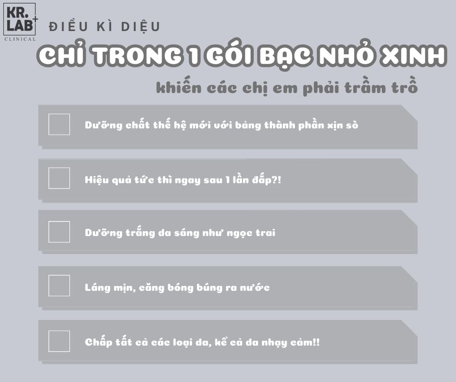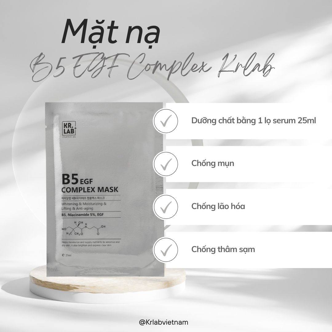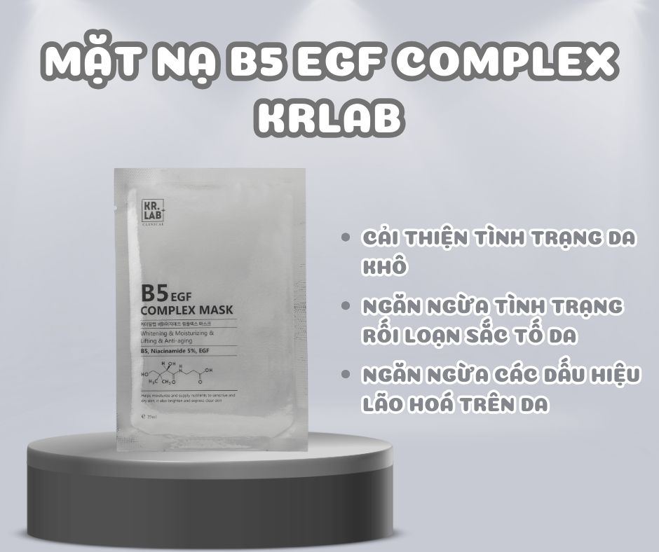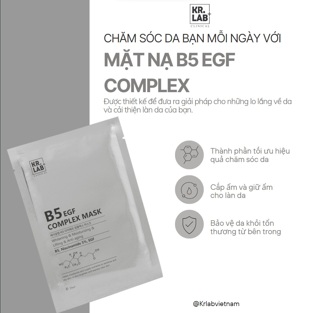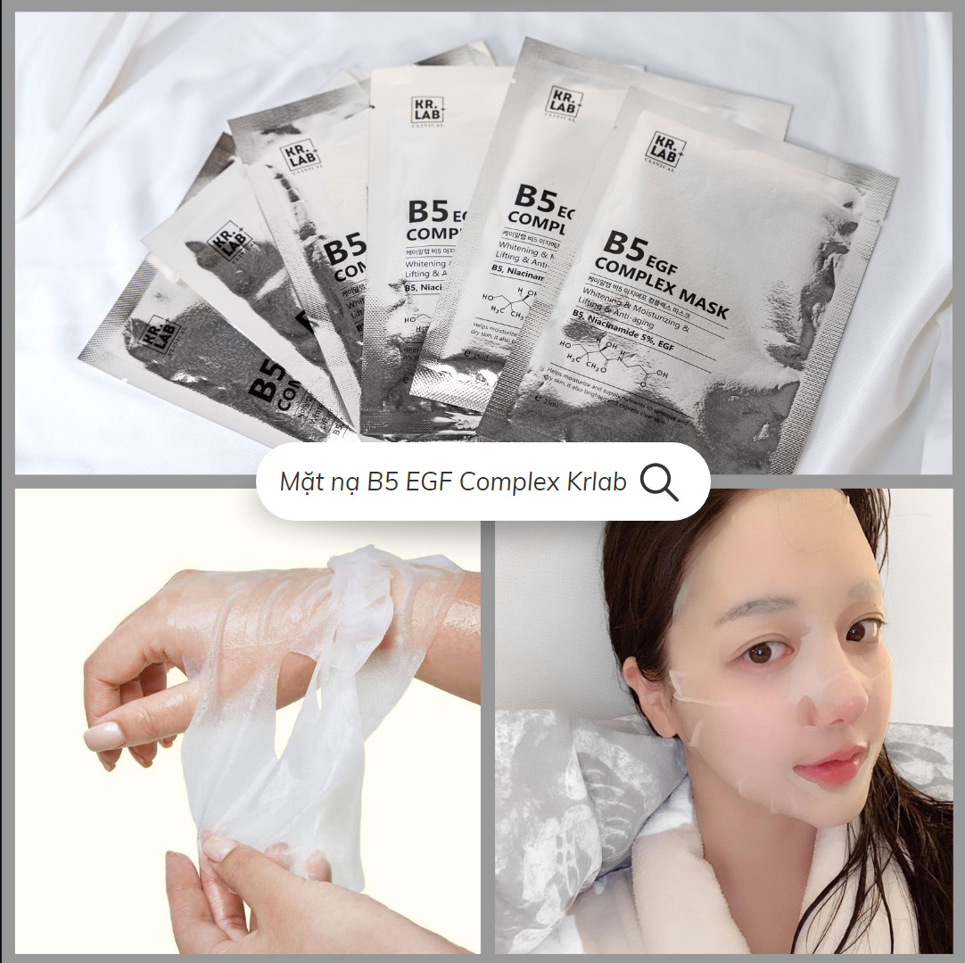 - Kr.Lab+ B5 EGF Complex Mask là mặt nạ giấy được làm từ những sợi xơ sinh học có nguồn gốc từ thiên nhiên, dẻo dai, có độ bám tốt trên da. Mỗi một miếng mặt nạ chứa nhiều dưỡng chất, giúp cho da có thể bổ sung các dưỡng chất cần thiết ngay khi sử dụng.