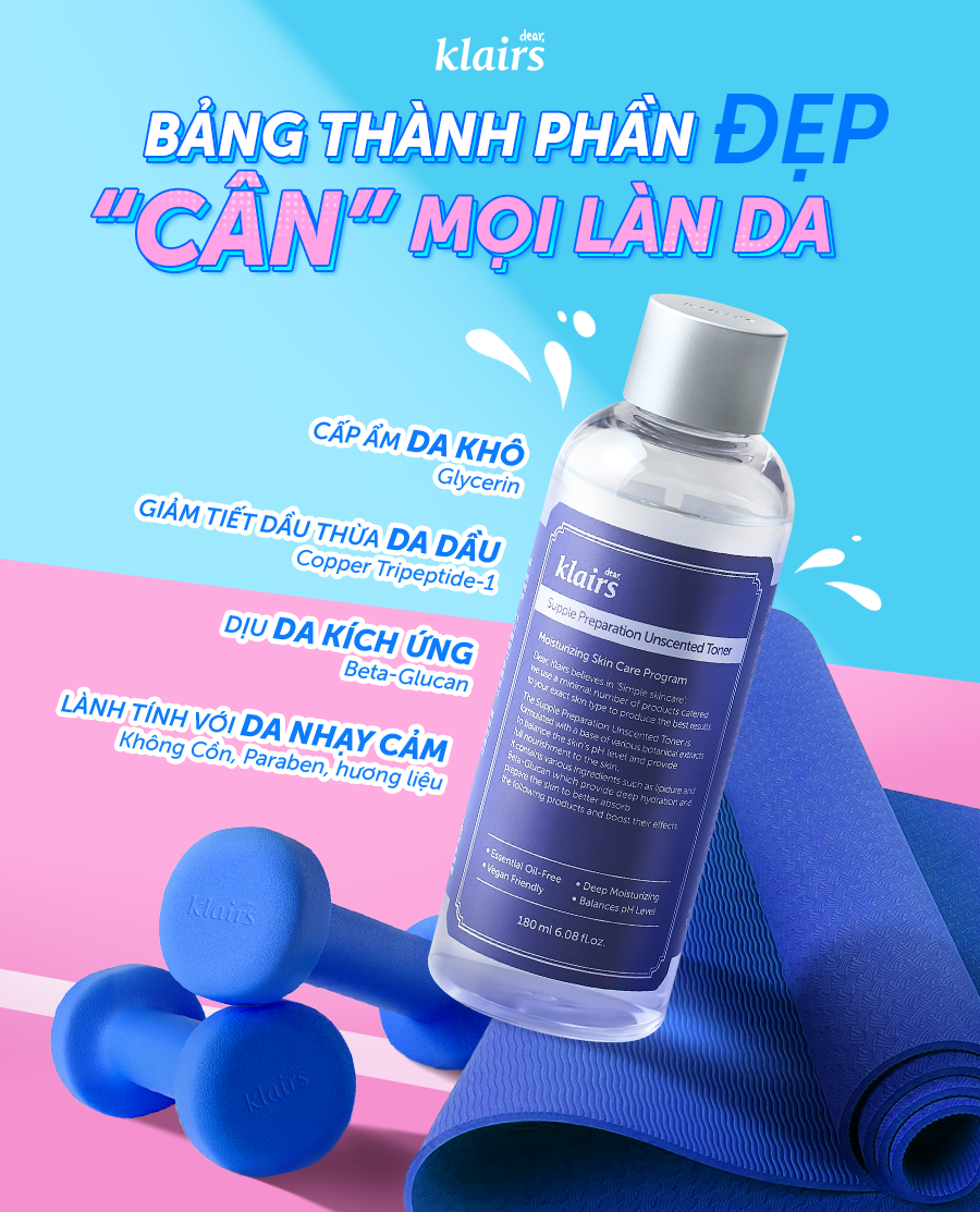 - Nước Hoa Hồng Không Mùi Dưỡng Ẩm, Làm Dịu Da Klairs Supple Preparation Unscented Toner công thức chứa Phyto-Oligo là tế bào gốc thực vật chứa rất nhiều yếu tố tăng trưởng có vai trò giúp dưỡng ẩm toàn diện cho da và giải quyết tình trạng khô da, và các axit amin trong lúa mì giúp giảm viêm nhiễm và cung cấp độ ẩm sâu vào da. Kết hợp cùng hoạt chất Properies giúp kháng viêm, giảm mụn hiệu quả.