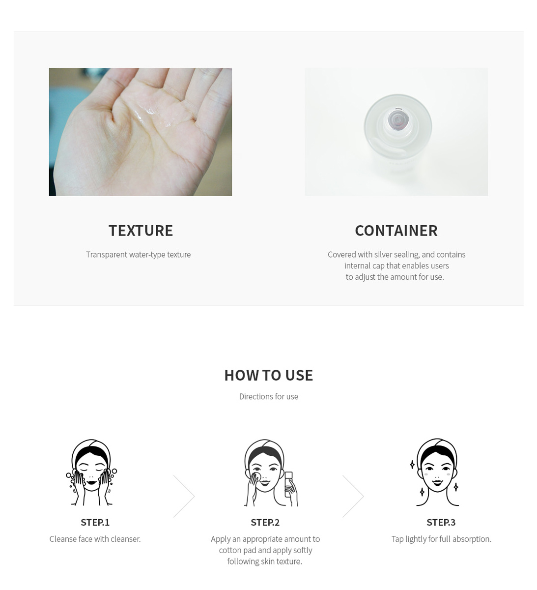 - Kết cấu Toner trong suốt và tinh khiết, lỏng nhẹ như nước, dễ dàng hấp thụ và thấm nhanh vào da, giúp cấp ẩm cho làn da thô sần và dưỡng ẩm từ sâu bên trong da.