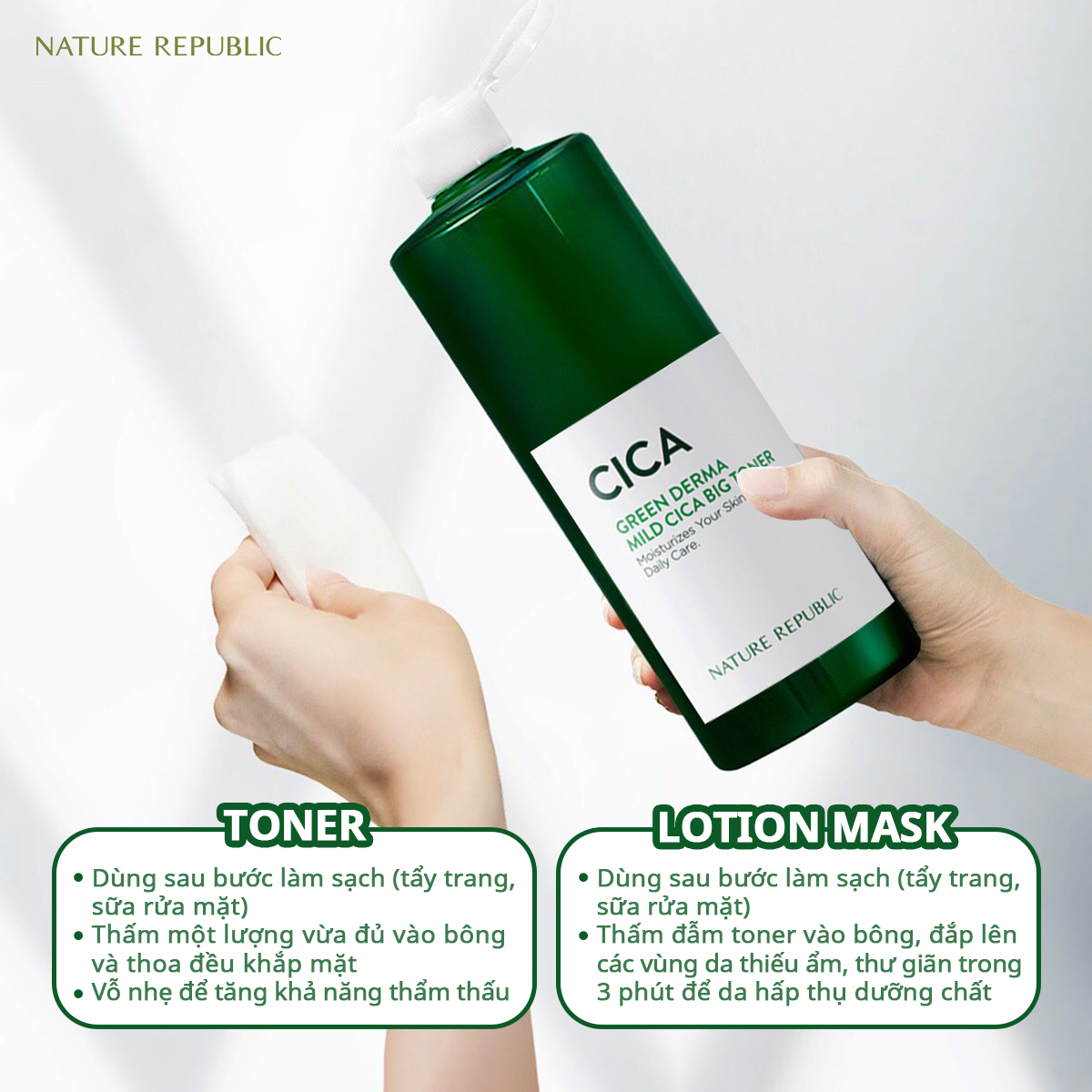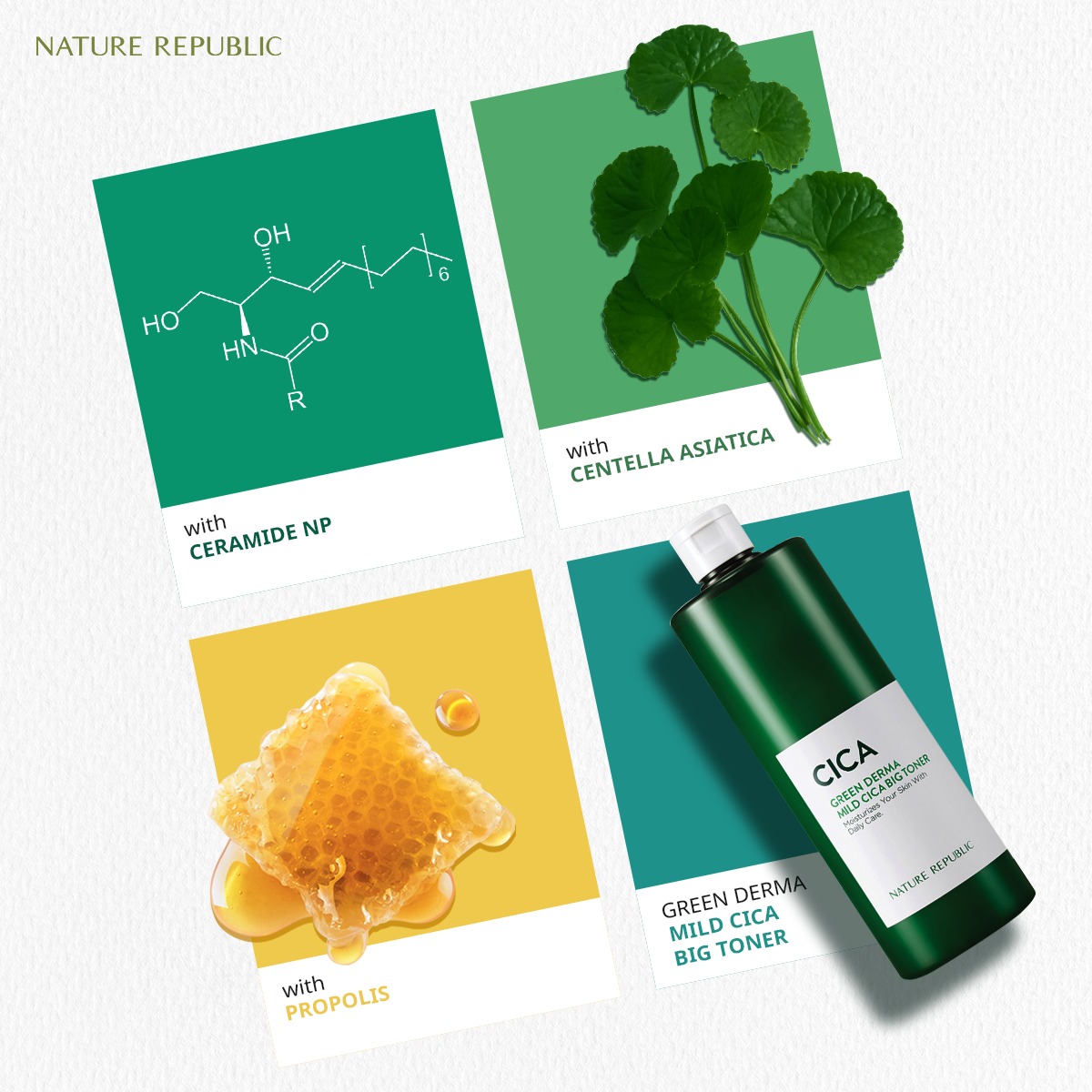 Nước Cân Bằng Nature Republic Green Derma Mild Cica Big Toner đến từ thương hiệu Nature Republic là sản phẩm toner dành cho những làn da cực kì nhạy cảm, da bị tổn thương, da khô. Công thức chứa thành phần chiết xuất từ rau má và keo ong có khả năng cung cấp độ ẩm dồi dào, đồng thời làm dịu da, giảm các biểu hiện kích ứng hay sưng tấy đỏ do mụn, nuôi dưỡng cho làn da trở nên mềm mại, mịn màng và khoẻ mạnh hơn.