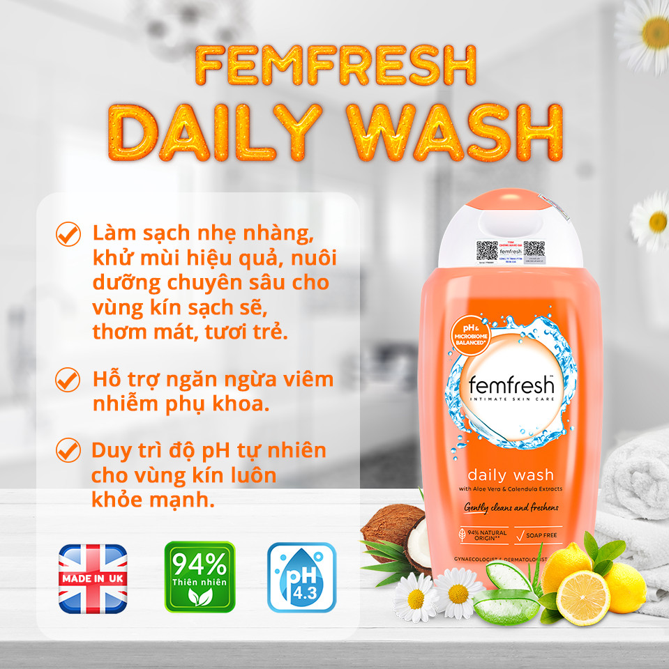 Dung Dịch Vệ Sinh Phụ Nữ Dưỡng Ẩm Cân Bằng Độ pH Femfresh Daily Intimate Wash là dung dịch vệ sinh thuộc thương hiệu Femfresh với các thành phần chiết xuất tự nhiên lành tính như Cúc La Mã, Lô Hội, dầu dừa, tinh dầu thơm giúp làm sạch, khử mùi vùng kín một cách nhẹ nhàng, tạo hương thơm mát suốt cả ngày. Ngoài ra còn bổ sung chiết xuất chanh vàng và Glycerin giúp tăng cường khả năng kháng khuẩn và kháng viêm.