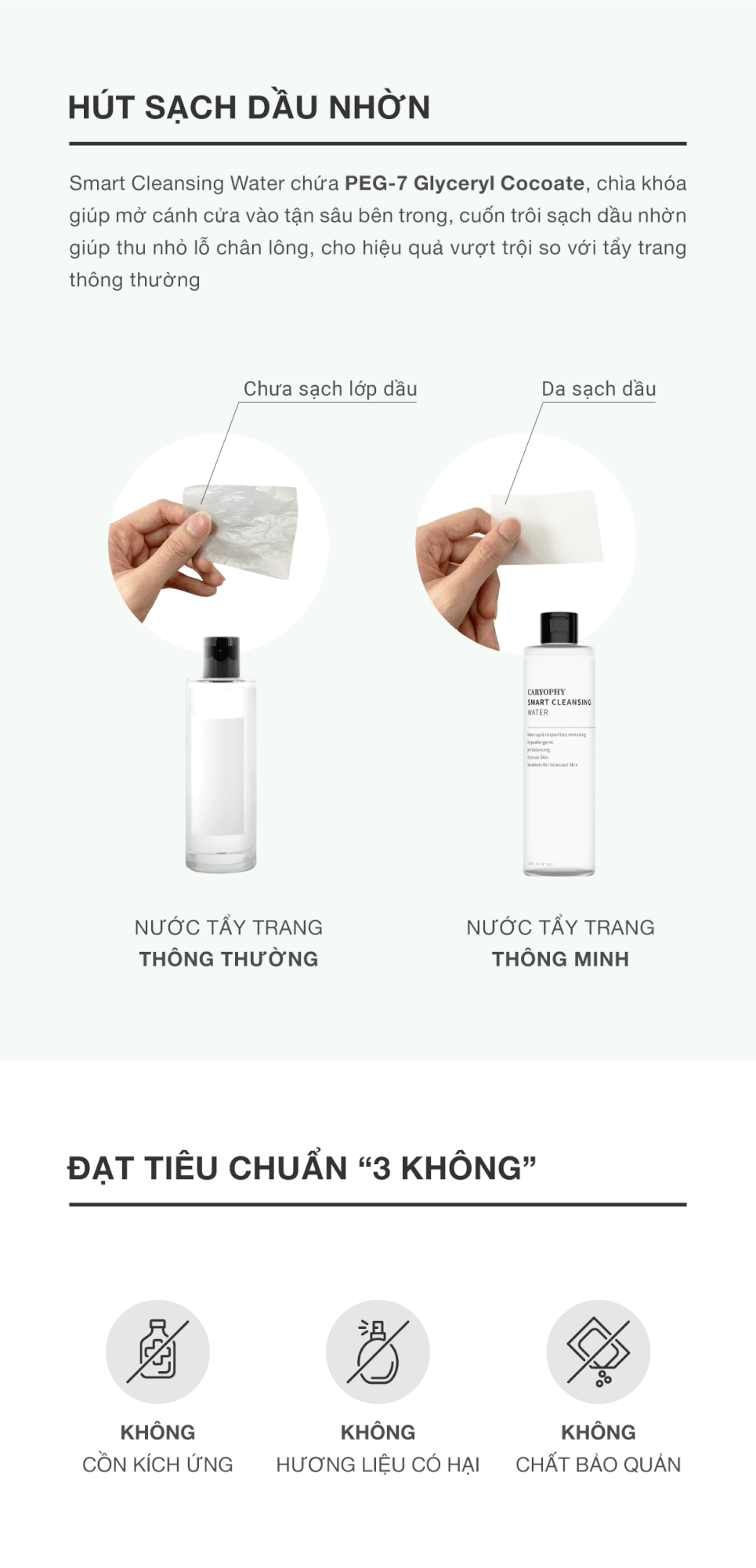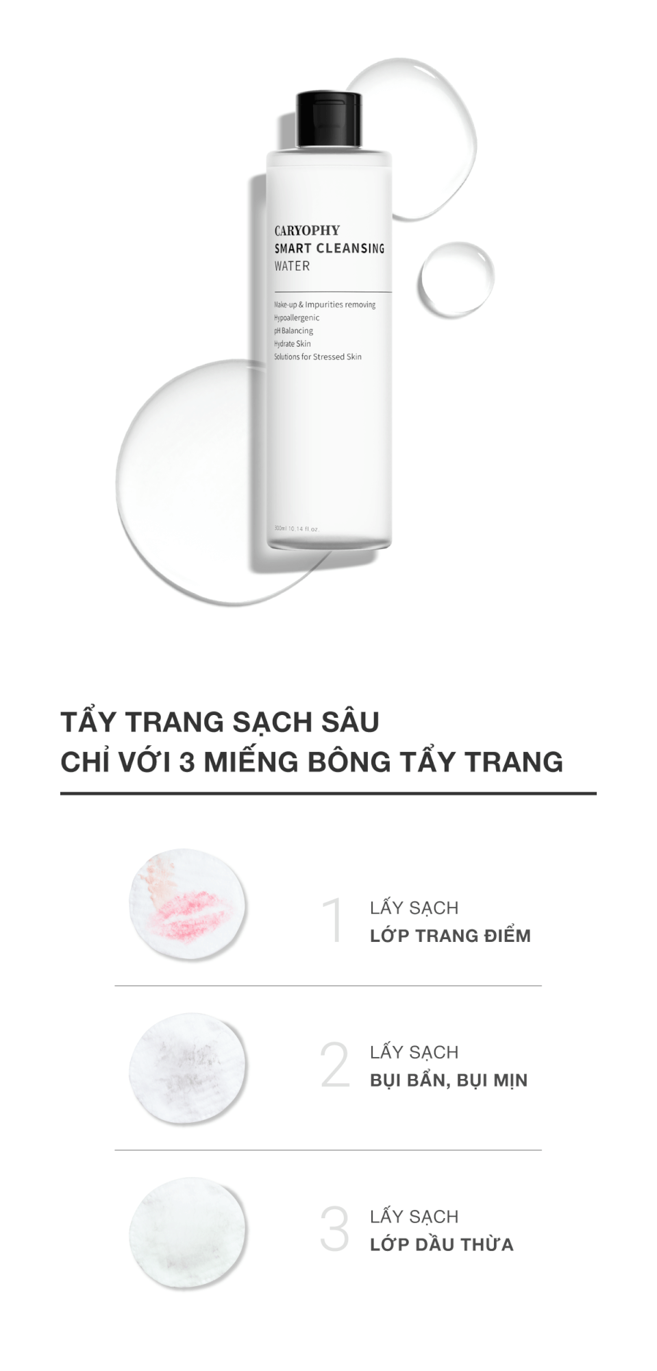 Nước Tẩy Trang Caryophy Smart Cleansing Water là sản phẩm tẩy trang làm sạch dành cho da dầu mụn và da nhạy cảm thuộc thương hiệu Caryophy (Hàn Quốc). Công thức sản phẩm an toàn & lành tính, dịu nhẹ cho làn da nhạy cảm, với các chiết xuất thiên nhiên như Rau Sam, Rau Má và thành phần độc đáo Citric Acid giúp làm sạch da tối ưu và hỗ trợ kháng khuẩn, kháng viêm, ngăn ngừa mụn và làm dịu da, giải tỏa căng thẳng trên da.