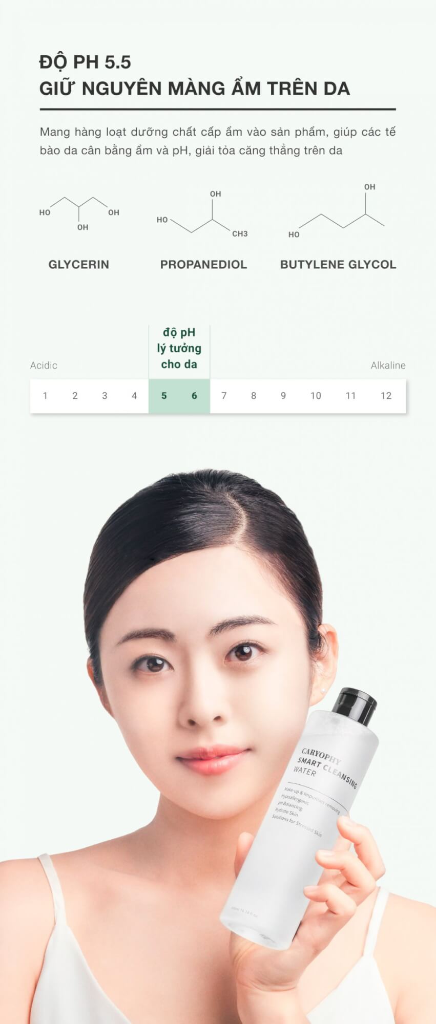 - Nước Tẩy Trang Caryophy Smart Cleansing Water với thành phần là chiết xuất rau Sam chứa giàu các chất dinh dưỡng và hợp chất chống lão hóa, có đặc tính chống viêm, chống oxy hóa, làm se và chữa lành vết thương, giúp đẩy nhanh quá trình chữa lành da bị tổn thương.
