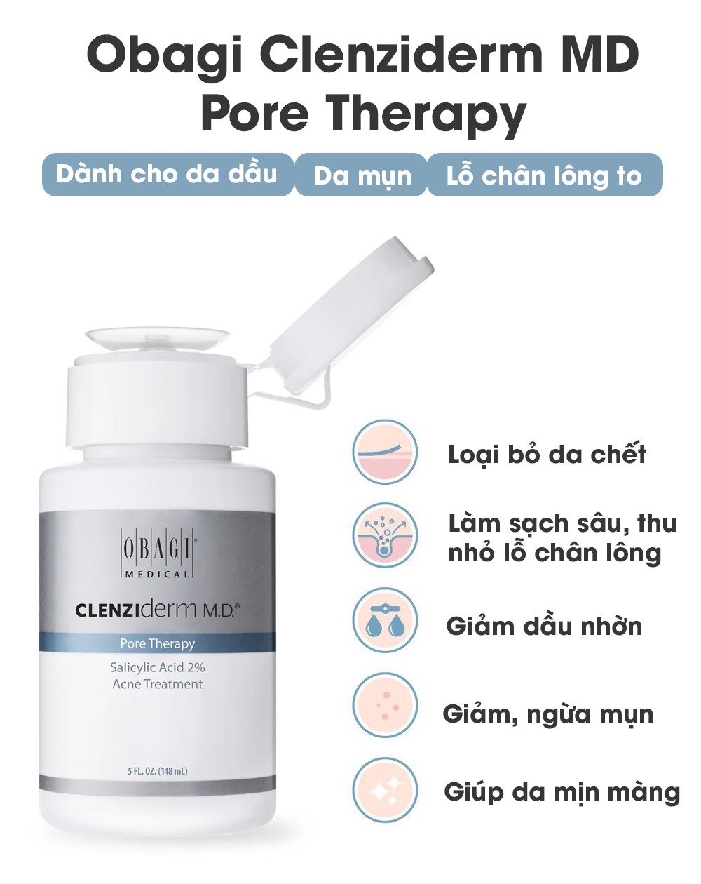 - Có tác dụng vượt trội trong việc loại bỏ nhẹ nhàng bụi bẩn, tế bào chết, dầu thừa còn tồn động trong lỗ chân lông và giúp kháng khuẩn, hỗ trợ điều trị cũng như ngăn ngừa mụn hình thành. Sản phẩm còn giúp cân bằng độ pH, dưỡng ẩm chuyên sâu cho da, chống lão hóa và cải thiện cấu trúc da. Những thành phần dưỡng chất có trong tinh chất Obagi Medical Clenziderm M.D Pore Therapy đều đã được các chuyên gia da liễu hàng đầu tại Obagi Medical chọn lọc kĩ lưỡng không lẫn tạp chất an toàn cho làn da người dùng.