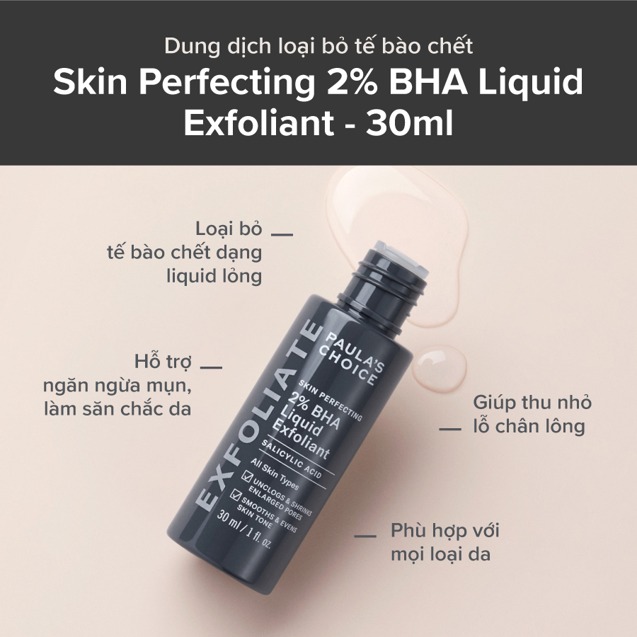 Dung Dịch Loại Bỏ Tế Bào Chết Paula’s Choice Skin Perfecting 2% BHA Liquid Exfoliant đến từ thương hiệu dược mỹ phẩm Paula's Choice nổi tiếng của Mỹ là sản phẩm tẩy tế bào chết hóa học với nồng độ 2% BHA (Salicylic Acid) giúp làm sạch sâu lỗ chân lông, cải thiện tình trạng mụn ẩn - mụn đầu đen, đồng thời làm mờ nếp nhăn sâu, cải thiện tông màu da, mang lại cho bạn làn da sáng mịn, rạng rỡ và khỏe mạnh. Công thức sản phẩm dịu nhẹ, không gây bào mòn da, dễ dàng thẩm thấu mà không làm bít tắc lỗ chân lông.
