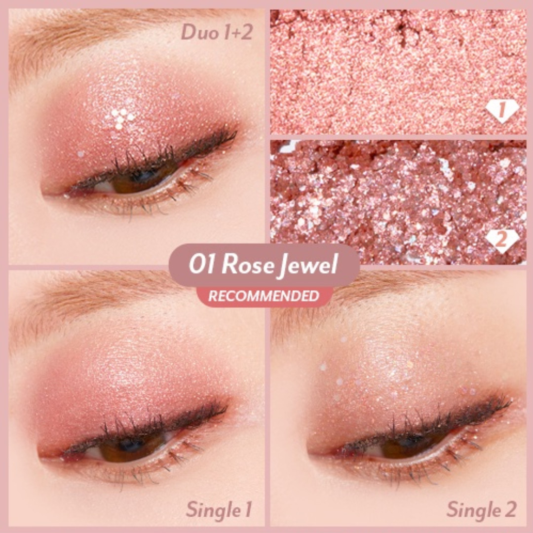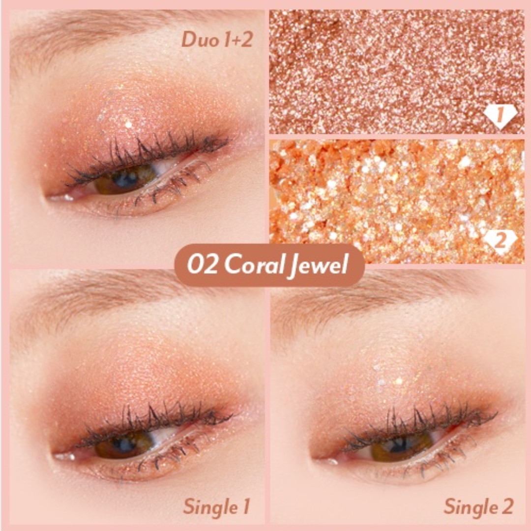 - Có thể sử dụng I'm Meme Jewel Topping Glitter Duo 3g như phấn mắt đơn lẻ hoặc kết hợp với các màu phấn mắt khác để tạo hiệu ứng trang điểm đa dạng.