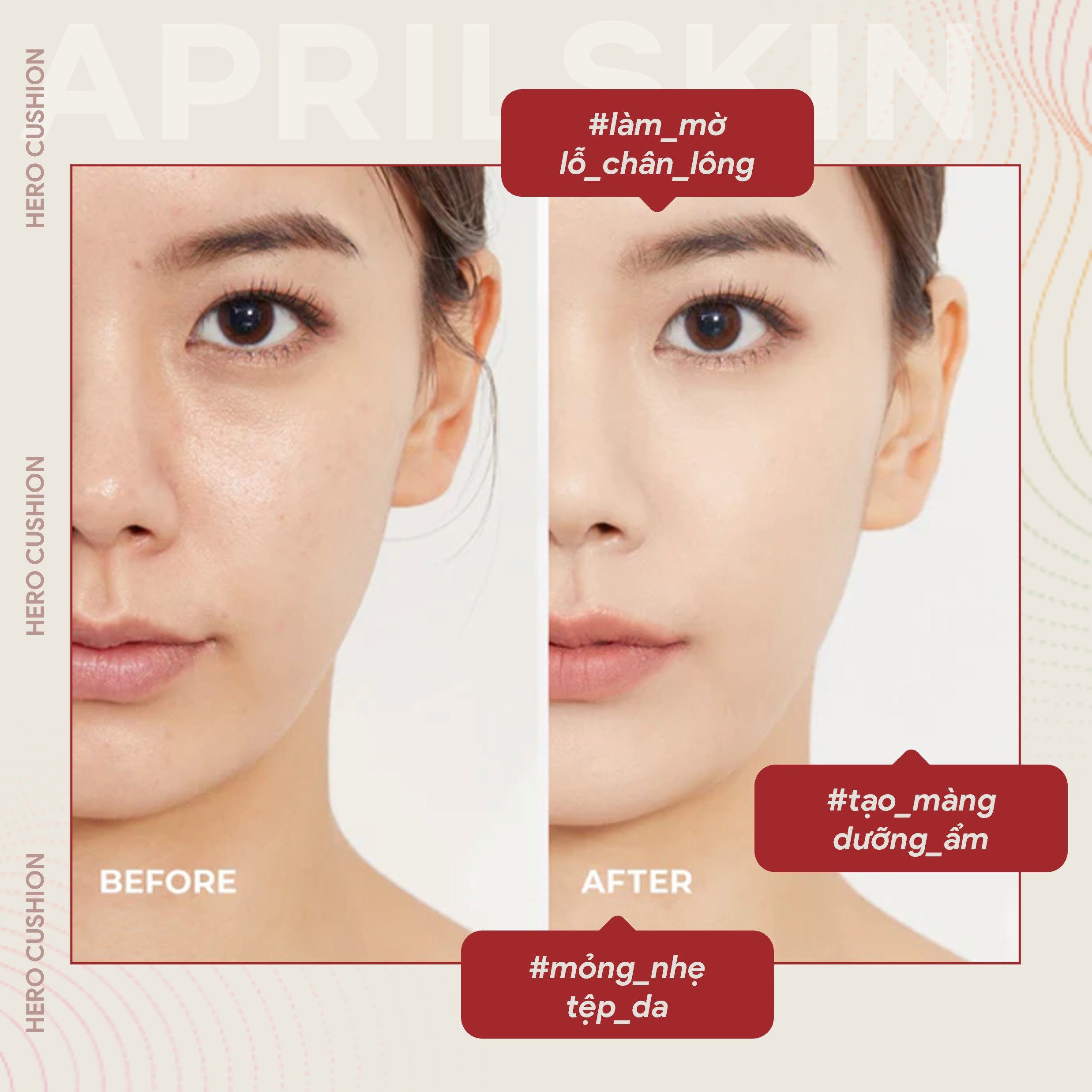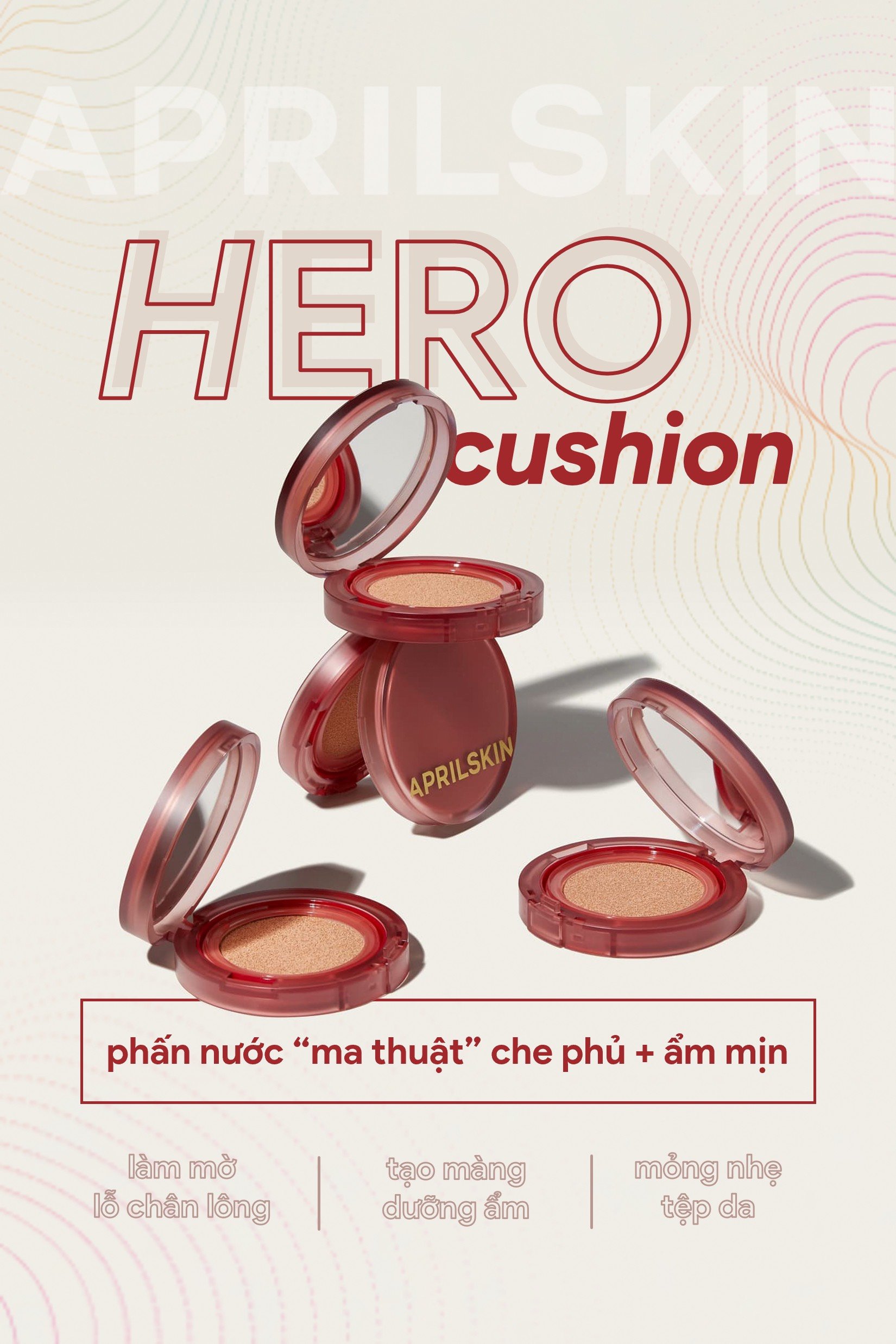 - Che phủ mọi khuyết điểm như mụn, thâm, lỗ chân lông to... April Skin Hero Cushion giúp bền màu, tăng cường độ bền màu suốt cả ngày mang đến làn da trắng sáng.