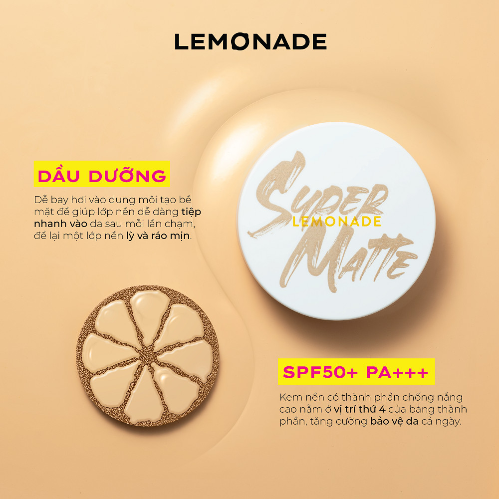 Phấn Nước Kiềm Dầu, Che Phủ Tốt Lemonade Supper Matte Cushion là phấn nước đến từ thương hiệu Lemonade là phấn nước dành cho làn da dầu, da siêu dầu và da dầu mụn, nhờ có lớp màng cực kỳ bền vững, kiểm soát dầu thừa hữu hiệu, hạn chế vỡ hay chảy nền do mồ hôi và bã nhờn dư thừa. Do đó, lớp nền của bạn sẽ bền chắc, ít xuống màu và lâu trôi.